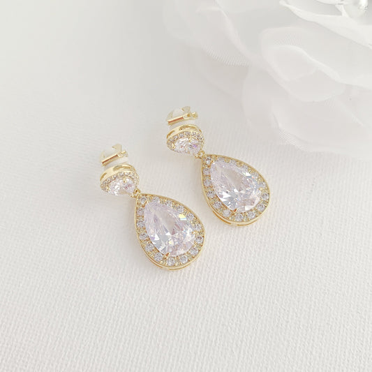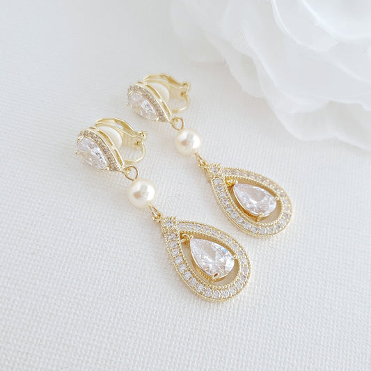 Gold Clip On Earrings in Teardrop CZ for Brides Bridesmaids-Emma