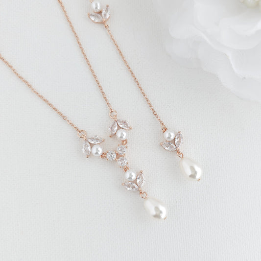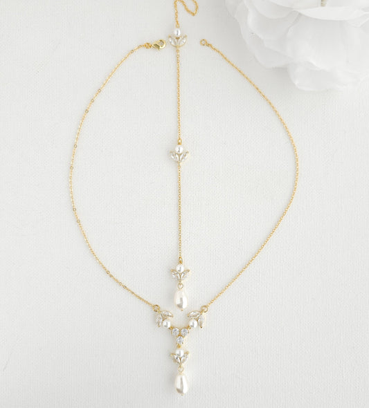 Simple Gold Back Drop Bridal Necklace with Pearl Crystal-Leila