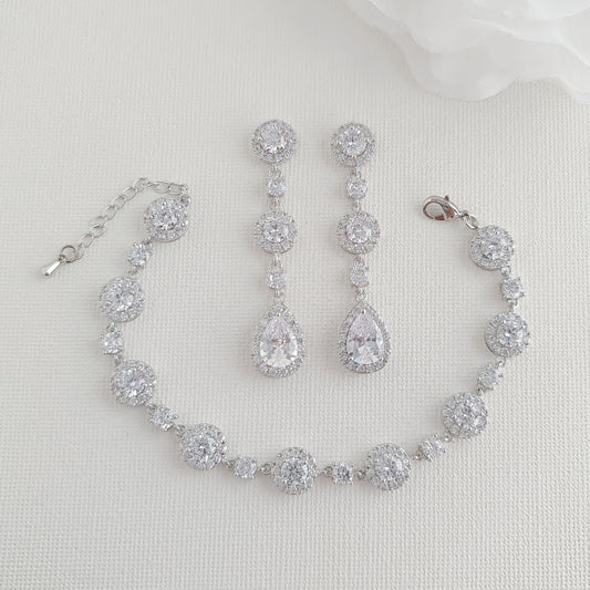 Round Halo CZ Bracelet and Earrings Set for Brides-Reagan