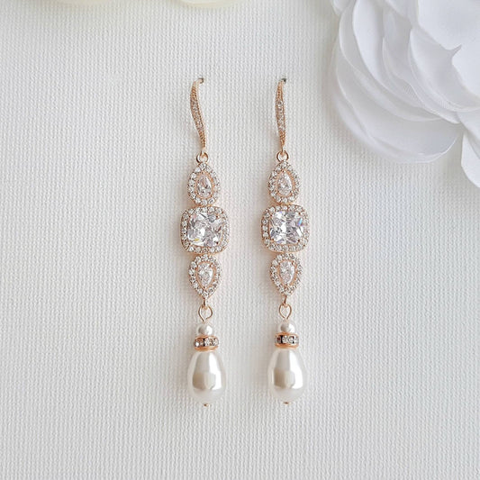 Rose Gold & Pearl Wedding Drop Earrings-Ella