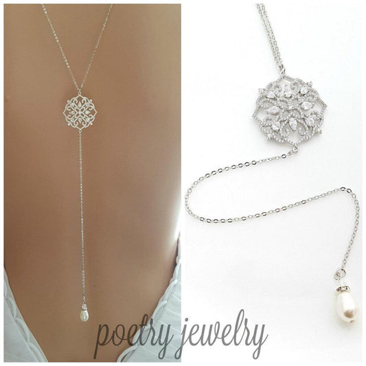 Long Back Necklace for Wedding, Prom, Event Backless Dresses-Sadie