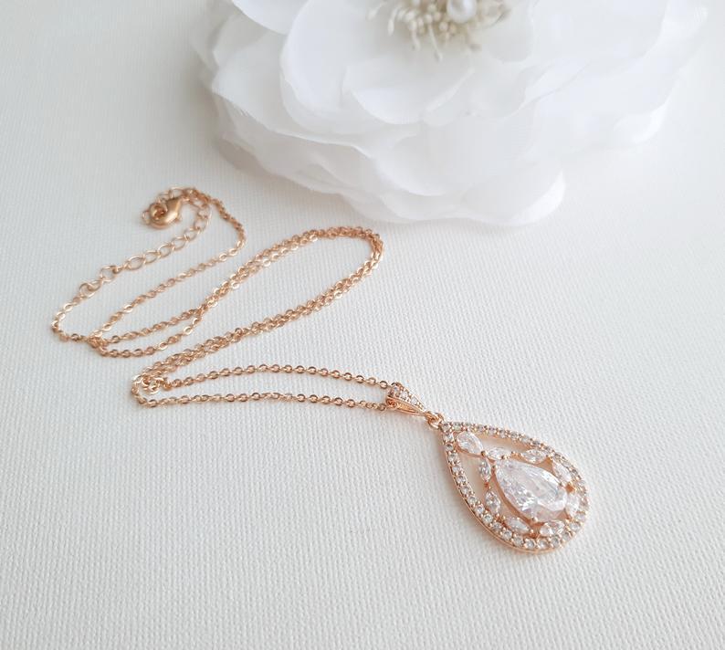 Bridal Pendant Necklace with Teardrop CZ Crystals-Esther