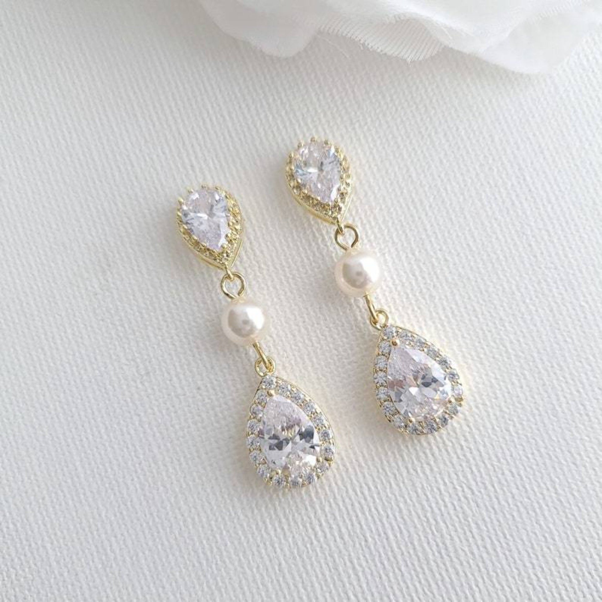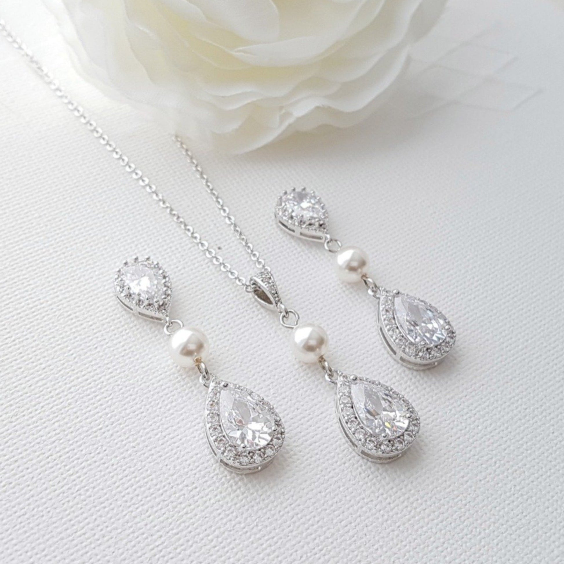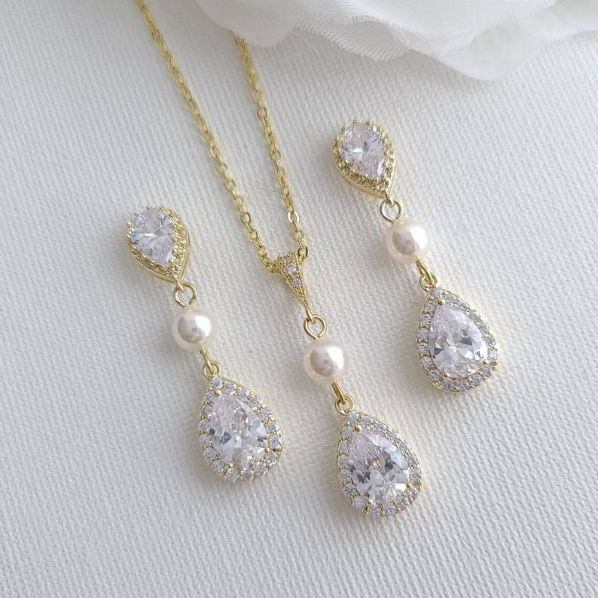 The jewelry set is rose gold plated with cubic zirconia and pearl combined to perfection. The drop earrings are small to midsized and comfortable to wear for both the brides and bridesmaids.