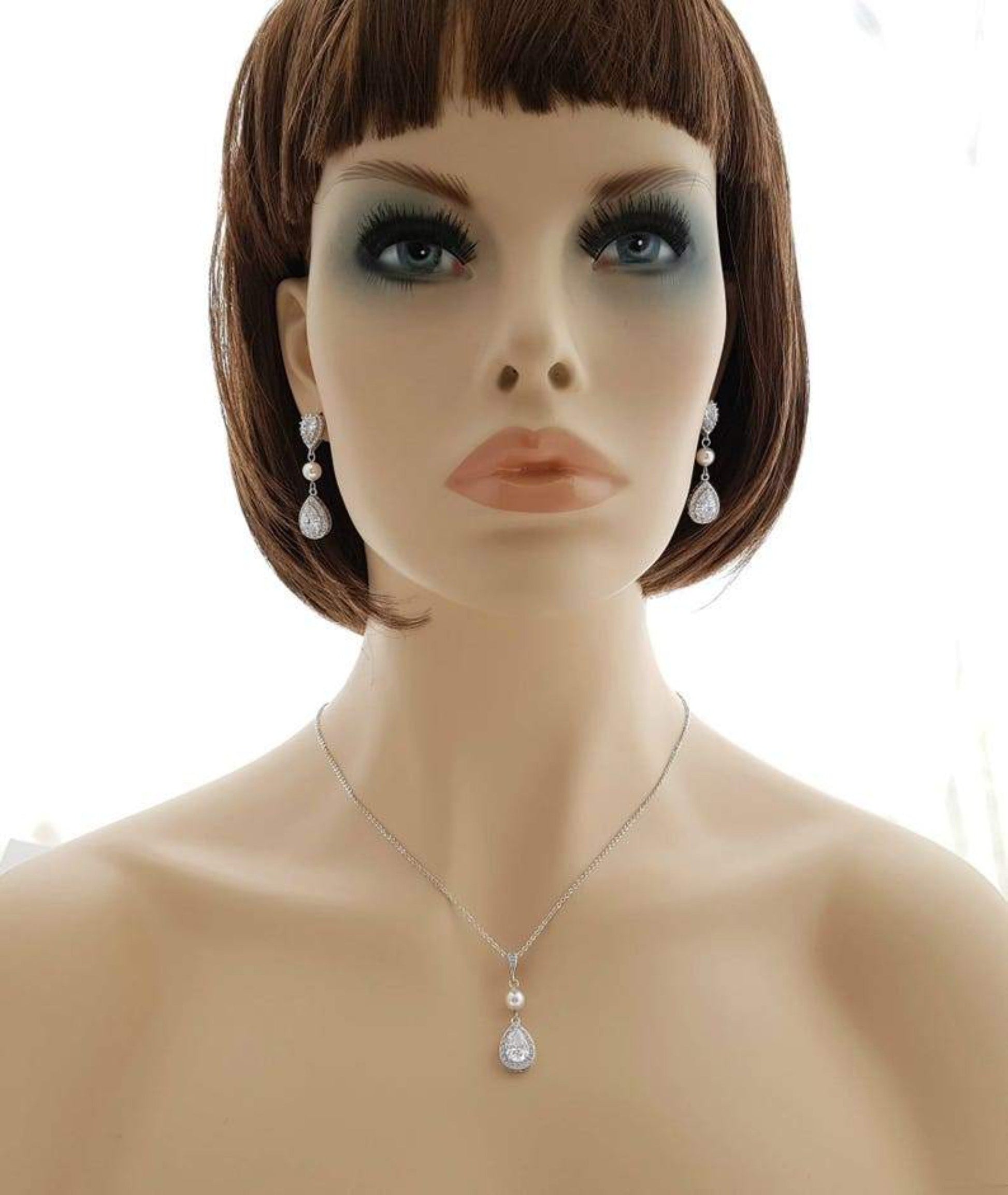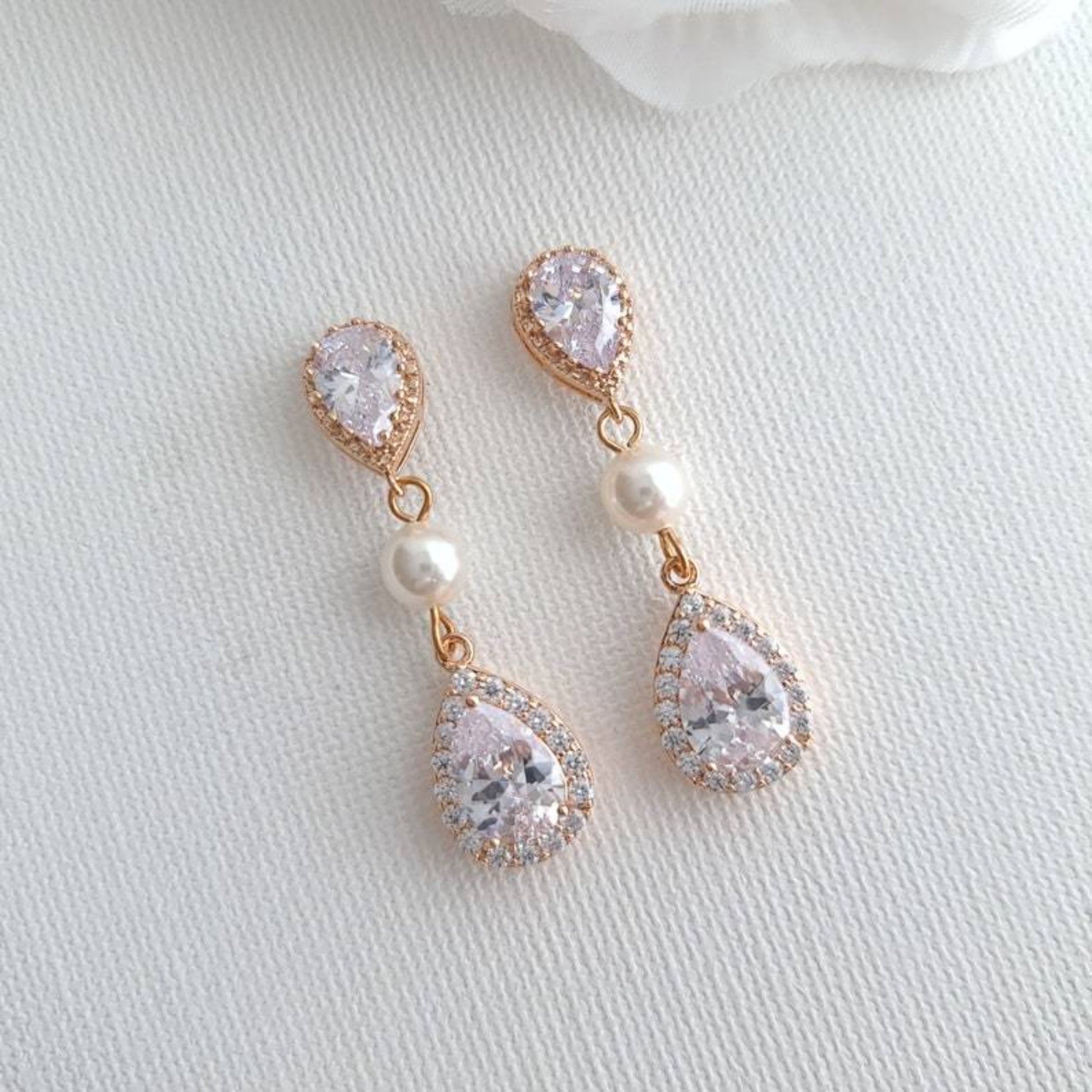 This is a beautiful jewelry set in rose gold for weddings, brides, bridesmaids with teardrop earrings, and necklace.