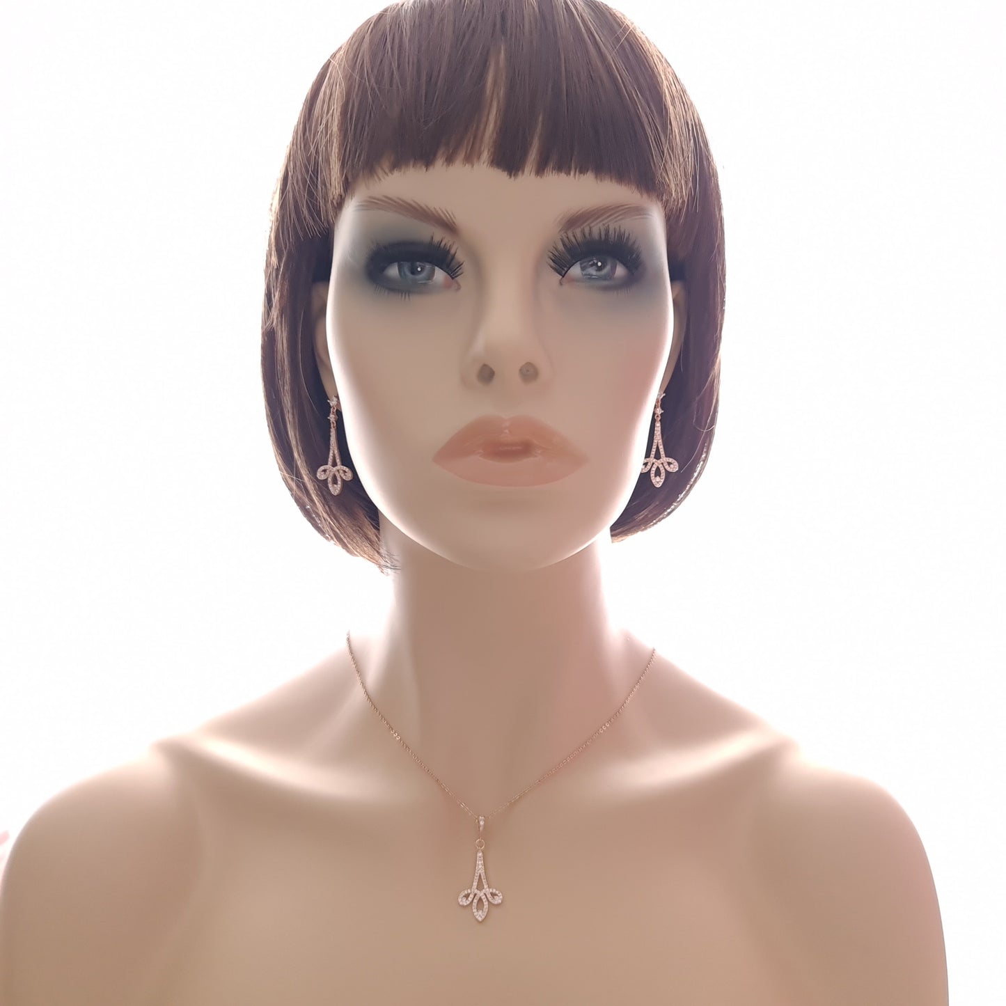Is your wedding day look contemporary? We have you covered, explore our modern rose gold wedding jewelry set created for brides & bridesmaids. Add to your trendy look with a swirl design long pendant and dangle earrings in rose gold color.