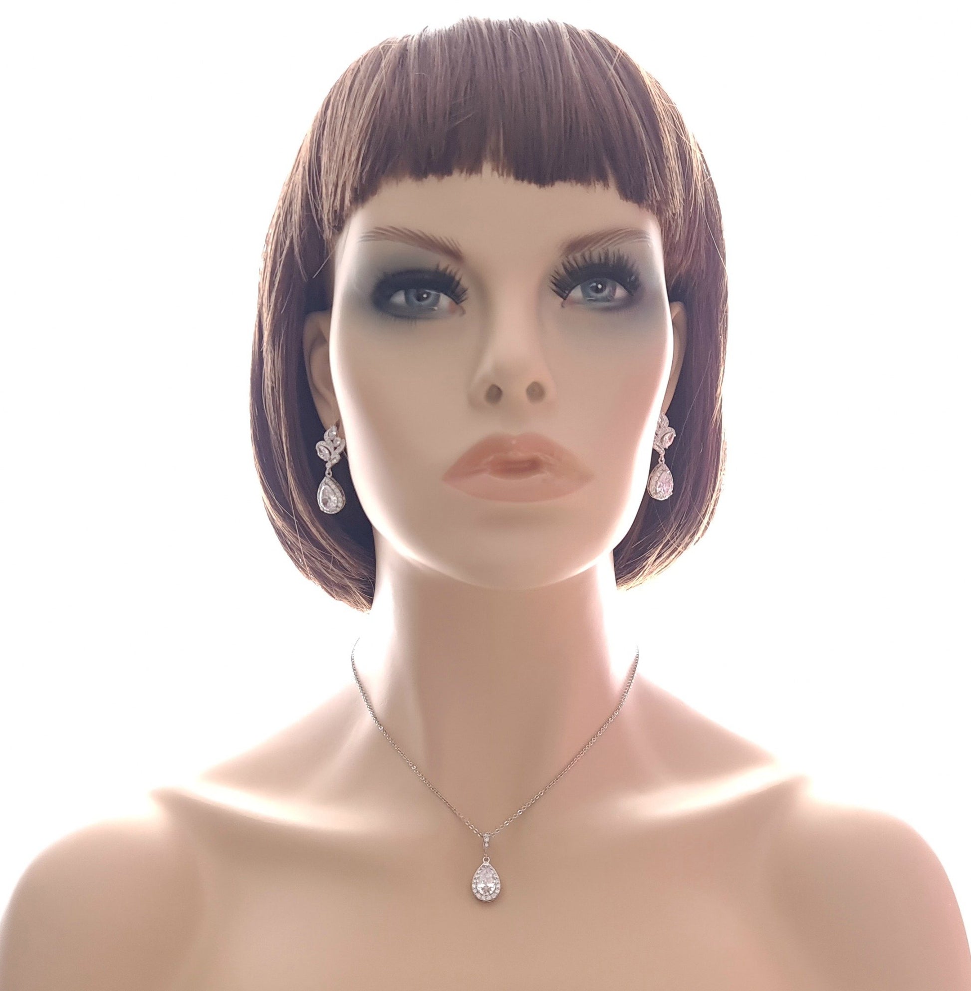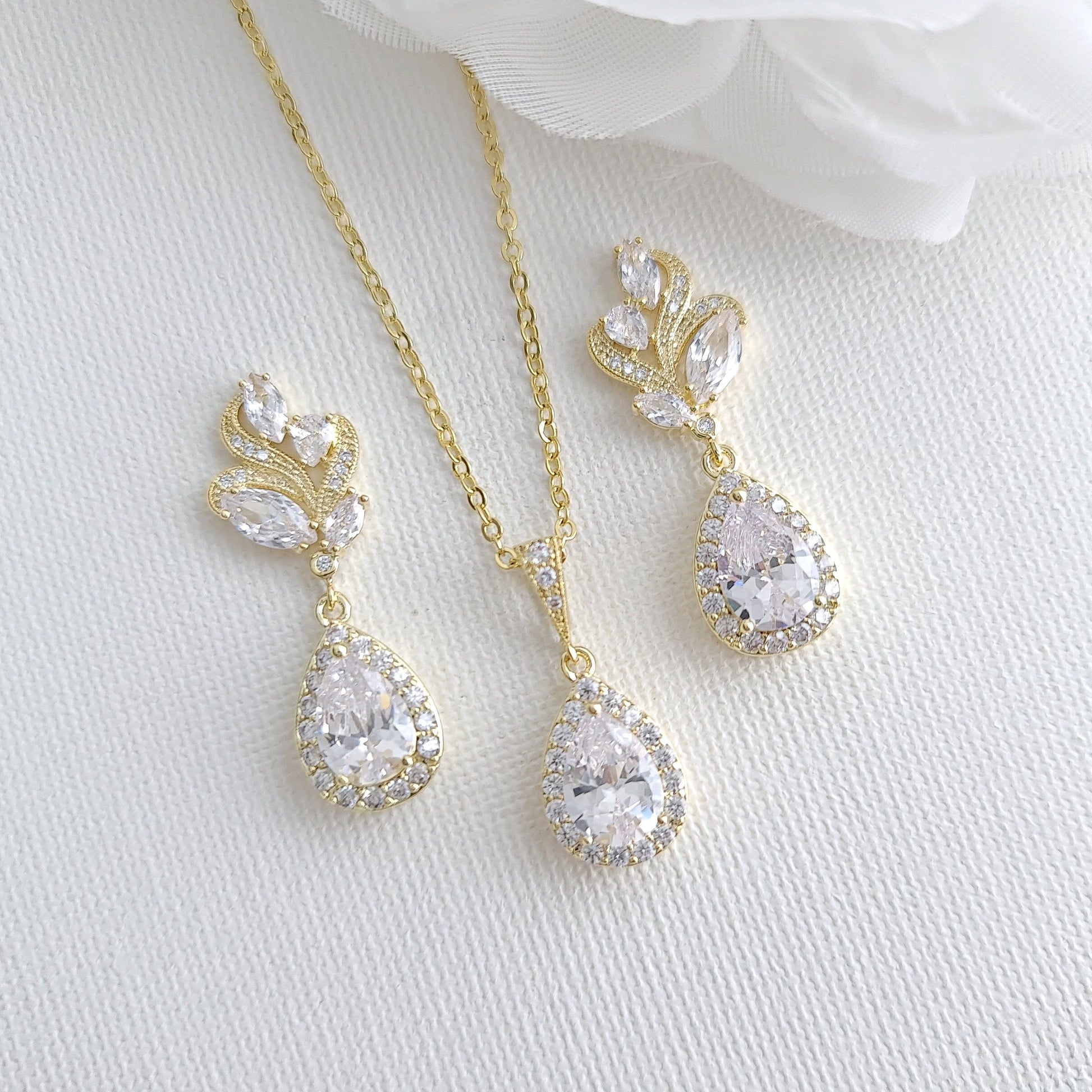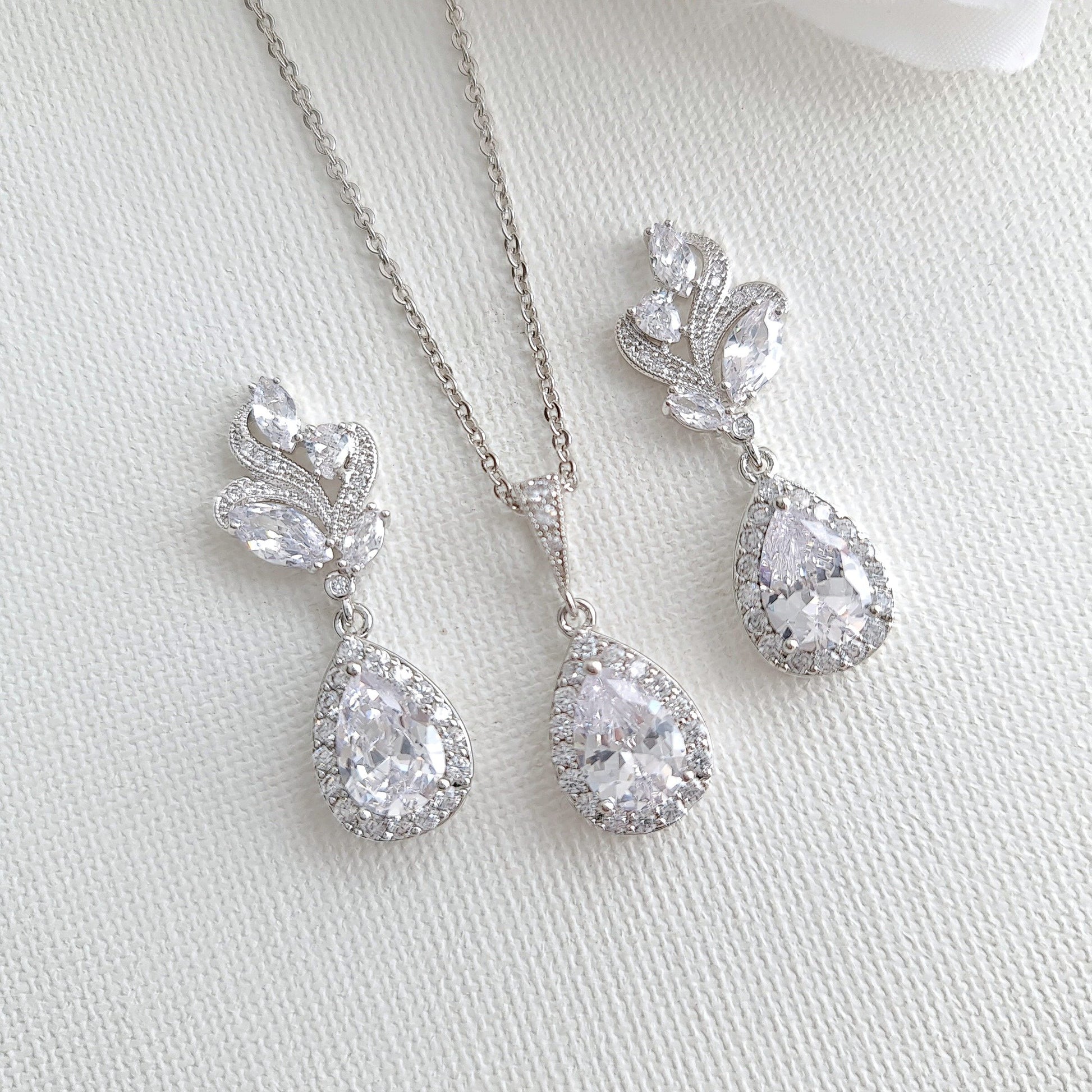 This rose gold wedding earring and necklace set is made of cubic zirconia, the necklace and earrings are available in three tones of gold, silver, and rose gold tones to match and suit your wedding day look.