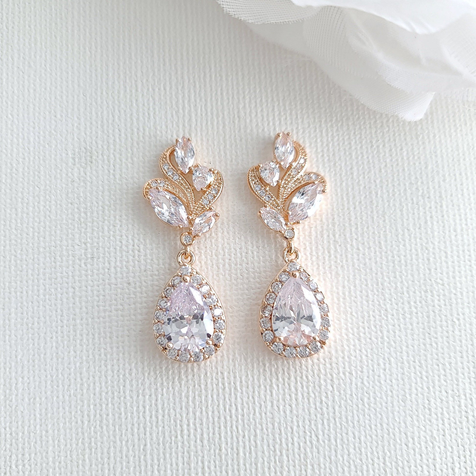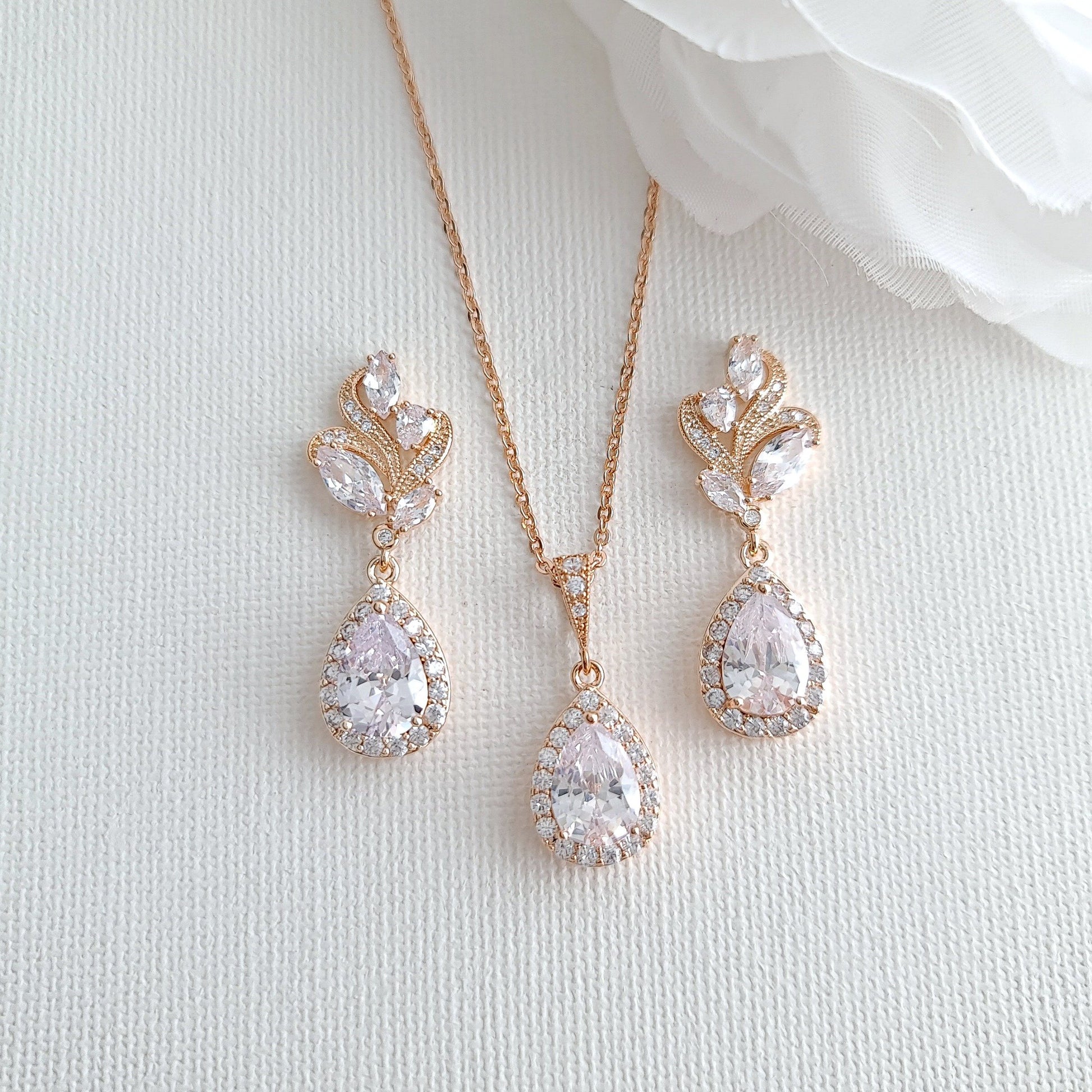 This lovely wedding jewelry set for a wedding in rose gold has the trendy look and is great for brides and bridesmaids. The rose gold jewelry set combined matching earrings and necklace ( two length options with extension chain)