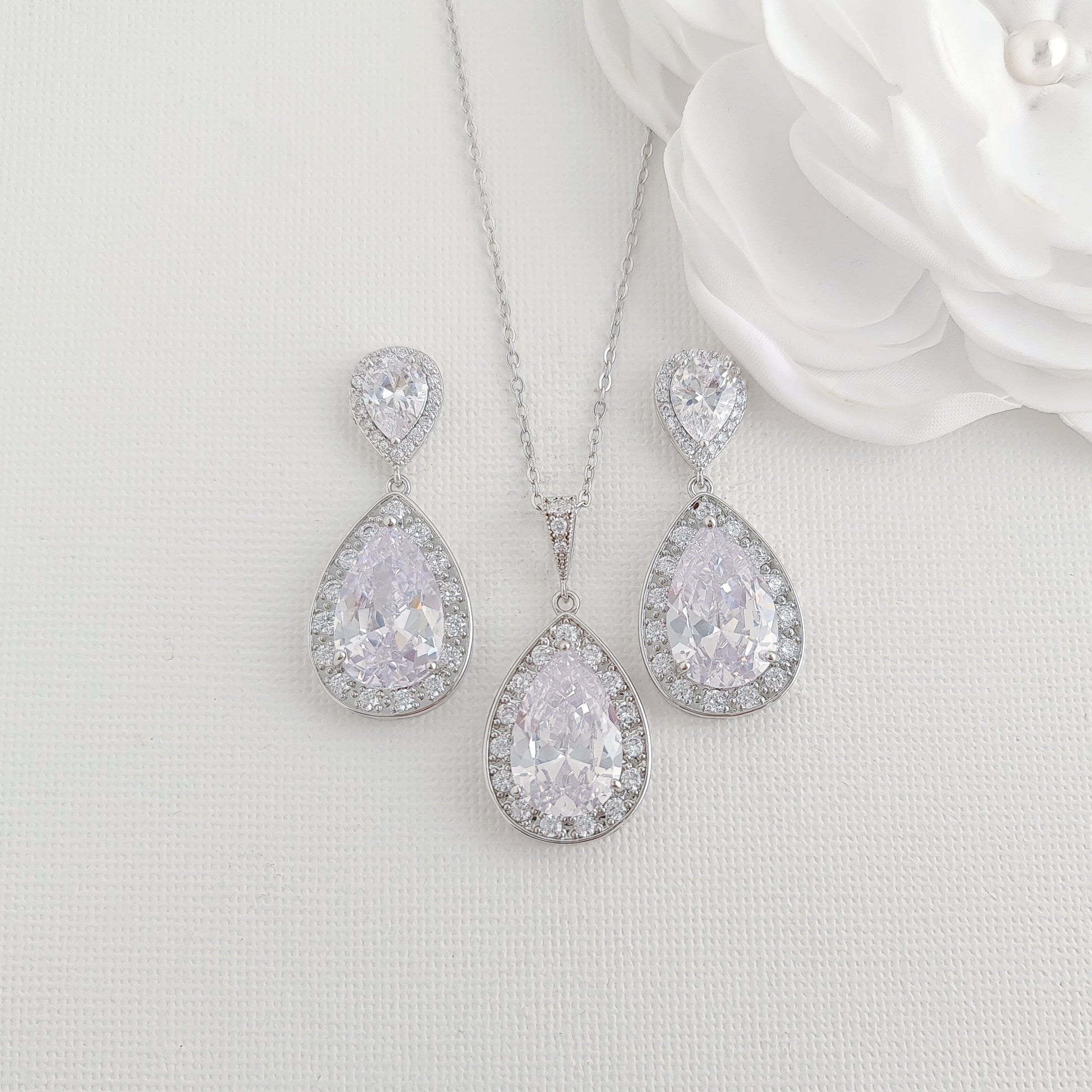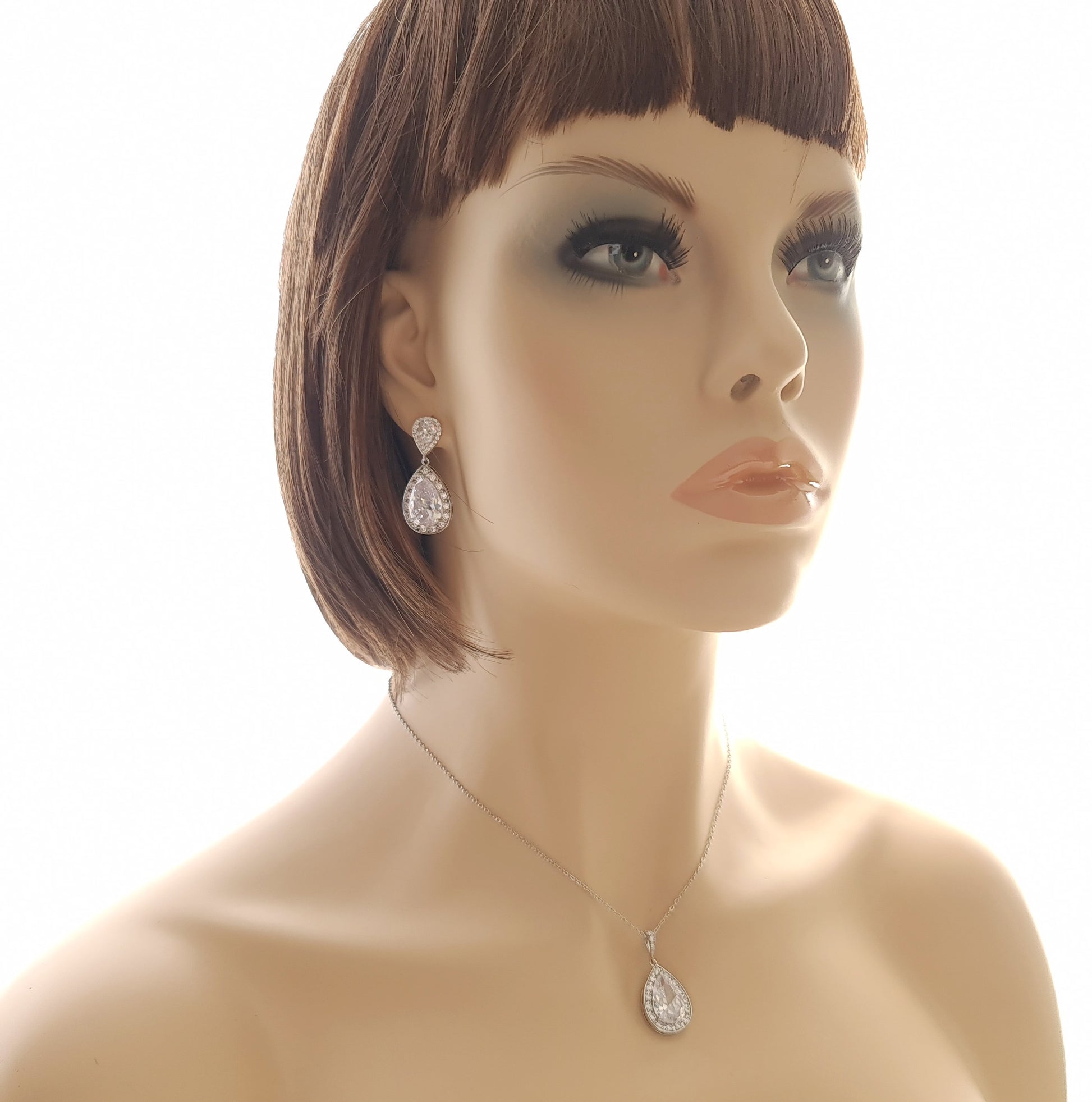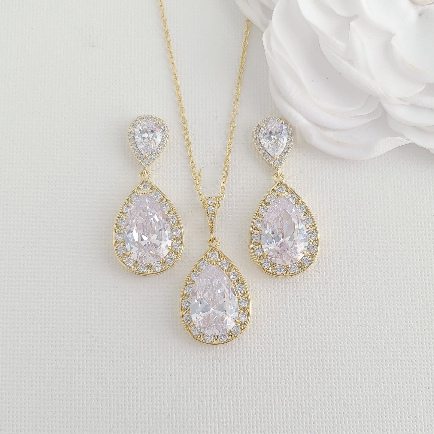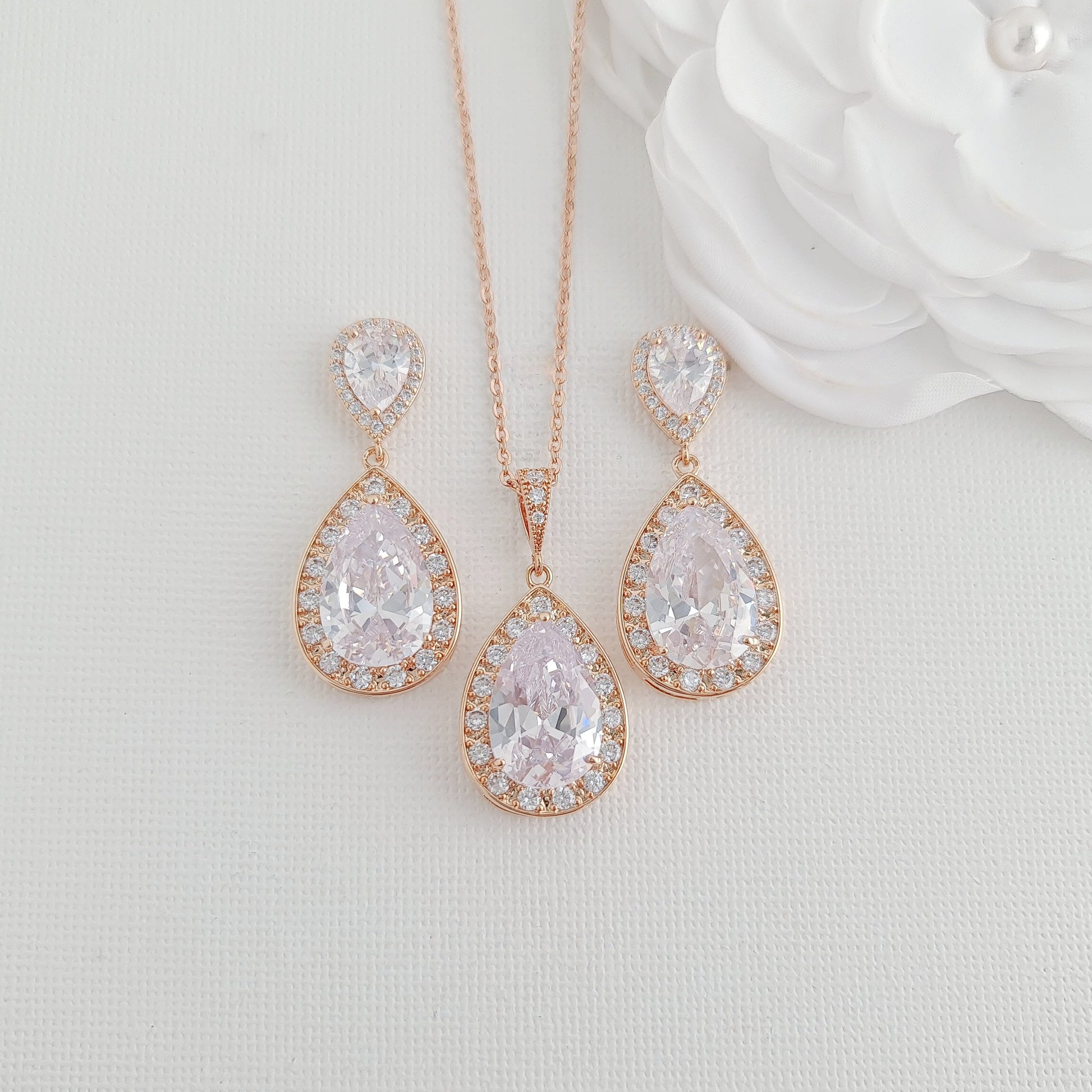 Rose Gold Bridal Jewelry Set with Teardrop Cubic Zirconia Earrings and Pendant Necklace