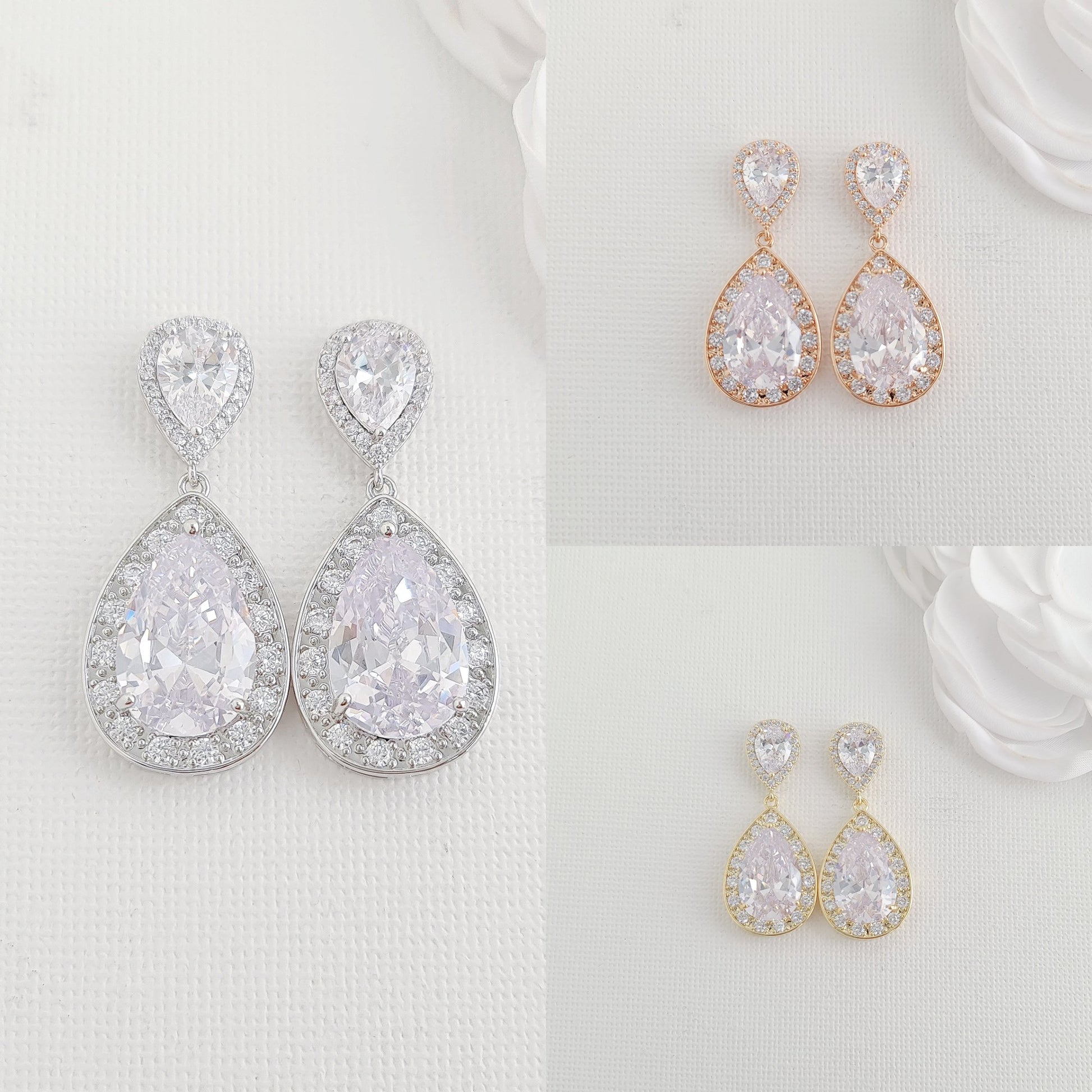 Teardrop Earrings: These beautiful earrings are comfortable to wear, The earrings are a great gift for brides, bridesmaids, gifts, women for weddings and all occasions. The open set cubic zirconia crystals sparkle in both natural light and more under lights. The ear post/ pins are made of stainless steel. Perfectly sized the earrings measure approx 1.5 inches or 3.8 cms