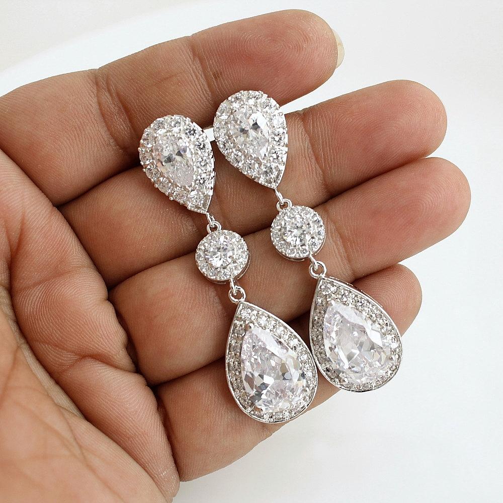Sparkly Long Big Earrings for Brides & Weddings Made of Large CZ Teardrops