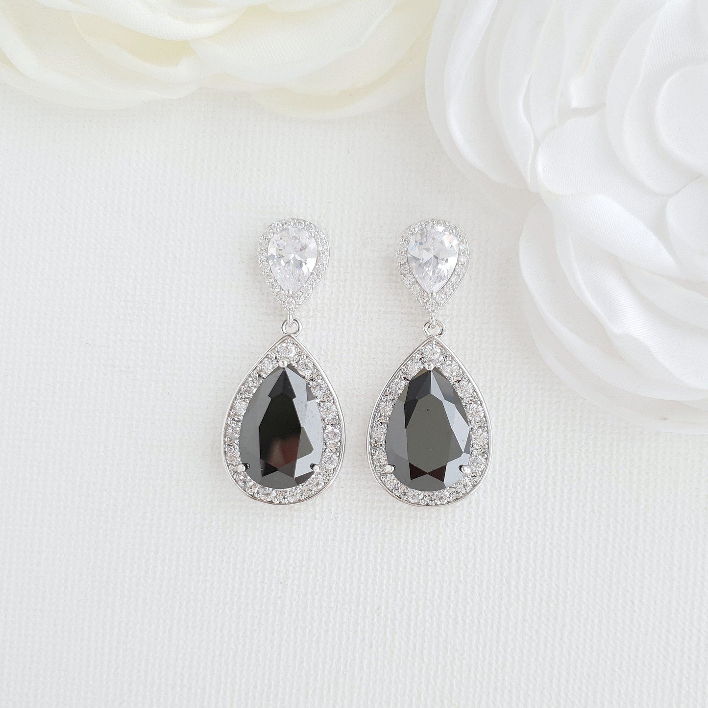 This beautiful gold and black drop earring are versatile, can be worn on several occasions and dinner party. These black earrings are made with sparkling clear teardrop cubic zirconia ear top with faceted black cubic zirconia drops in a pear shape. They are also available with a matching gold necklace pendant if you would like a complete set of earrings and necklace. This classic black and gold earrings, necklace, and sets are also available in three finishes of silver, gold and rose gold to pick from. If you have unpierced ears then we can also offer you clip-on earrings in this design and in the finish of your choice. The trendy black earrings are comfortable and lightweight in a shimmering gold design.