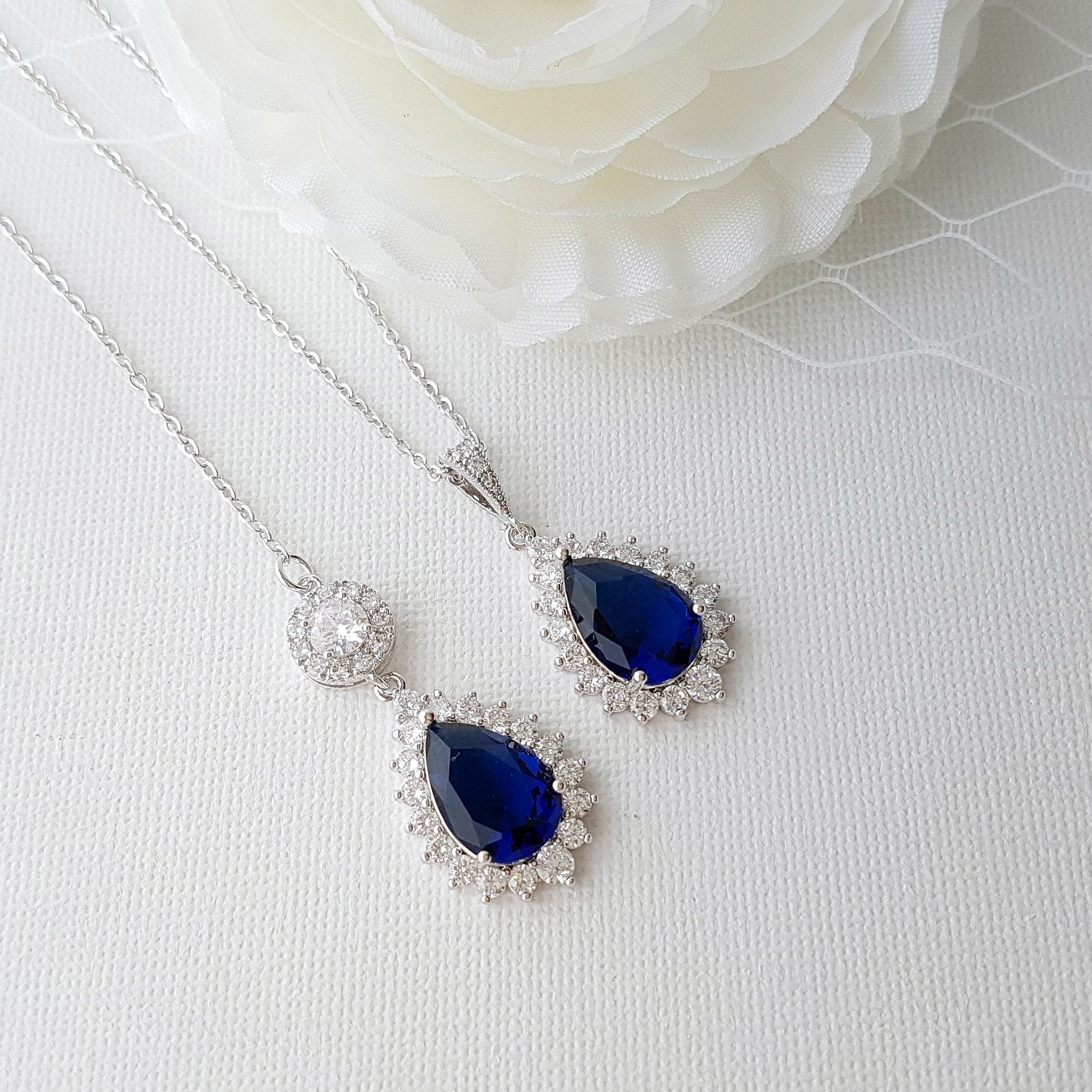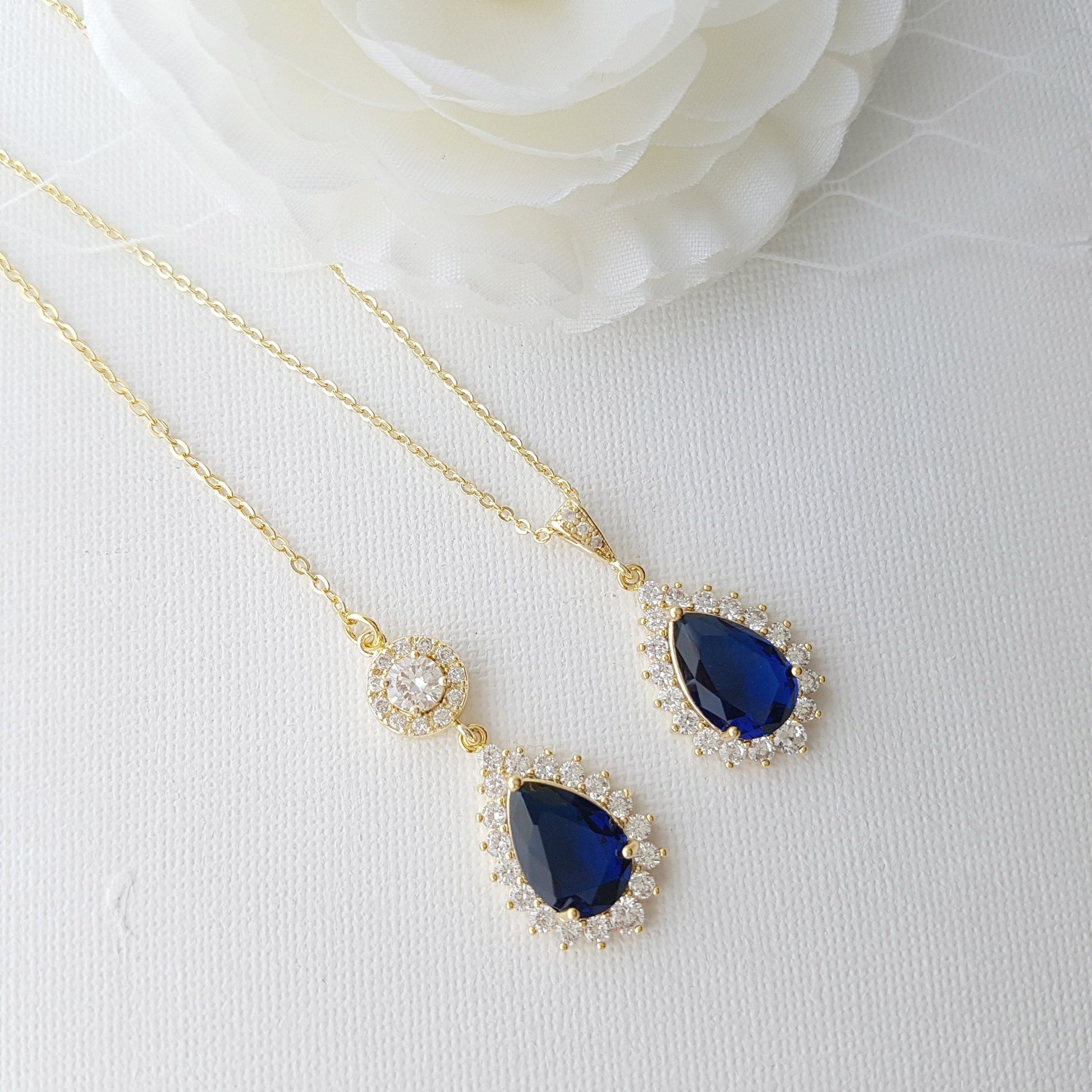 Looking to add something blue on your wedding day, here is a delicate blue bridal necklace in rose gold with a backdrop. This blue bridal necklace is made of sapphire blue teardrop cubic zirconia with rose gold-plated drops with a delicate chain. This bridal necklace with blue drops will add a sparkling look and is something blue on your wedding day look.