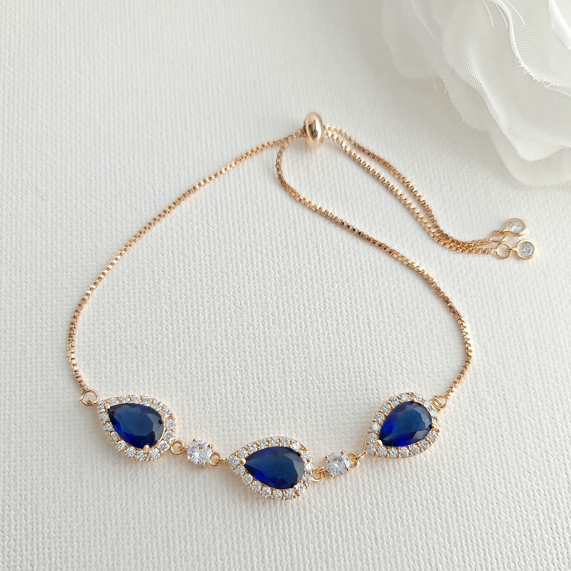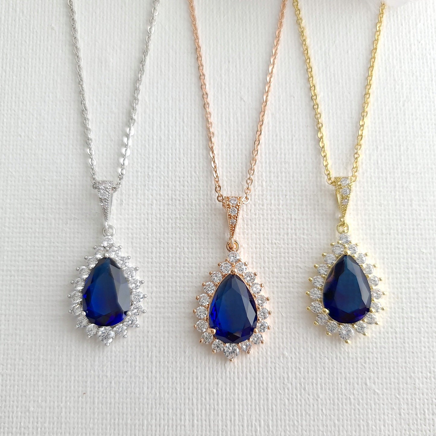 The blue jewelry set is made of sapphire blue cubic zirconia and rose gold plating on the metalwork. This blue jewelry is great for the bride, bridesmaids, and every woman looking for sapphire blue color jewelry with the contemporary rose gold combination. The jewelry set can also be purchased with silver, yellow gold tones to suit your style.
