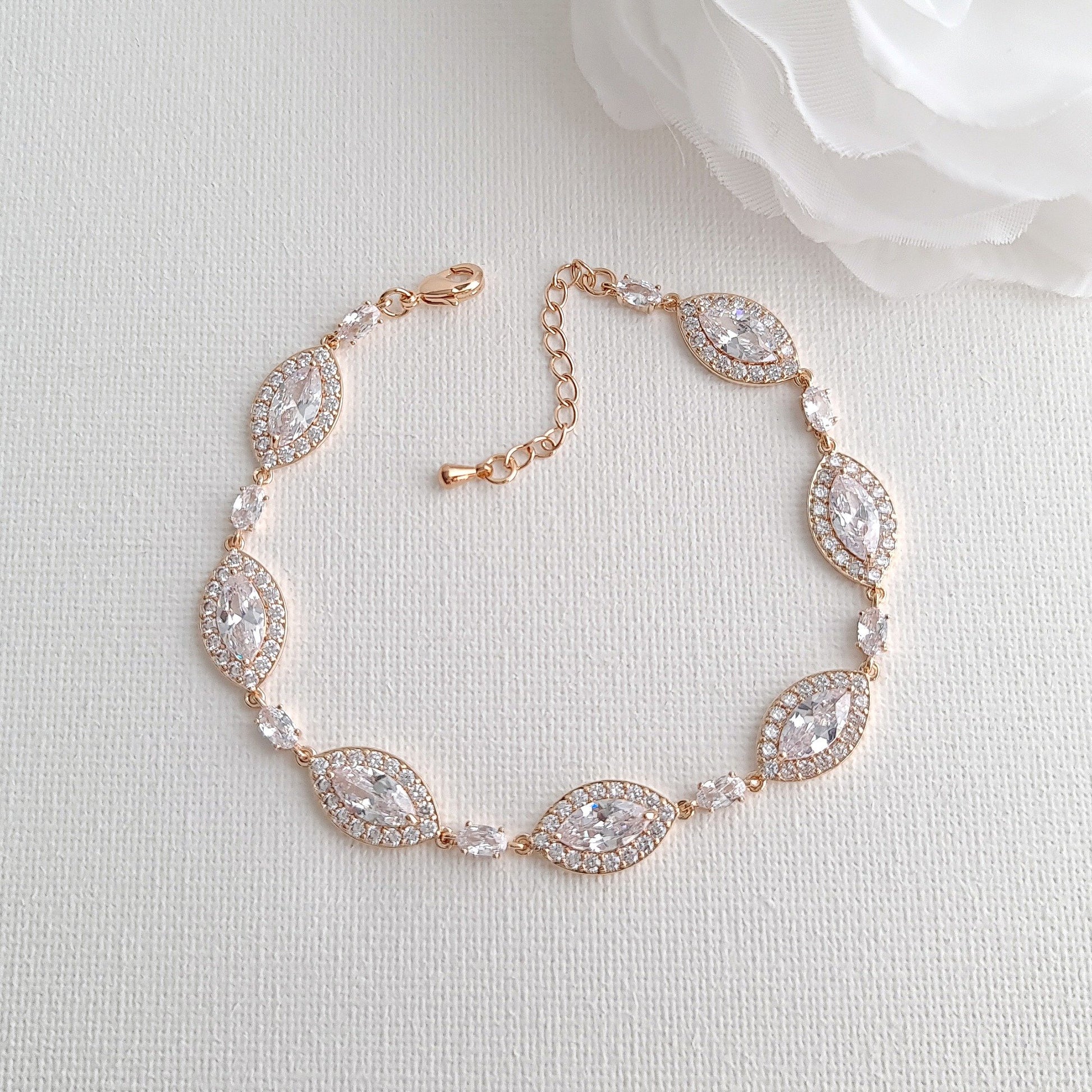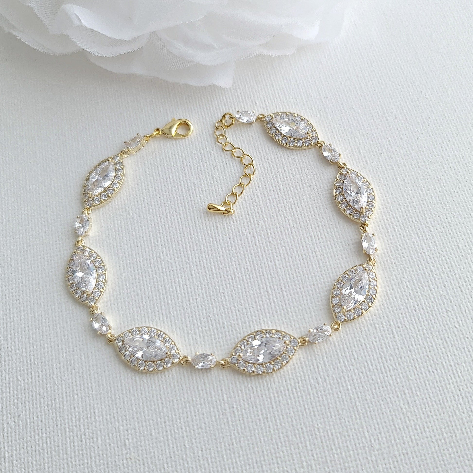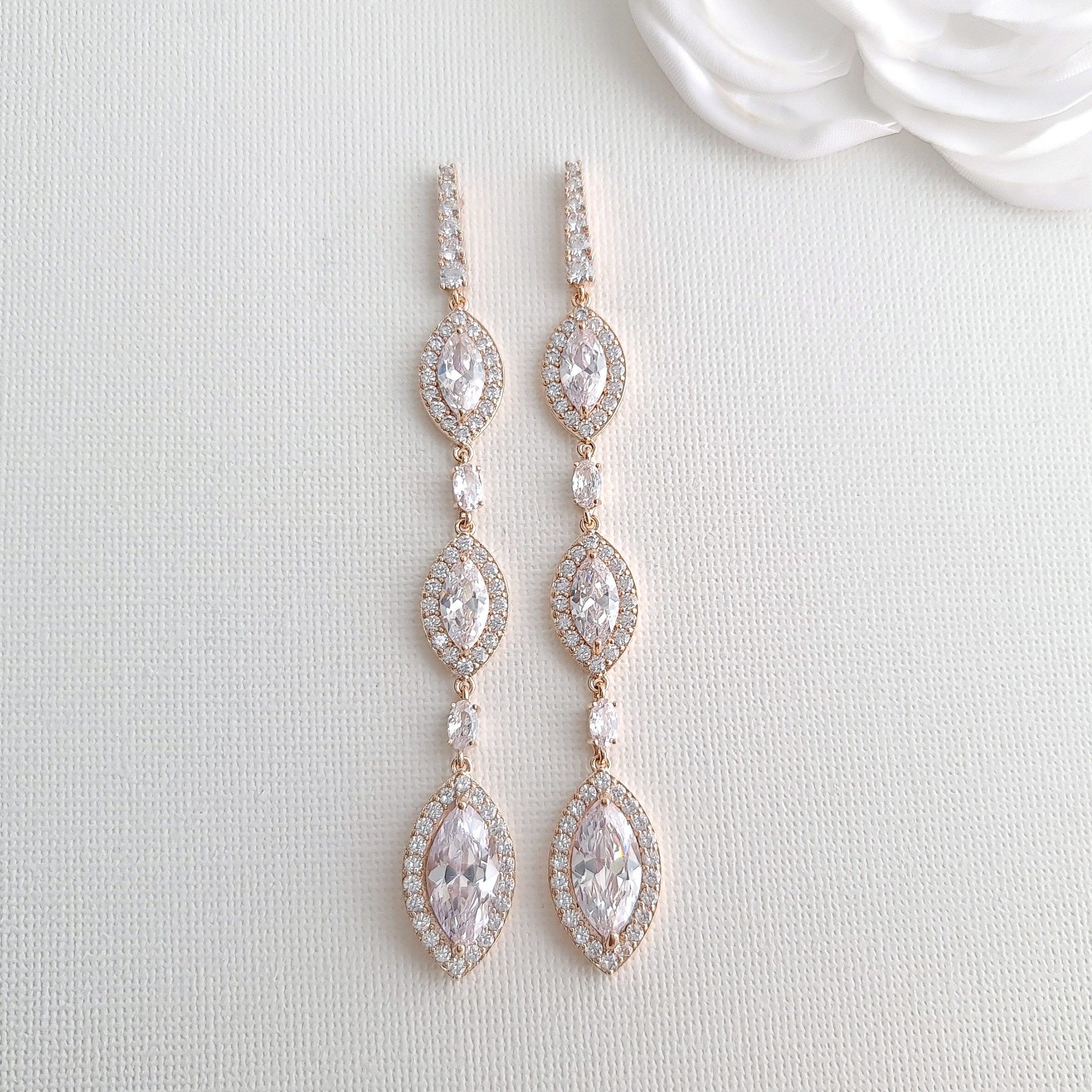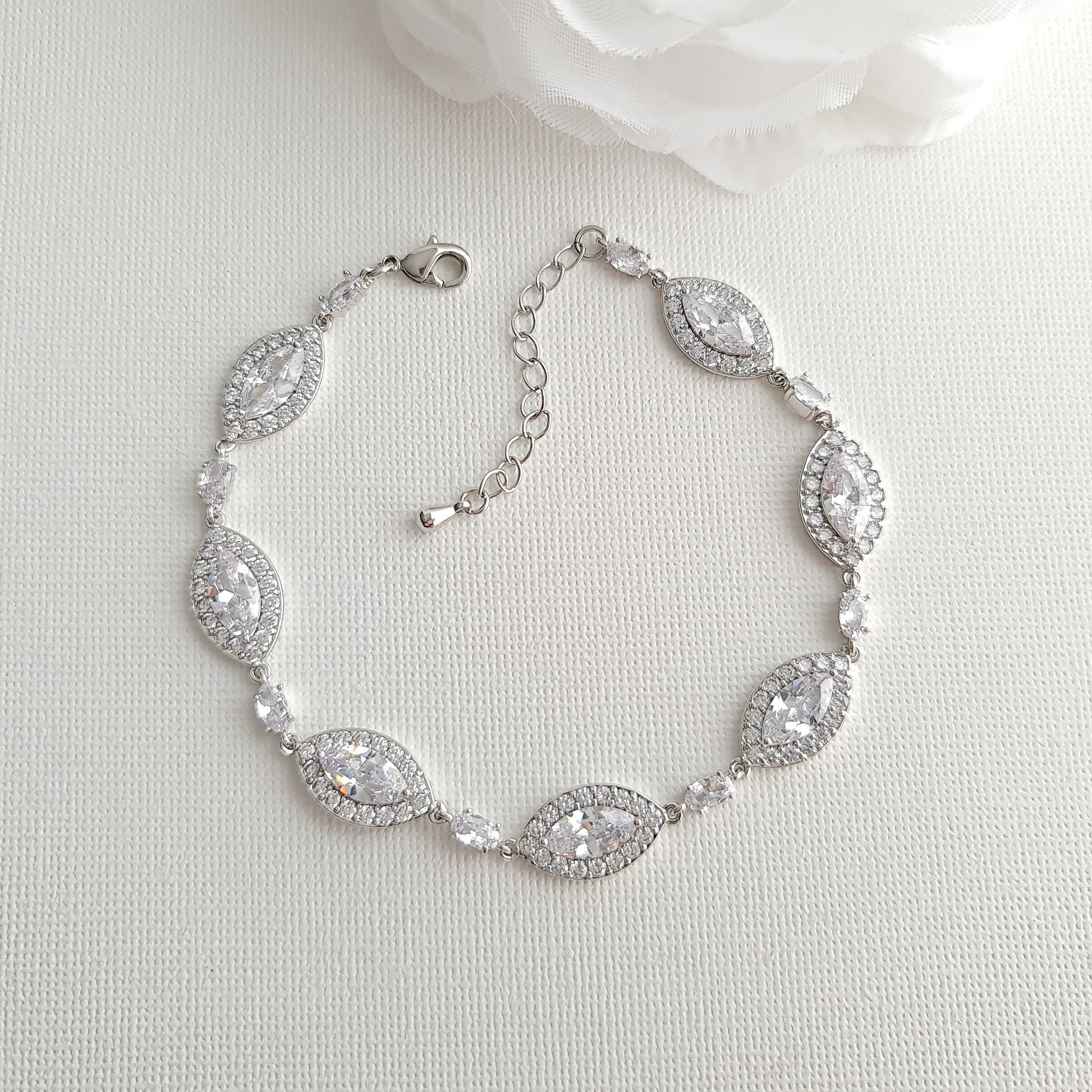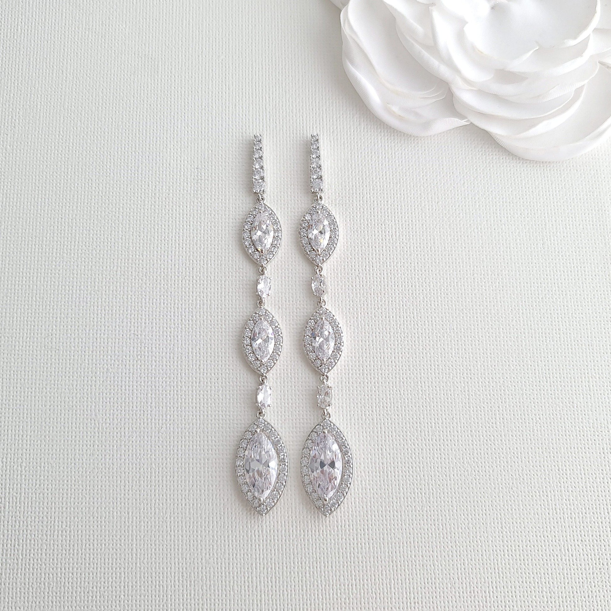 These sparkly long earrings and bracelets are made of cubic zirconia in a marquise shape, there are available in three finishes of silver, gold, and rose gold.