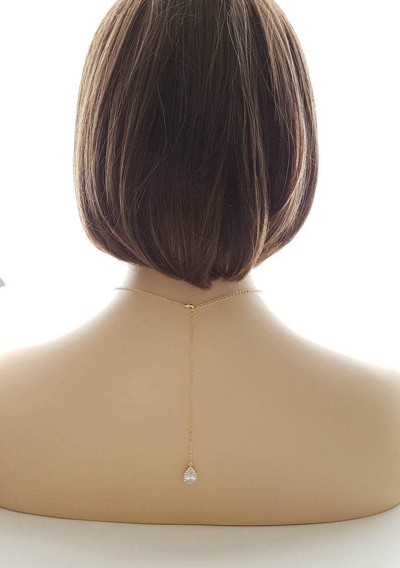 If you are looking for simple jewelry for your neckline, here is a simple teardrop back necklace for weddings, great for brides with their wedding dresses and other outfits which have a low back design.