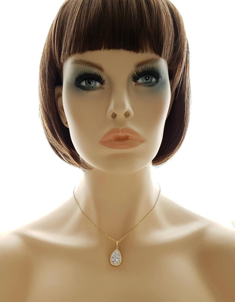 A simple wedding back necklace is made of shiny cubic zirconia crystals. The backdrop bridal necklace has a pear-shaped CZ crystal in the front and a simple crystal drop at the back which is slightly smaller in size.