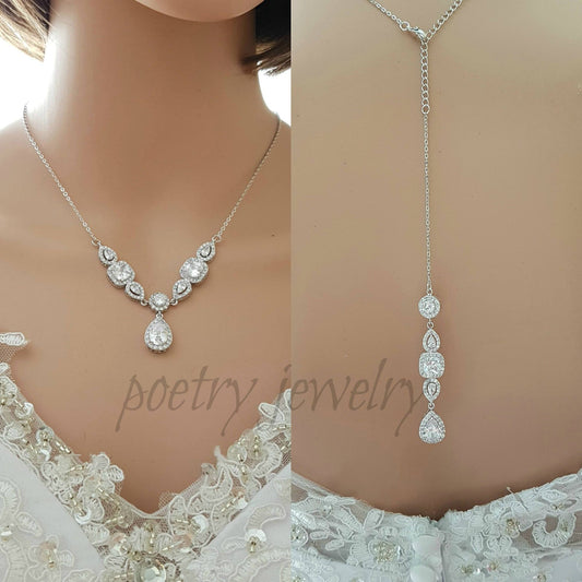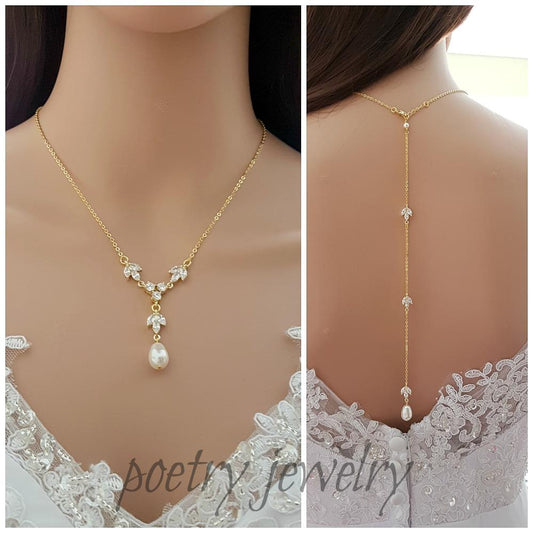 Collar de novia de gota trasera, collar de boda de cristal de perla, collar de telón de fondo de boda, collar de espalda simple, joyería de boda, Leila