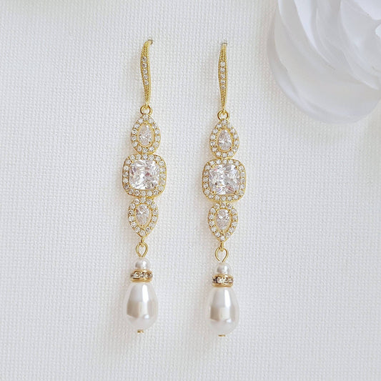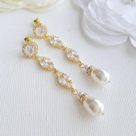 Pendientes colgantes de boda de oro y perlas-Ella