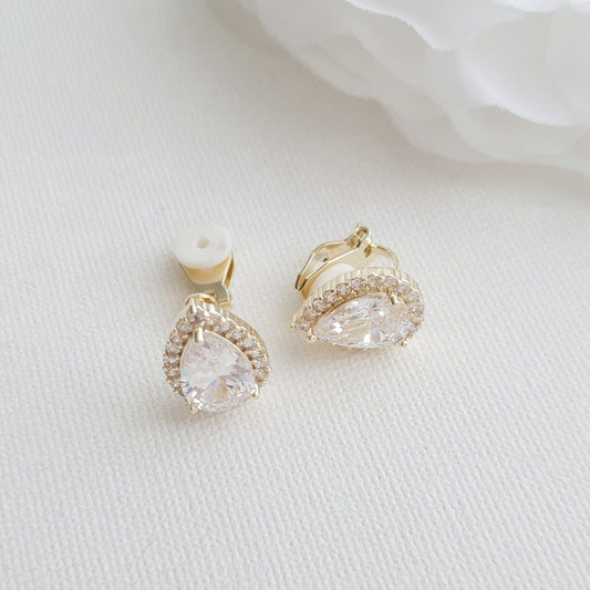 Pendientes de clip de oro en lágrima CZ para novias Damas de honor-Emma