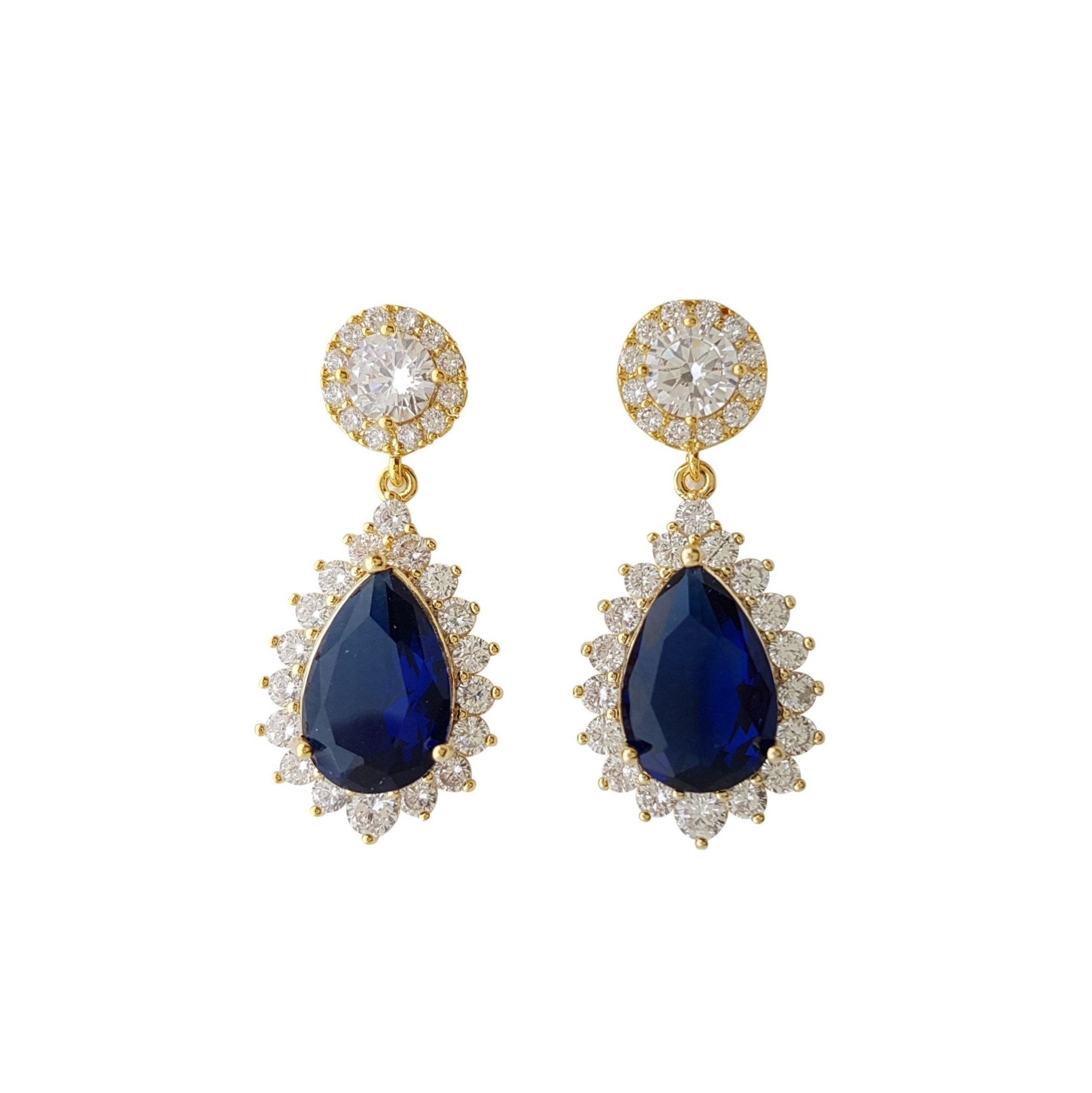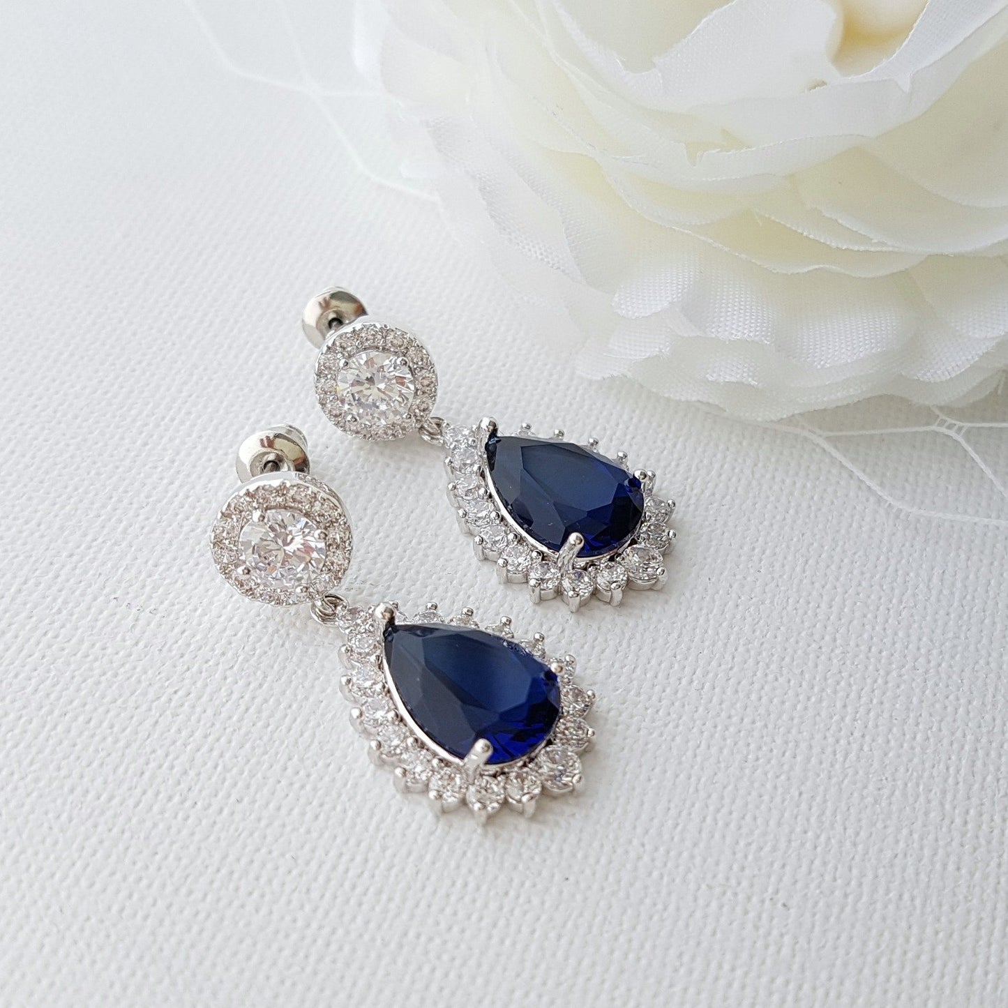 Estos hermosos aretes de lágrima azul son los más elegantes para novias y bodas. Confeccionados en una forma clásica de lágrima, estos aretes de zirconia cúbica azul están enmarcados en un acabado de oro rosa.