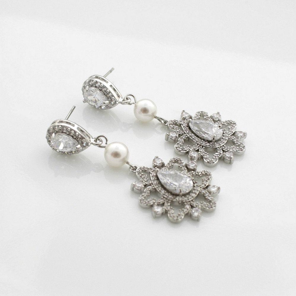 Pendientes de cristal de novia Starburst hechos a mano con brillantes cristales CZ. Estos aretes de boda están combinados con una perla pequeña y pendientes en forma de lágrima de circonita cúbica. Una gran longitud y fácil en los oídos. Gran pendiente con gota decorativa única perfecta para el look clásico de novia y día de la boda.