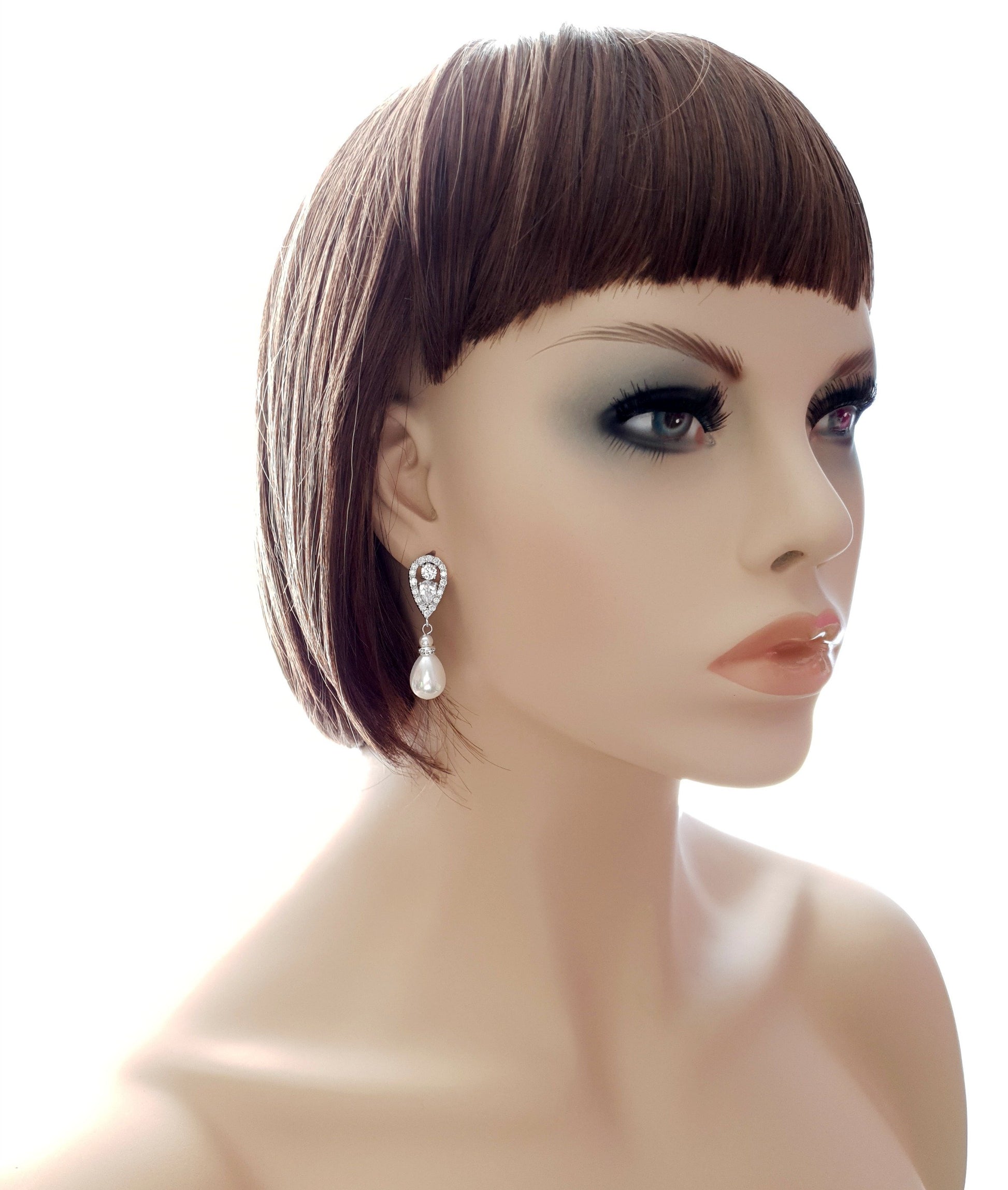 Aretes de novia de perlas de oro de 14 quilates en poste de oreja de CZ y gotas de perlas