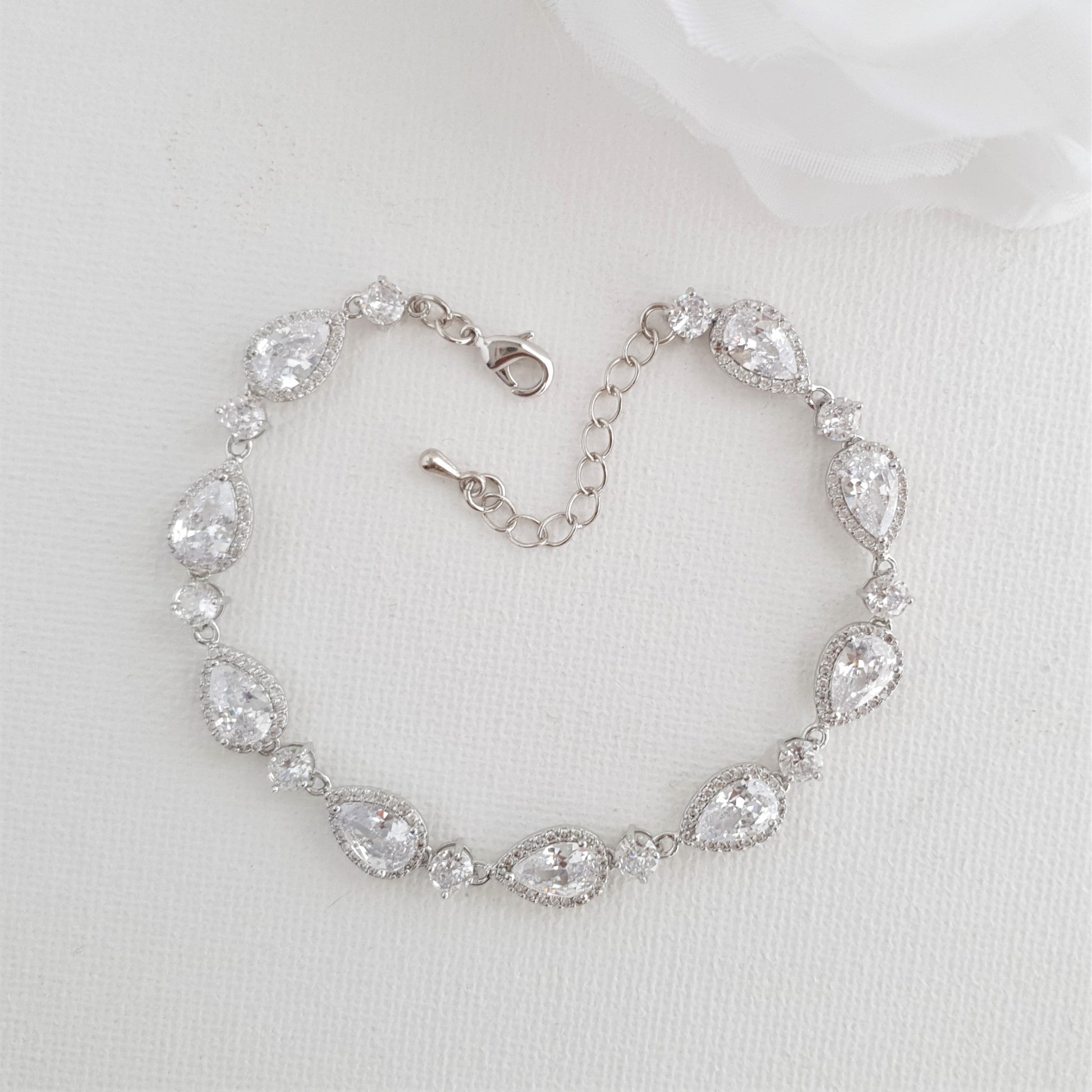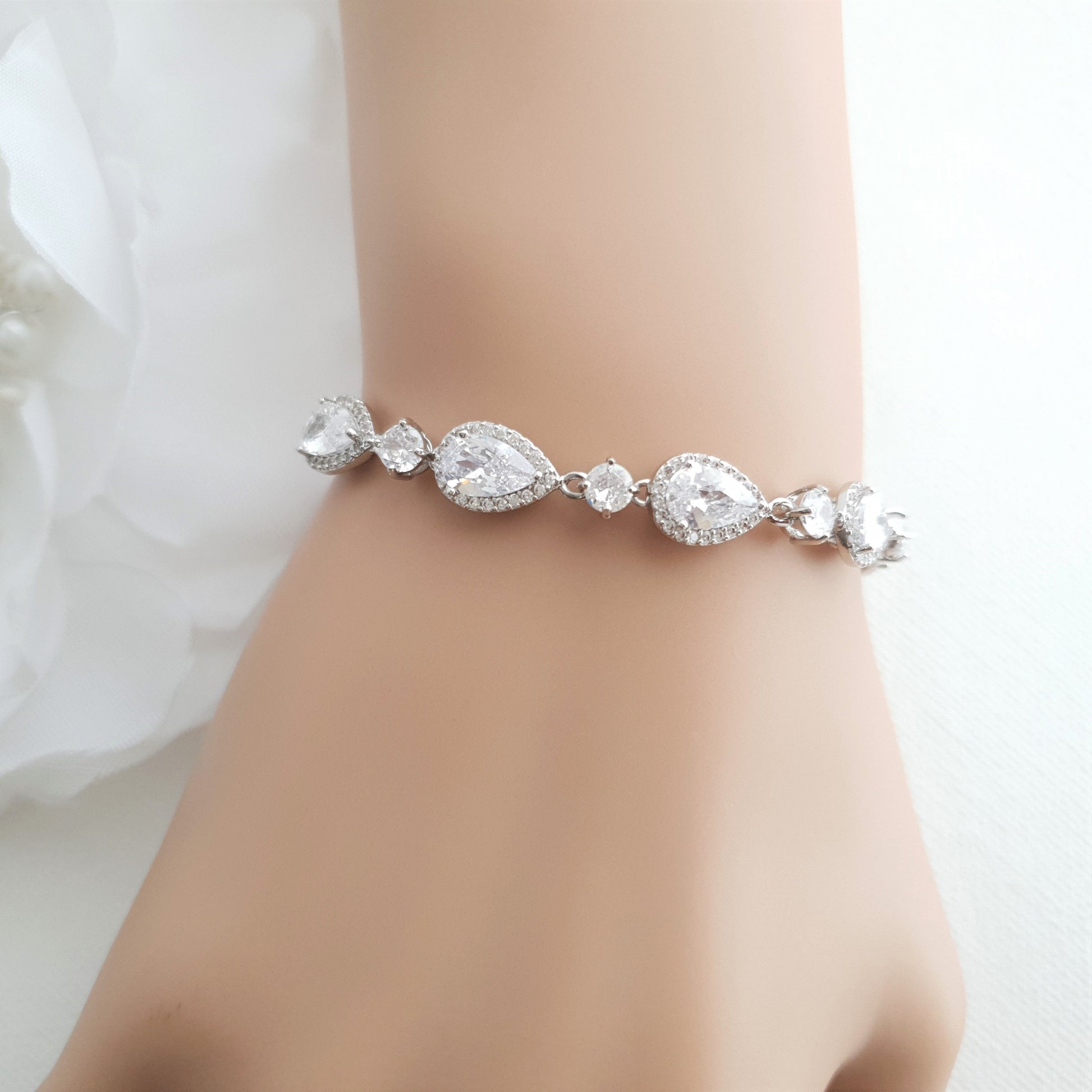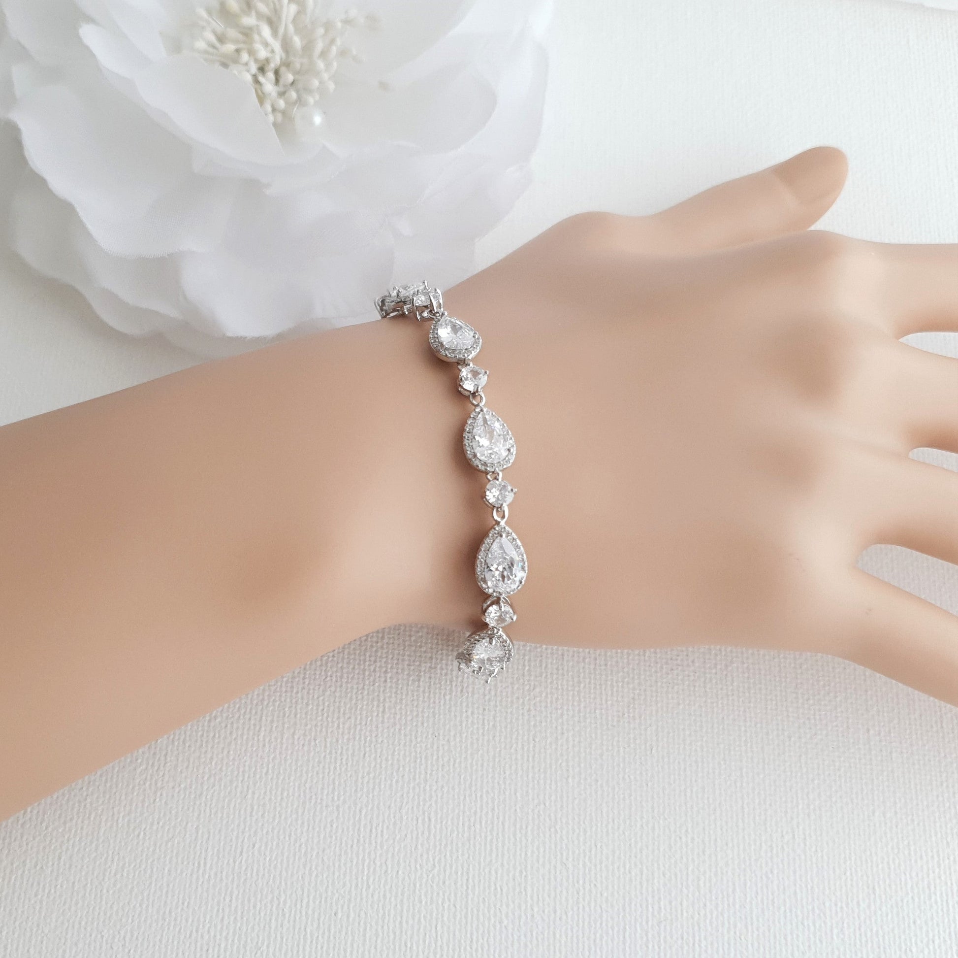 La pulsera es genial para usar el día de tu boda, ofrece mucho brillo. El brazalete se puede usar mucho después de la boda en ocasiones especiales y será un maravilloso regalo para sus seres queridos. Combina fácilmente con otras joyas en forma de lágrima o añade un estilo clásico.