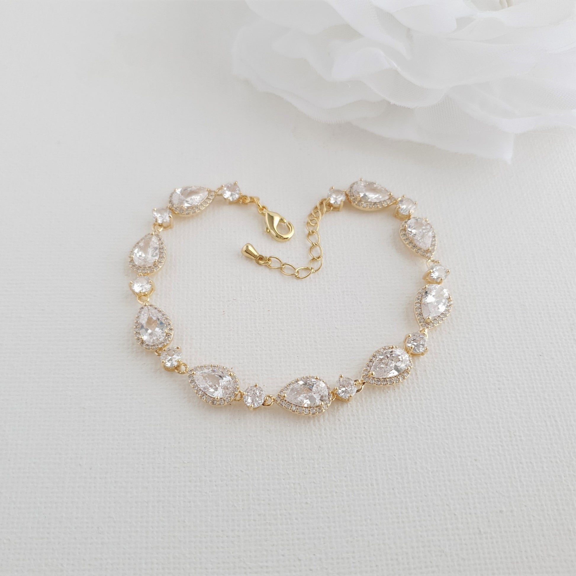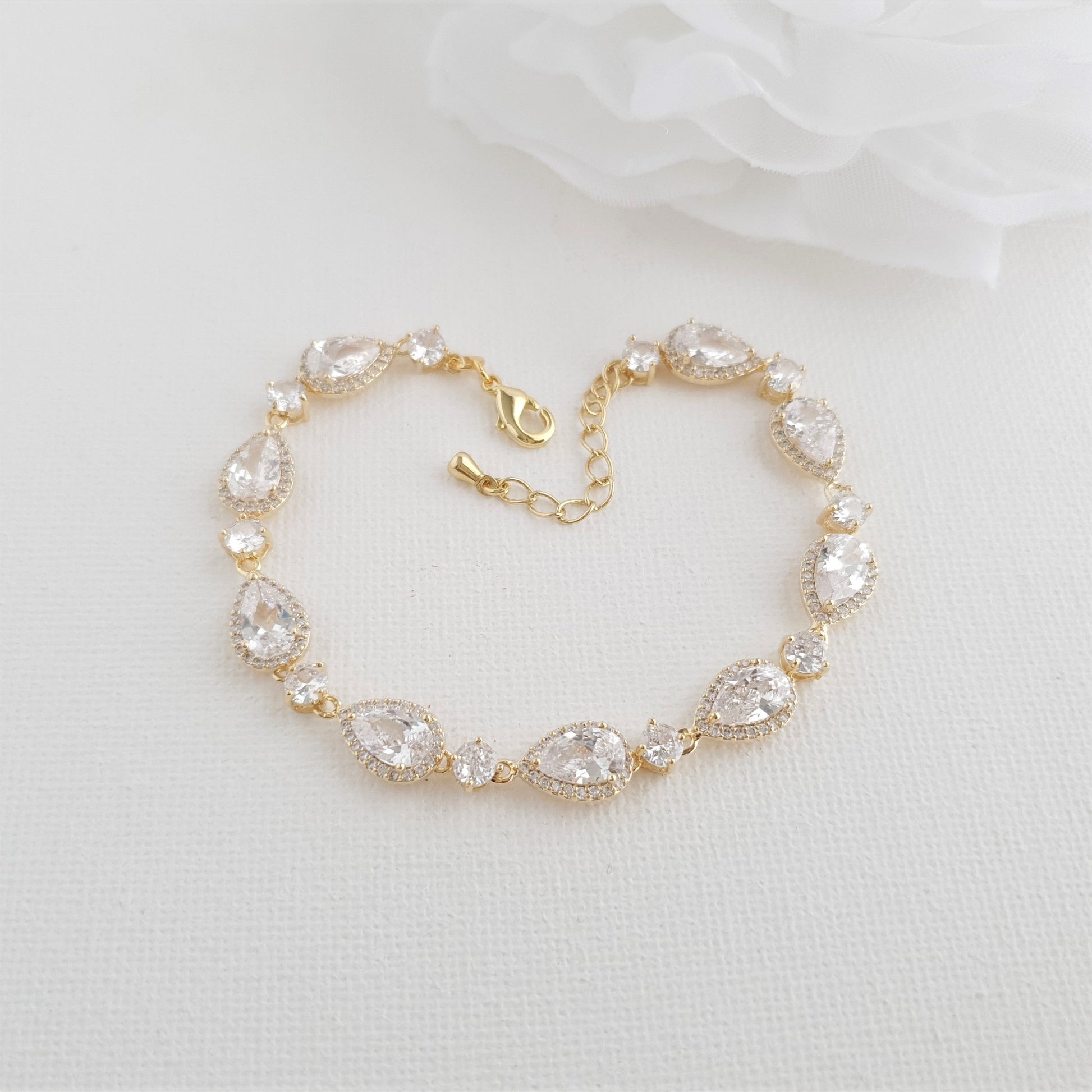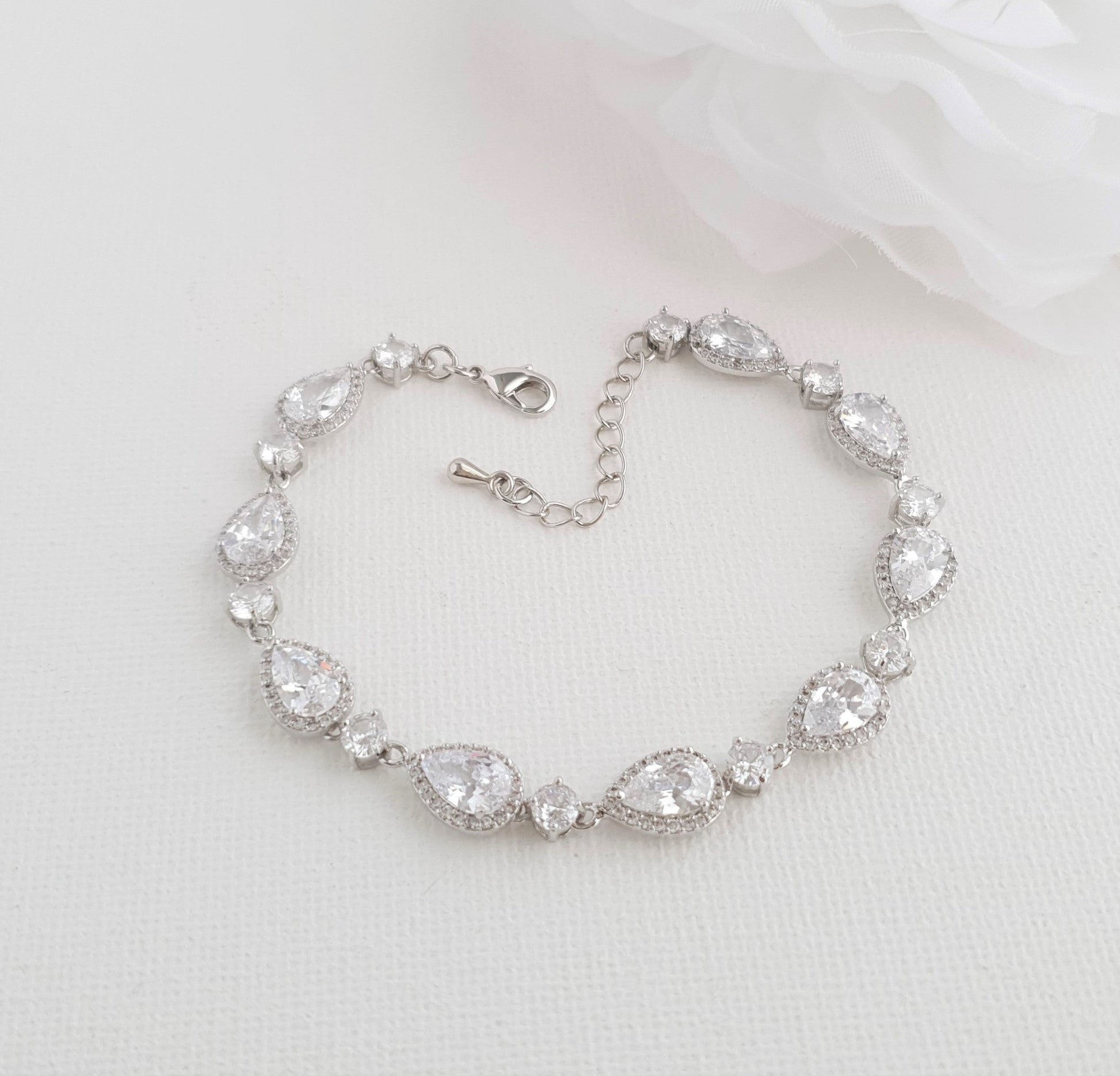 La pulsera es genial para usar el día de tu boda, ofrece mucho brillo. El brazalete se puede usar mucho después de la boda en ocasiones especiales y será un maravilloso regalo para sus seres queridos. Combina fácilmente con otras joyas en forma de lágrima o añade un estilo clásico.