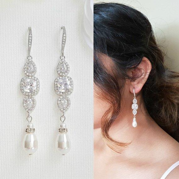 Para darle más fuerza a los aretes colgantes de cristal, les agregué perlas. Los he colgado de alambres de oído detallados de zirconia cúbica. Estos aretes de boda colgantes están disponibles en perlas blancas/marfil o crema. Todo el material es latón chapado en plata/rodio. Los pendientes colgantes de perlas están disponibles en acabado plata/rodio, acabado oro rosa y acabado dorado. Este diseño también ofrece una pulsera y un collar Gianna a juego con o sin fondo. Si necesita agregar una perla en la pulsera y el collar, comuníquese conmigo y la personalizaré para usted.