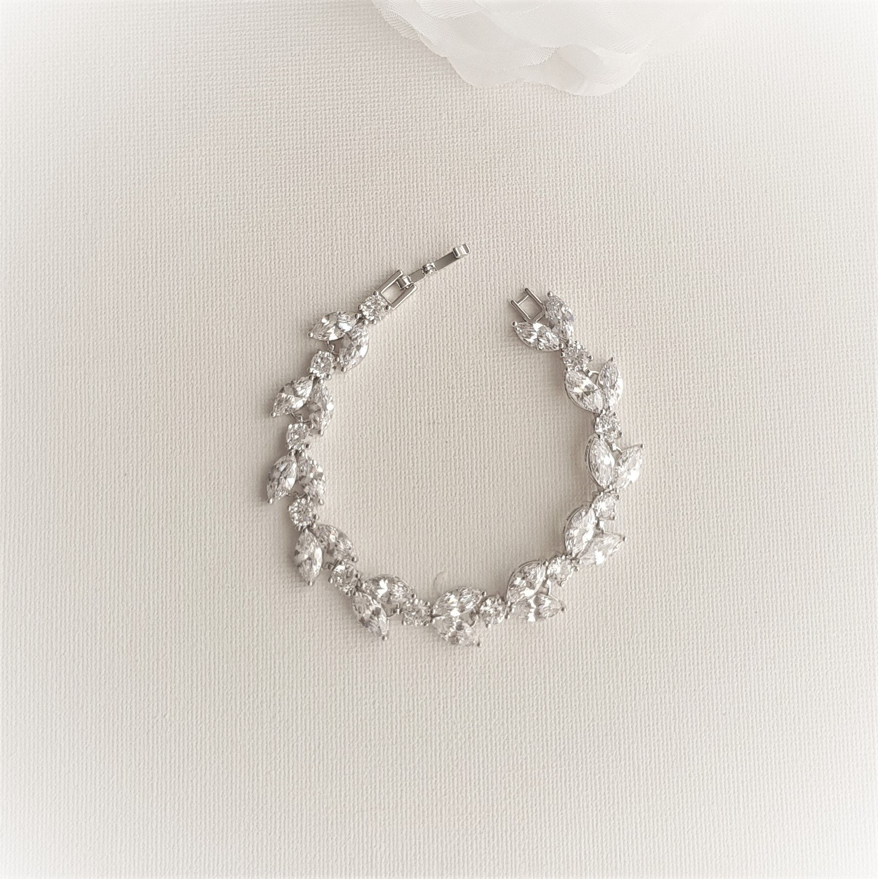 Hermoso y brillante brazalete para el día de la boda que toda novia debería considerar para el día de su boda. Estas pulseras de cristal en forma de marquesa están hechas con circonitas cúbicas en un acabado plateado con baño de rodio y resistentes al deslustre. Este brazalete para la boda es una combinación perfecta con una miríada de estilos y diseños de novia y vestidos de novia. Este brazalete de boda se puede usar el día de su boda y en cualquier momento posterior en cualquier ocasión. La pulsera mide 18 cms o 7 pulgadas de largo.