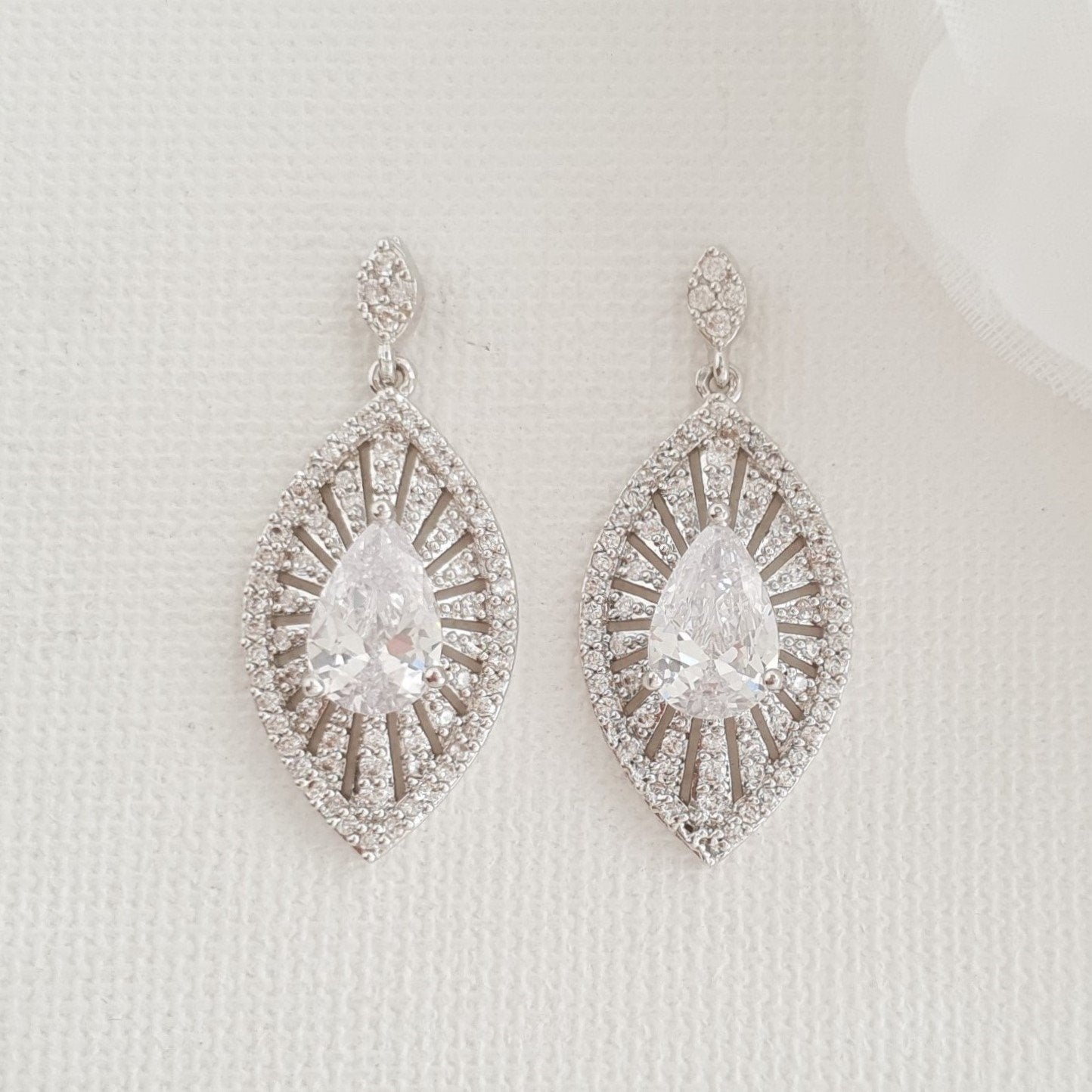 Estos aretes de oro en forma de gota están hechos en una talla marquesa de forma ovalada grande con un pequeño poste para la oreja, todos hechos con circonitas cúbicas. Este arete colgante de oro está chapado en oro de 14 quilates y está adornado con brillantes cristales CZ. Los aretes colgantes también están disponibles en otros dos acabados de oro rosa y plata con baño de rodio para elegir.