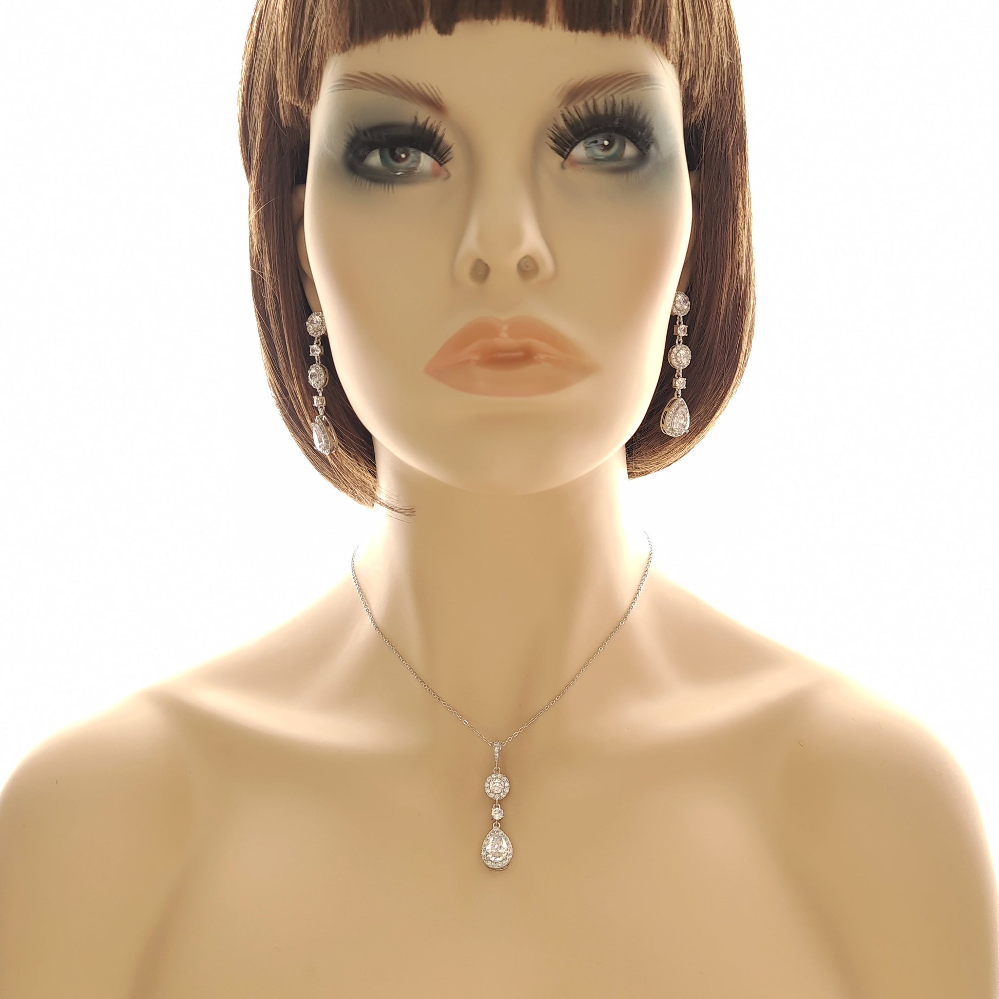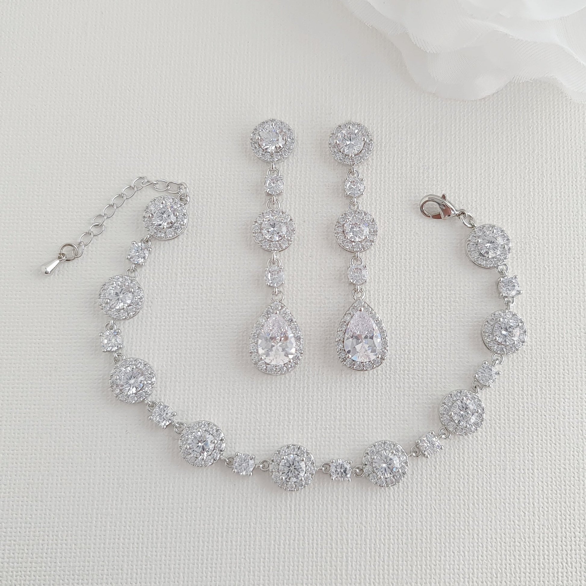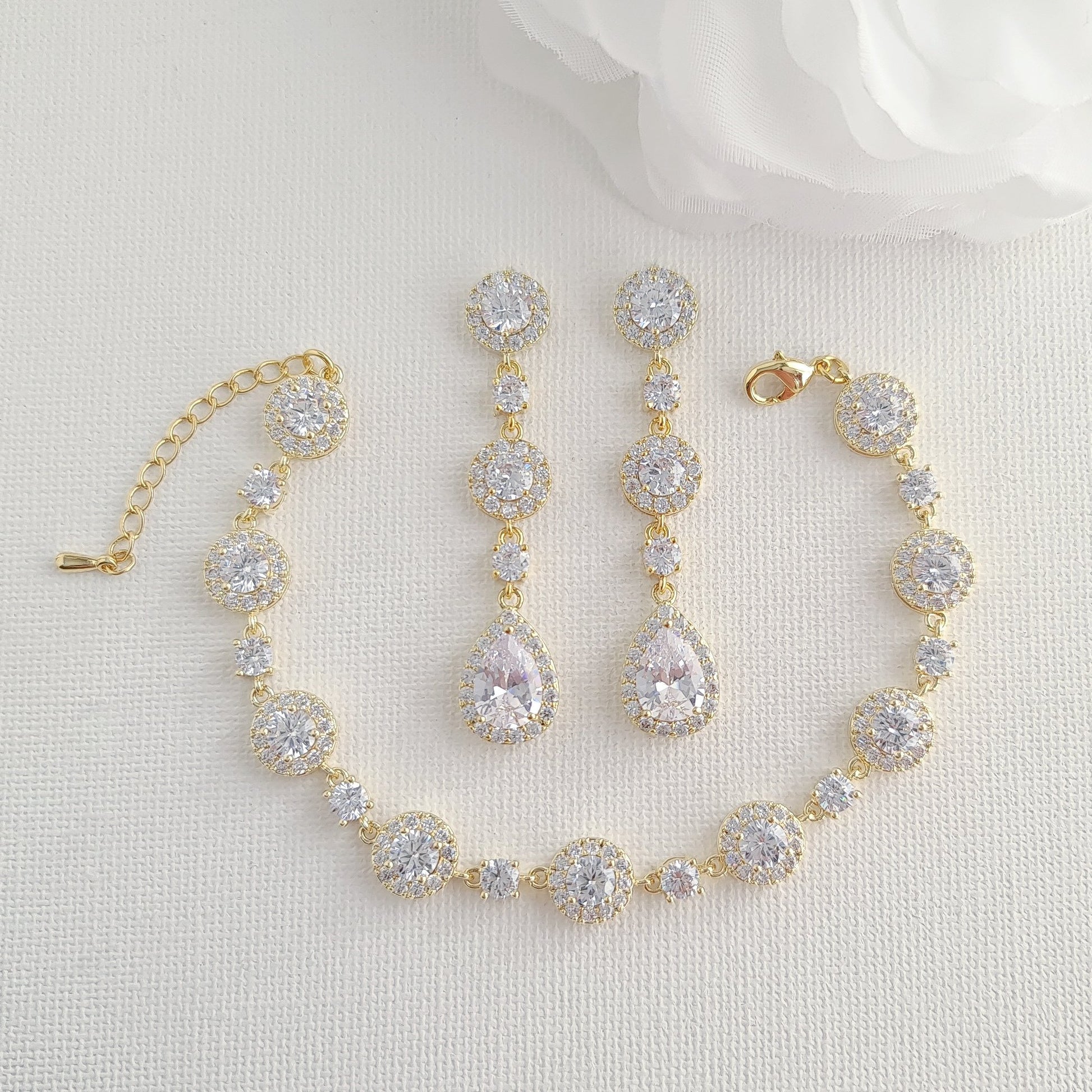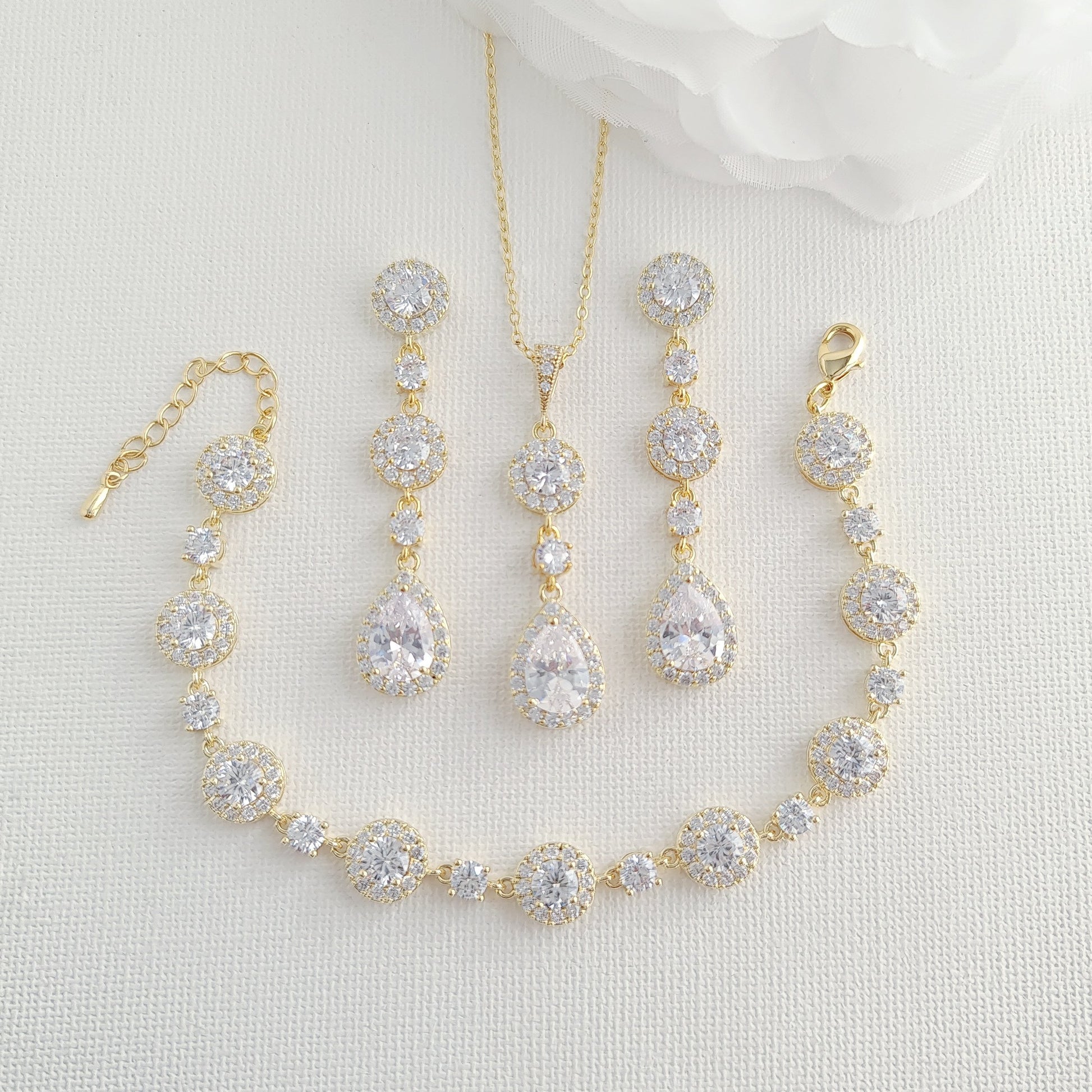 Los aretes, el collar y la pulsera están hechos de forma redonda y en forma de lágrima con brillantes circonitas cúbicas. Están disponibles en acabados de plata, oro y oro rosa para elegir.