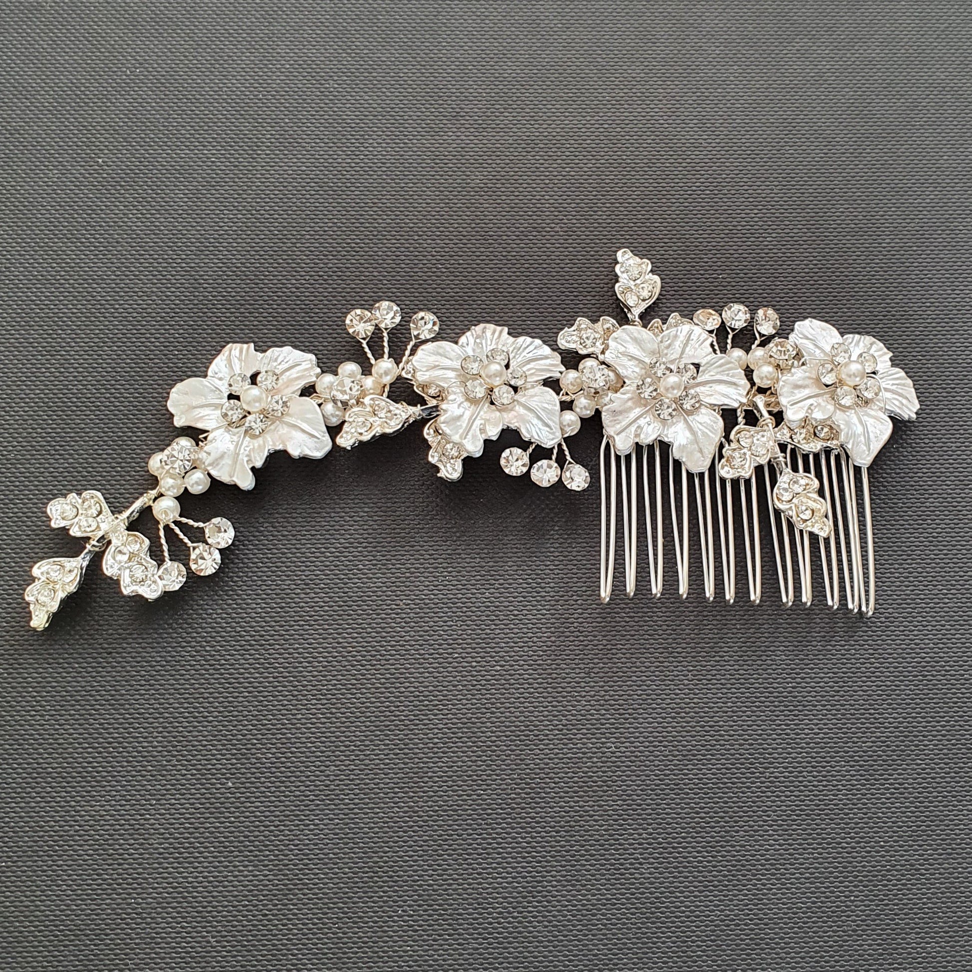 Un magnifique peigne à cheveux floral de mariage composé de pétales et de feuilles de fleurs argentées. Le peigne à cheveux peut être utilisé sur le dos ou sur le côté avec n'importe quelle coiffure de mariée courte ou longue.