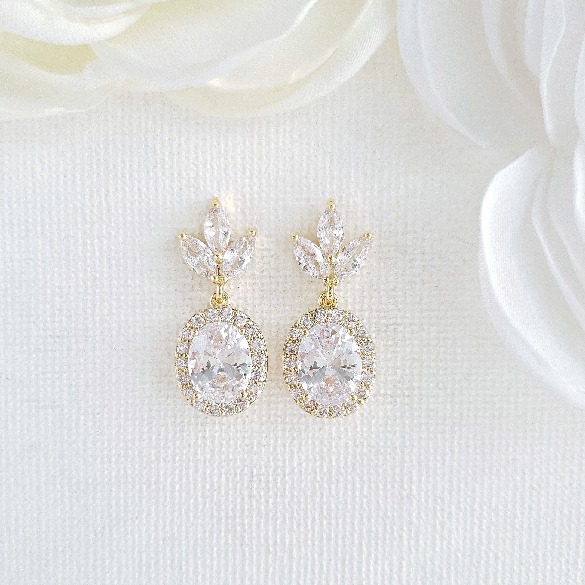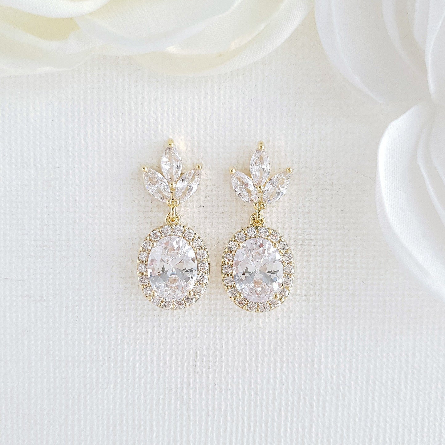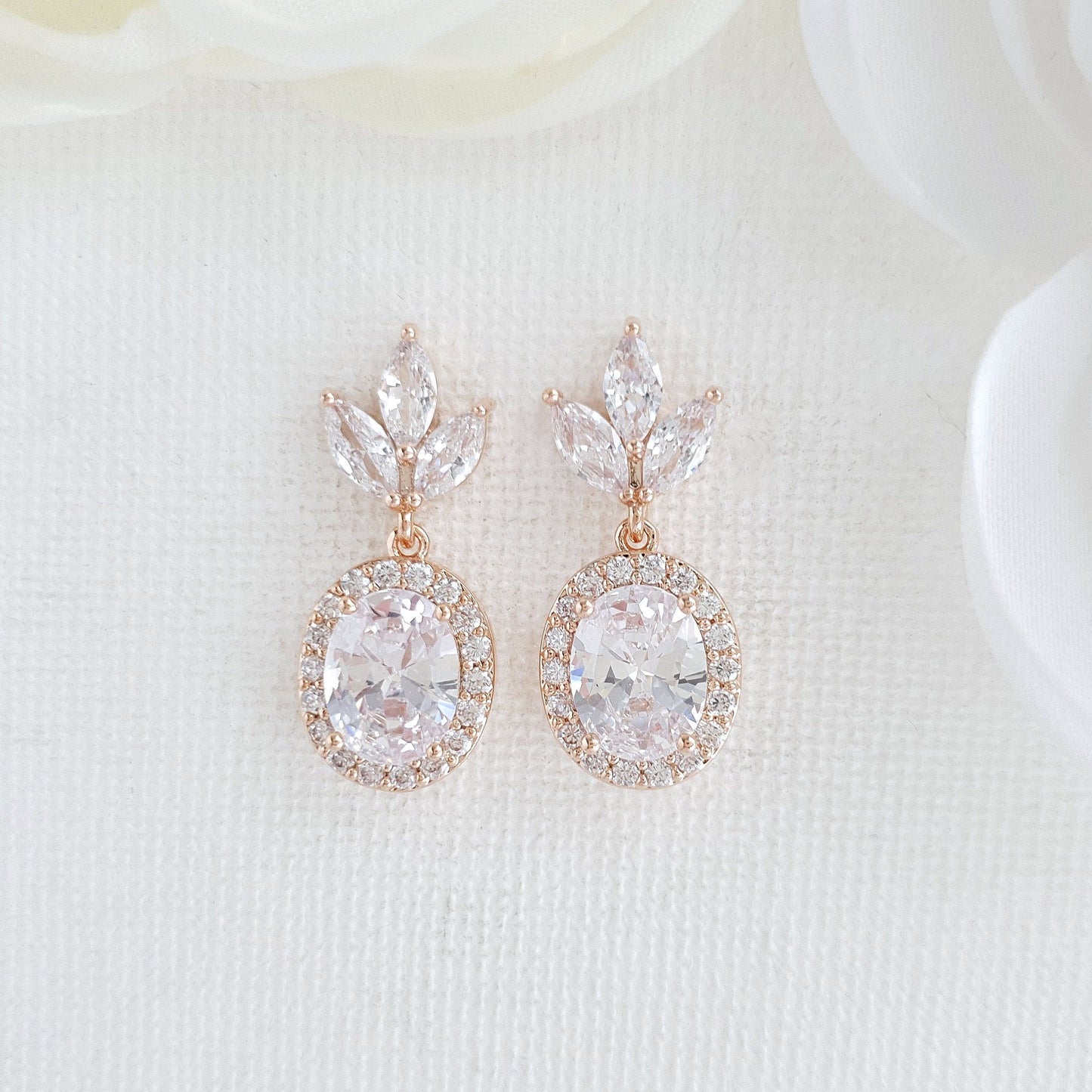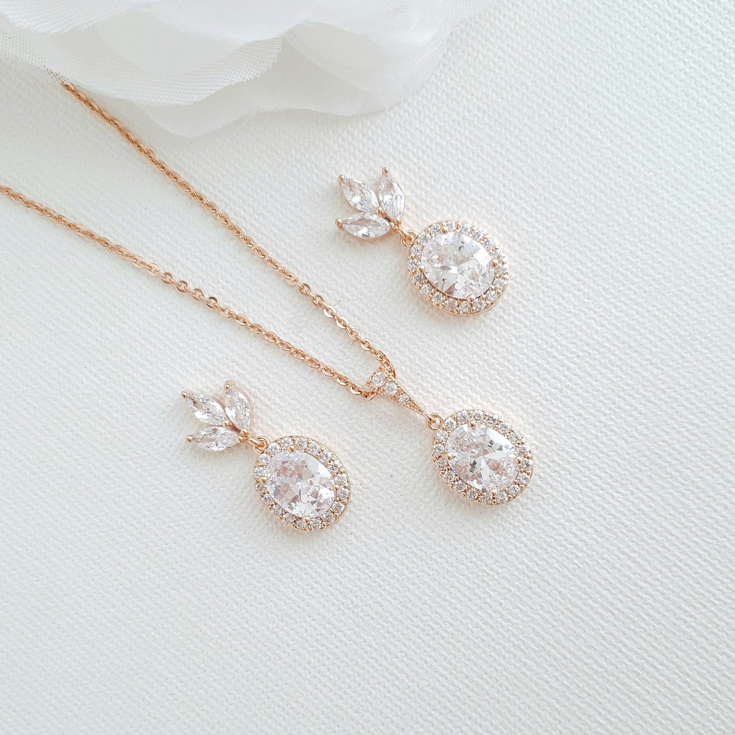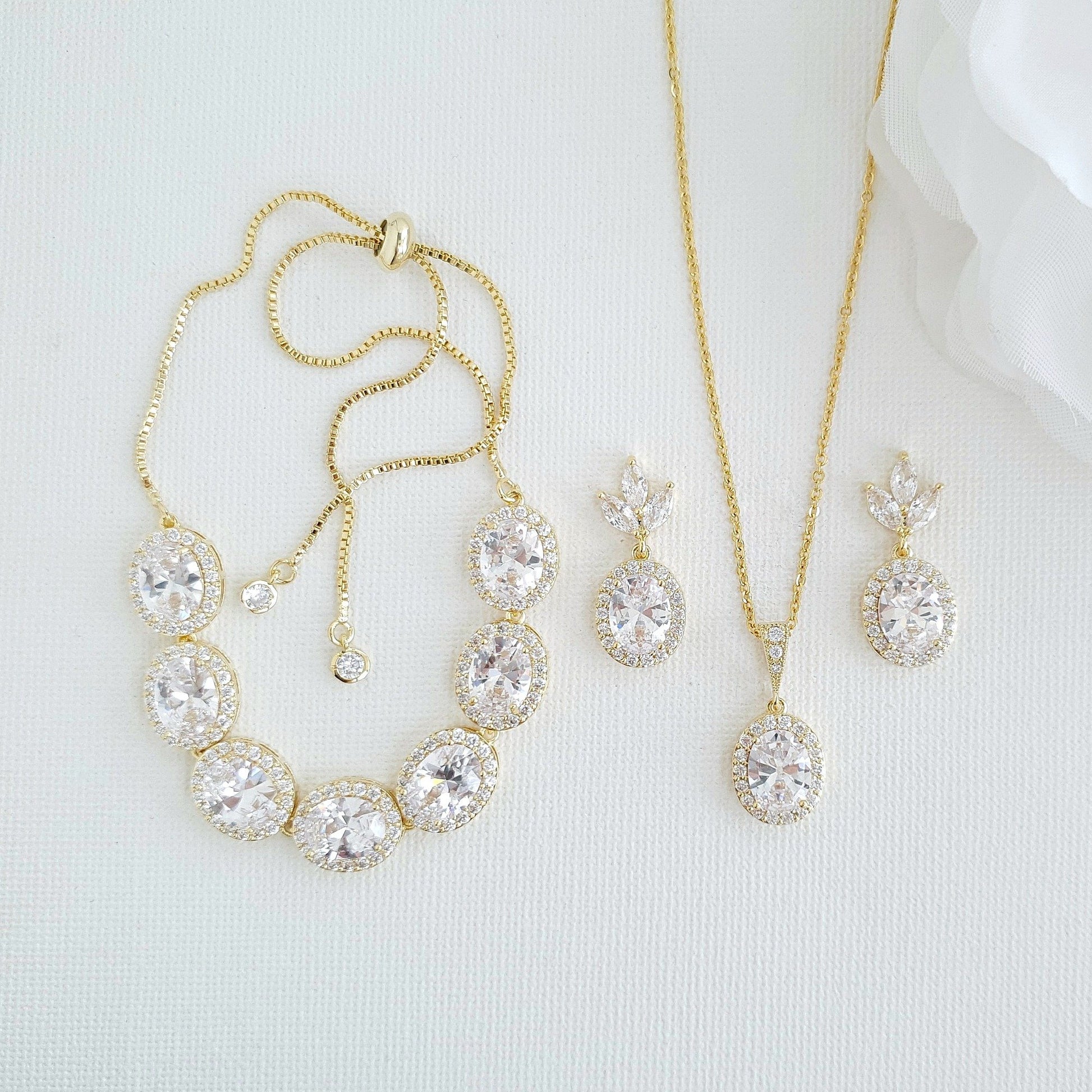 This wedding jewelry set with oval CZ crystals are available in silver gold and rose gold to choose from.