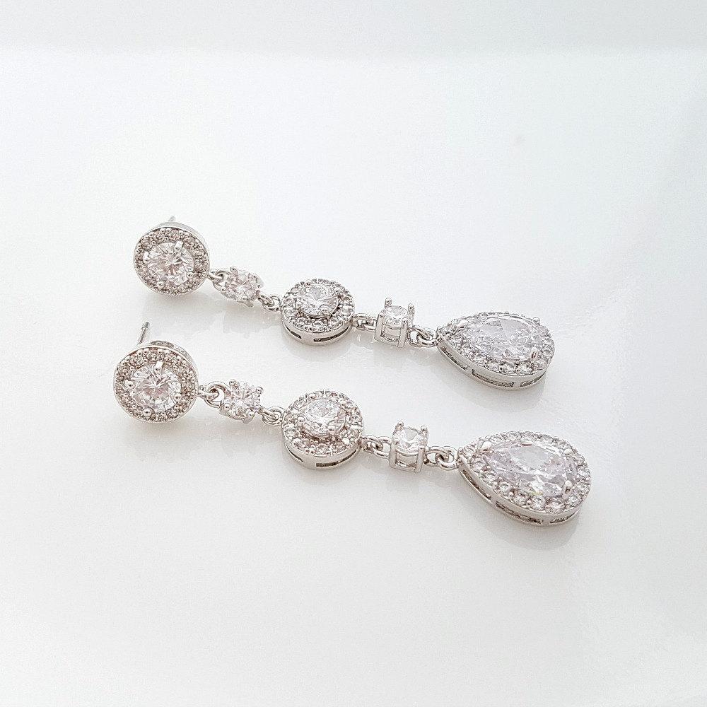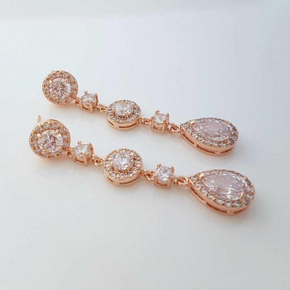These long yellow gold drop earrings have around and teardrop shapes with small crystals in them. They can be combined with many of our designs for a complete wedding jewelry set. If you like this long drop earrings design they are also available in silver and rose gold finishes.