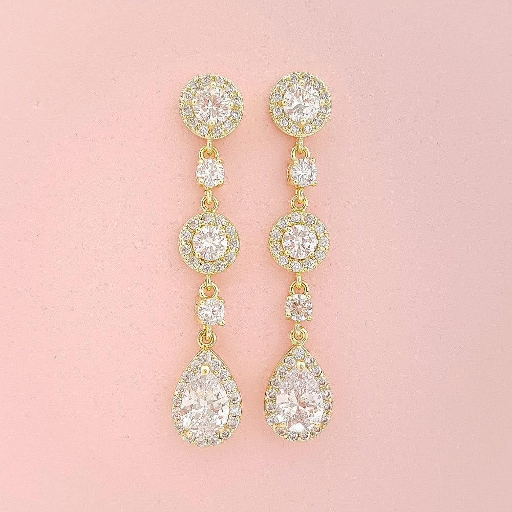 These 14K yellow gold plated drop earrings for weddings are a great choice for brides and women for gold drop earrings for formal and special occasions. They are long sparkly and made with cubic zirconia. The 14k gold plating all along the crystals add a luxurious look for flawless gold drop earrings.