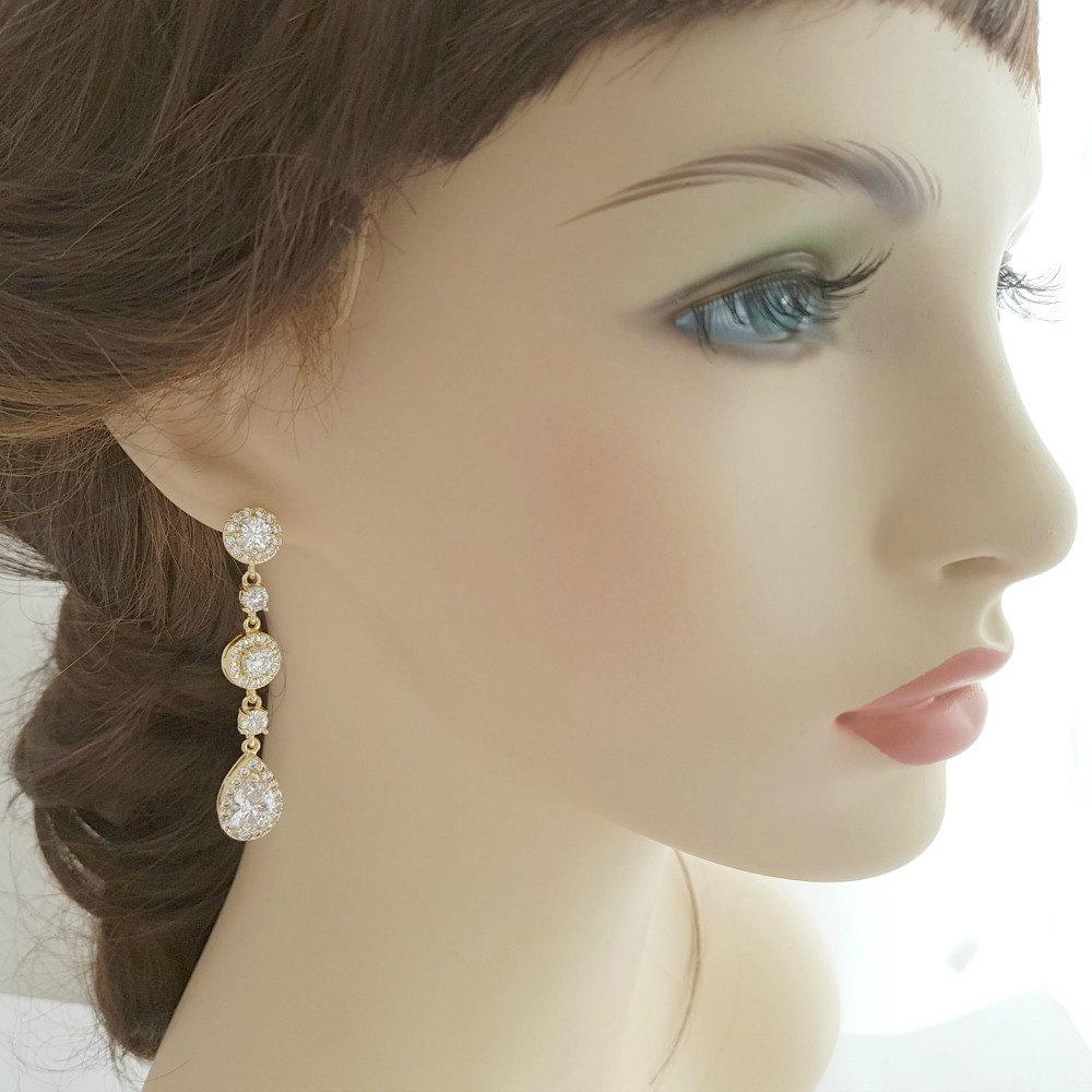 Long Drop Earrings for Wedding in 14K Yellow Gold With Sparkly CZ Crystals