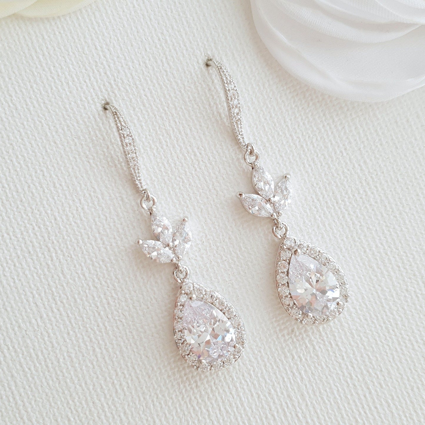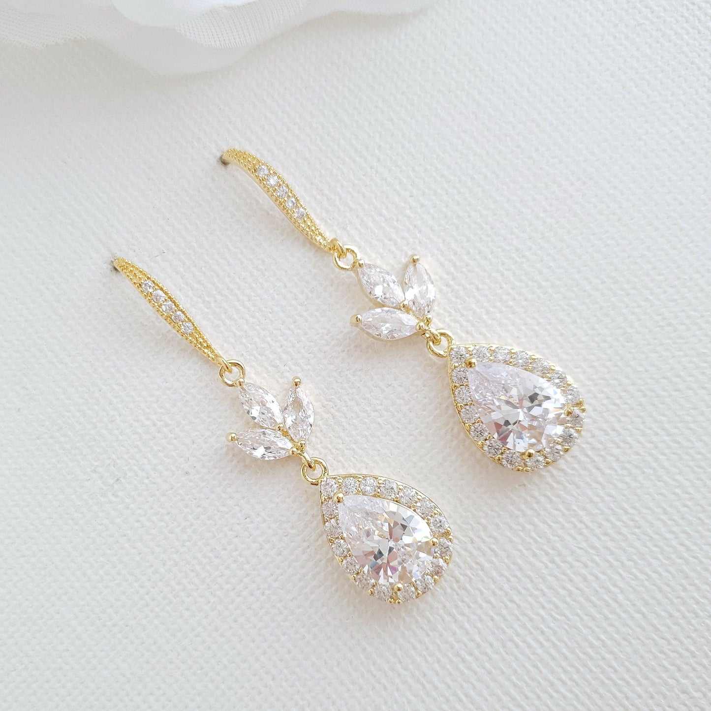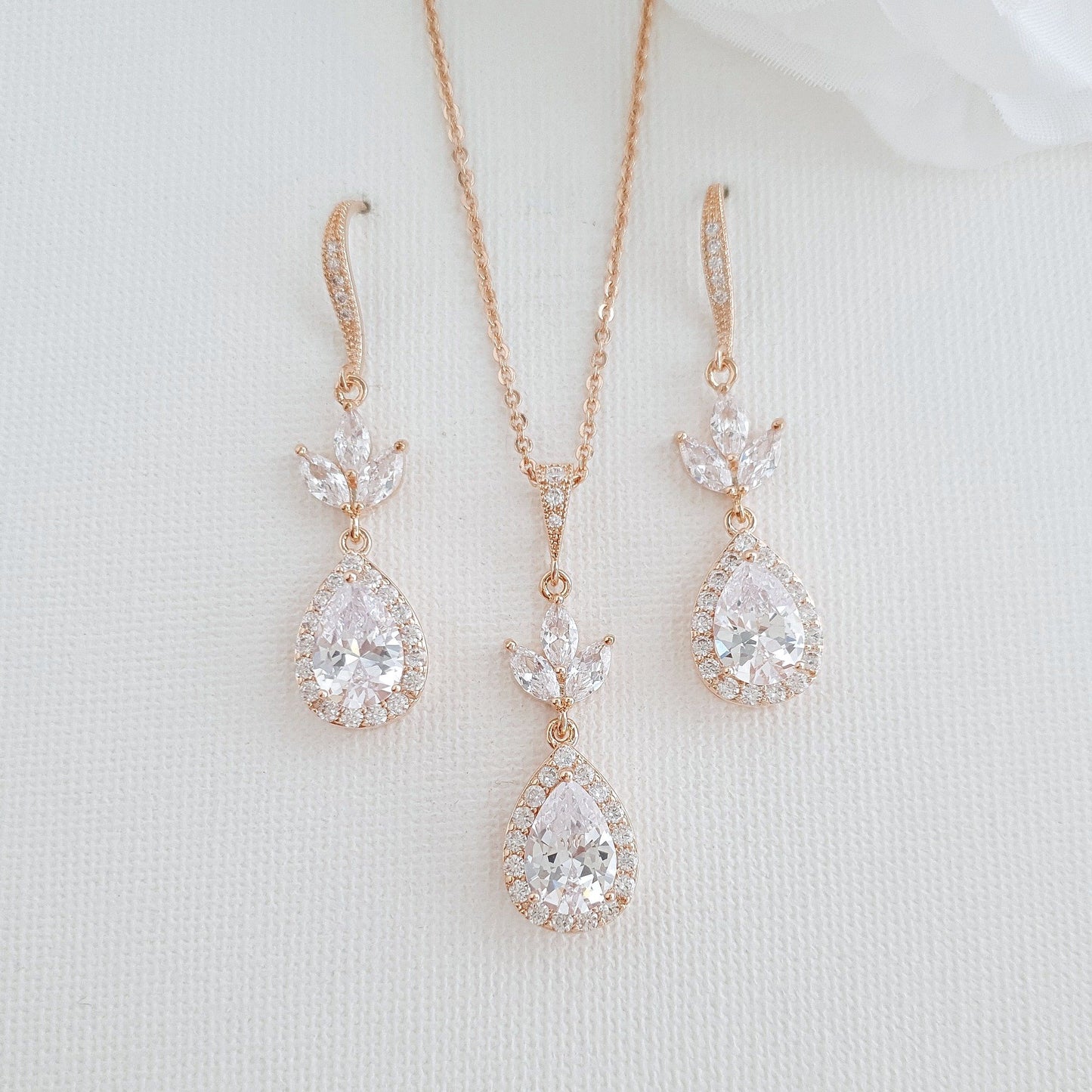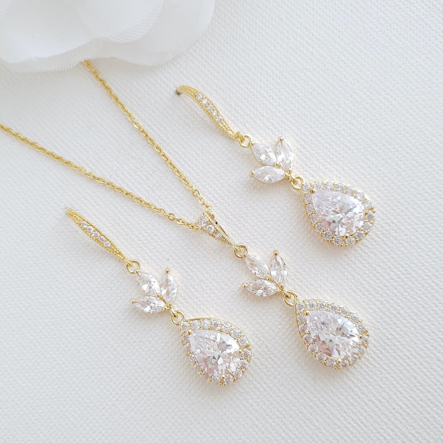 Shop elegant 14K yellow gold necklace and earrings set for brides and bridesmaids, and women on special events and occasions. This gold wedding jewelry set in made up of cubic zirconia lotus-shaped crystals and teardrop earrings put onto CZ detailed hook ear wires and the necklace pendant is put onto a cubic zirconia detailed bail and a link gold plated chain. The chain is available in two lengths and all material used is 14K gold plated brass which is tarnish-resistant. This gold bridal jewelry set is also available in silver and rose gold finishes. If you need just a necklace or the earrings they can be purchased individually if you like. Search for Lotus in store.