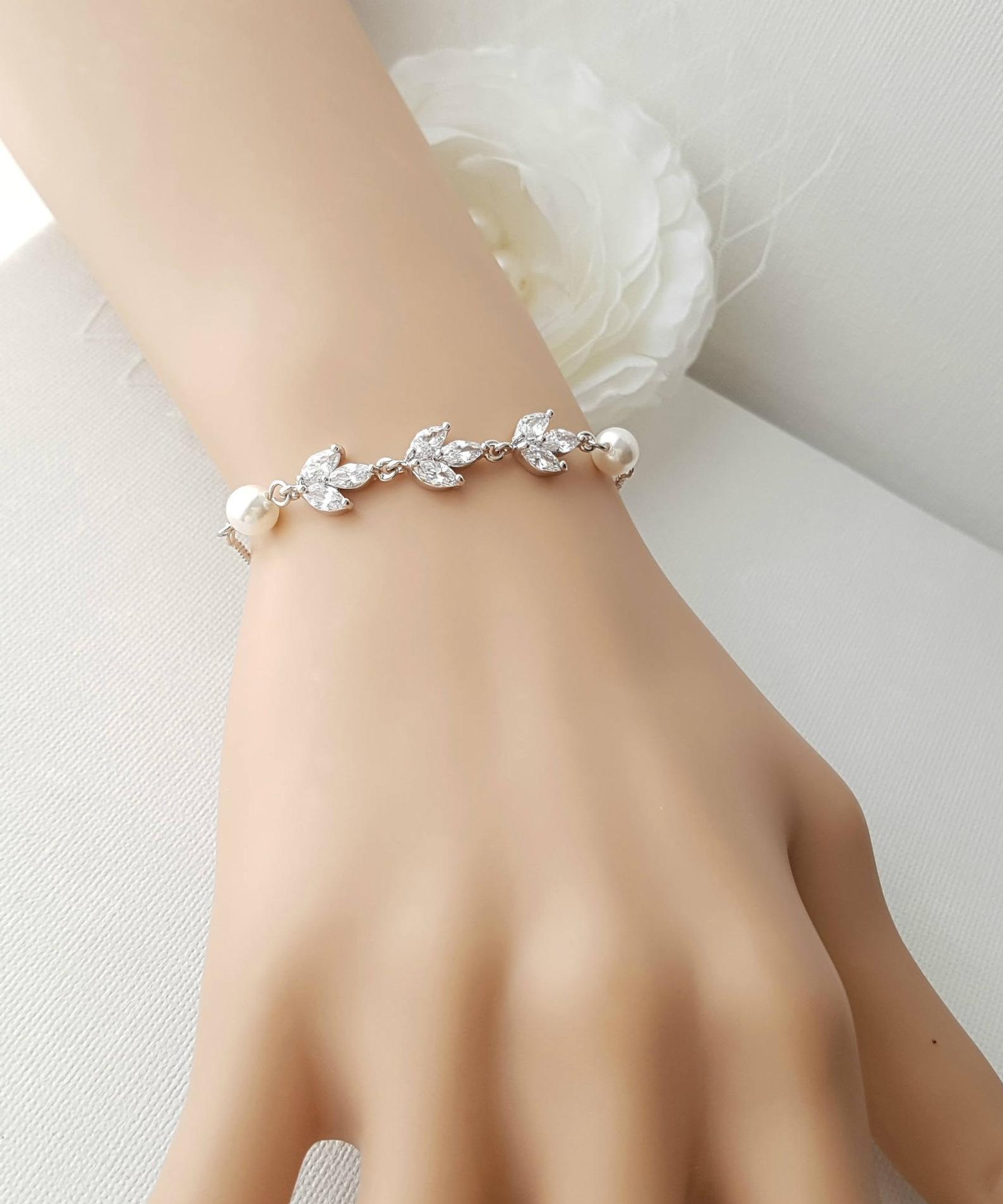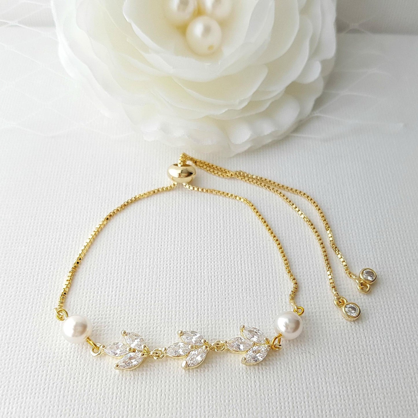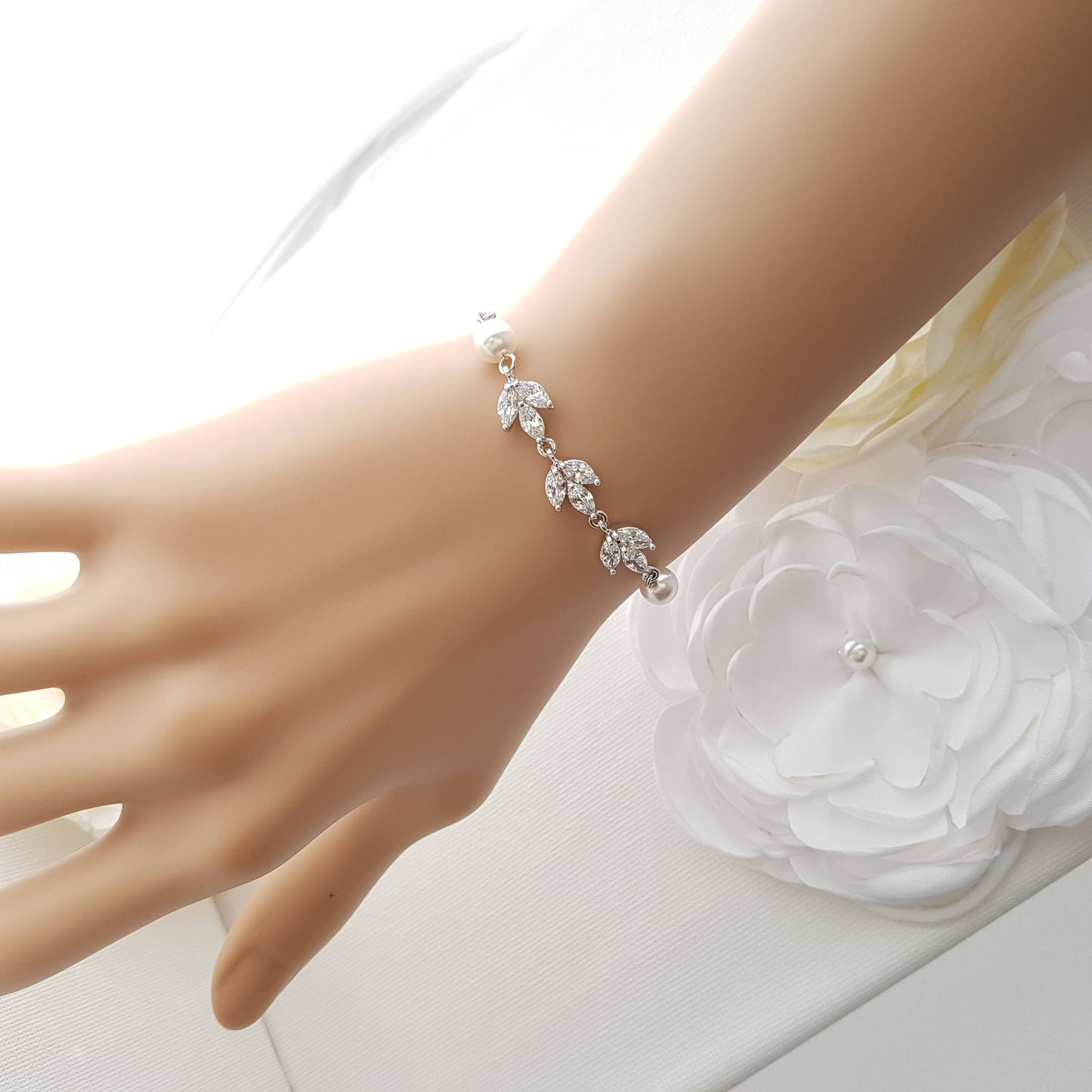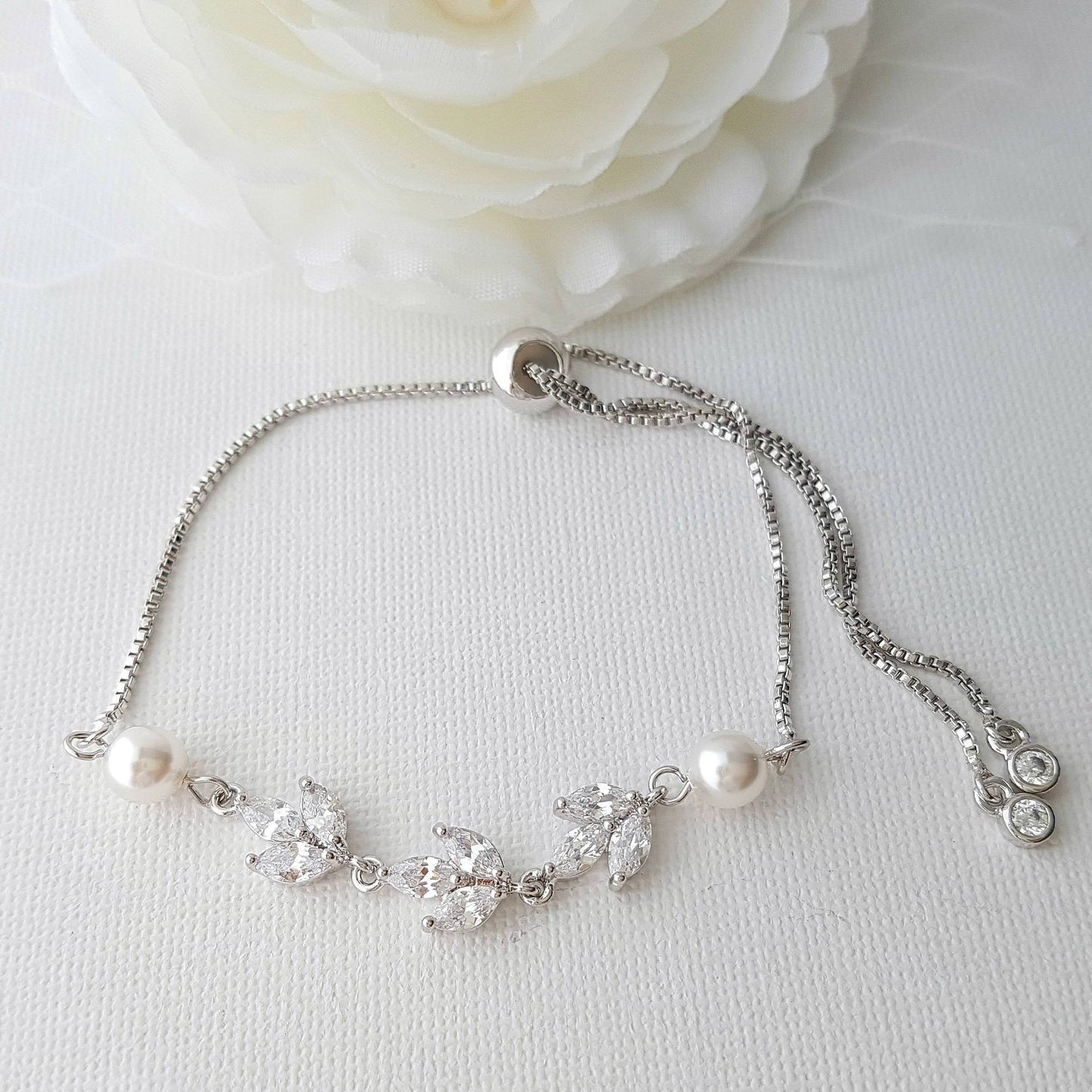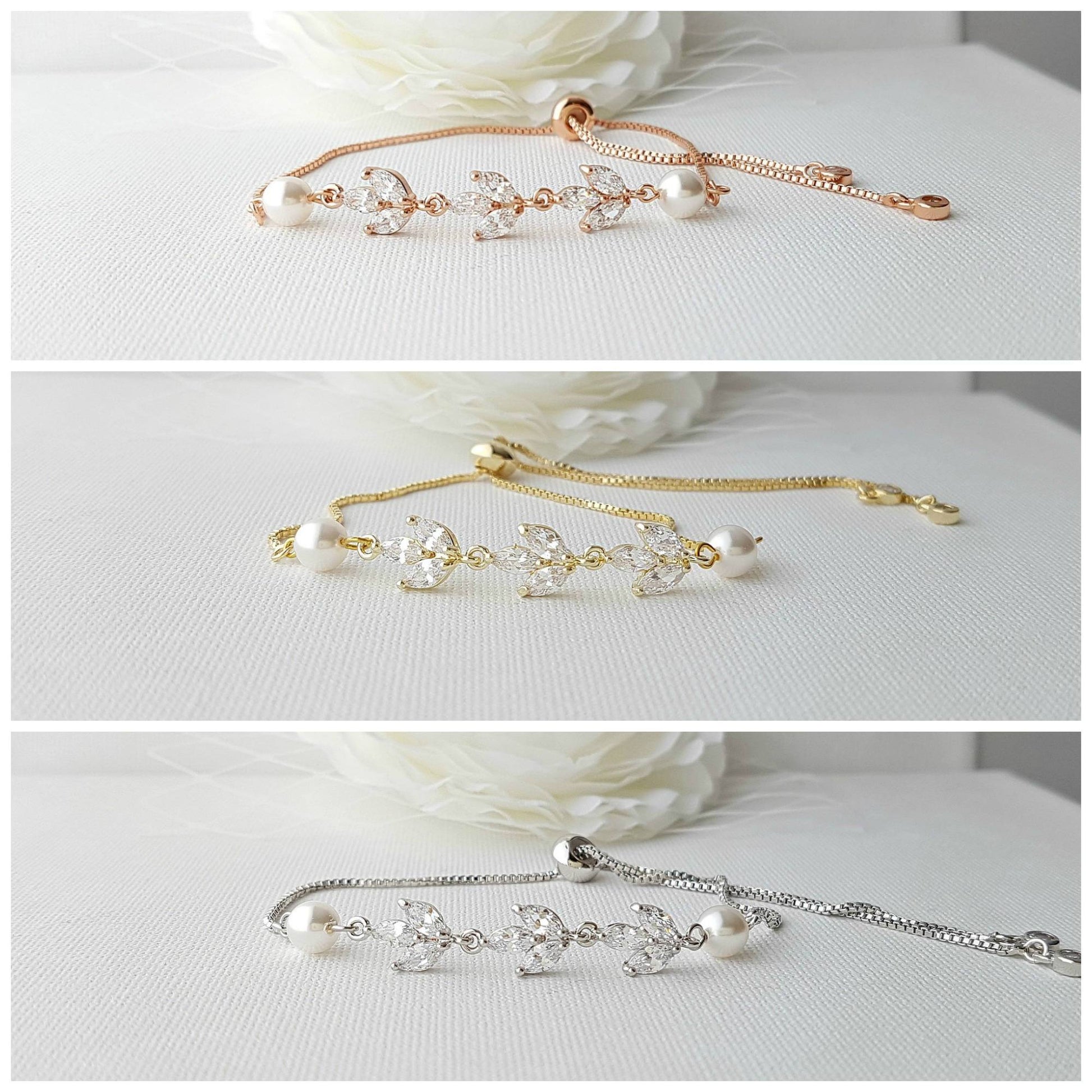 These are beautiful adjustable marquise crystal bridal bracelets that are great for weddings, formal events, and proms. This lovely delicate crystal bridal bracelet is made with cubic zirconia and is available in three finishes of silver, gold, and rose gold finishes. The sparkly crystal part is made with marquise-shaped cubic zirconia with small pearls that add elegance.