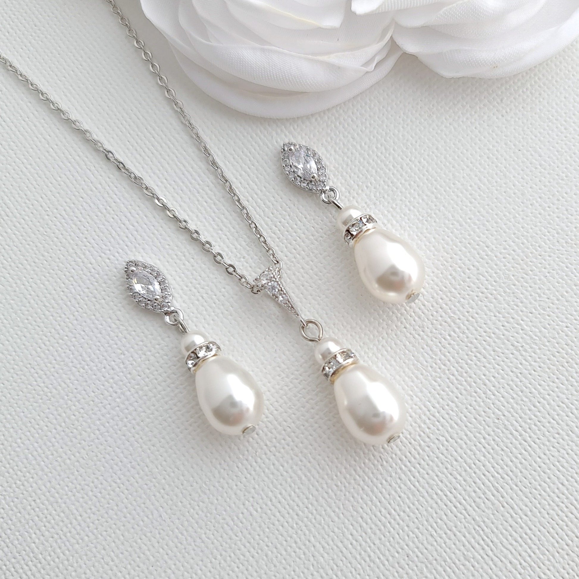 Made with the finest materials, this set features lustrous, long pear-shaped pearls available in classic cream and white, along with sparkling cubic zirconia accents. The elegant design and available finishes (silver, gold, and rose gold) ensure a perfect match for any bridesmaid dress color scheme.