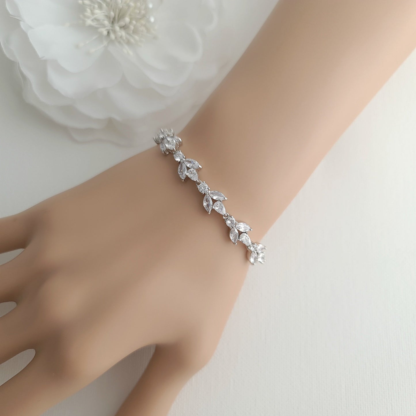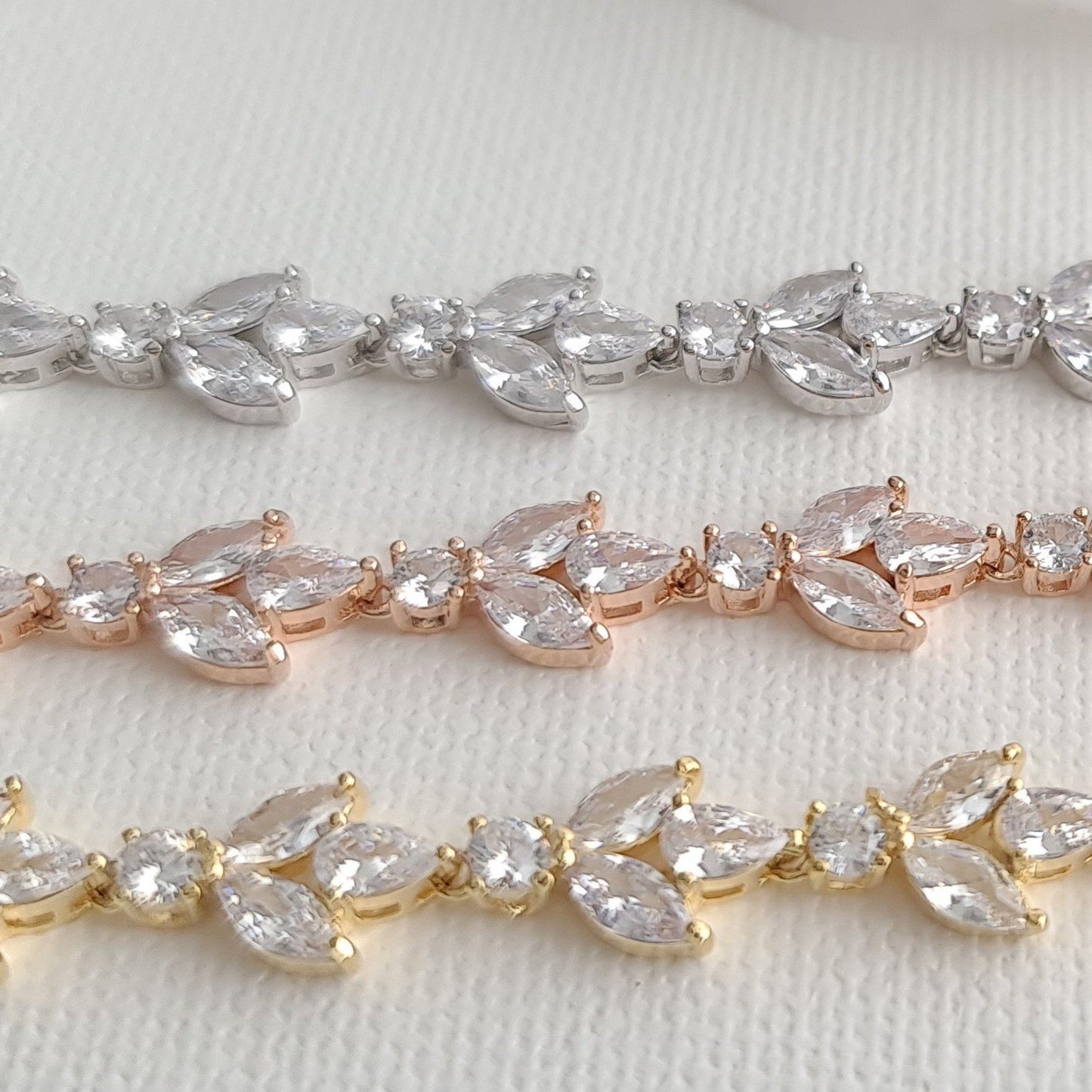 This silver bridal bracelet is available in three finishes, It is rhodium plated for a silver finish, 14K gold plated for gold-tone, and rose gold plated for rose gold, Choose the color to suit your style. This sparkling bracelet can be easily combined with another marquise, round, and teardrop-shaped jewelry designs to complete your bridal jewelry set.