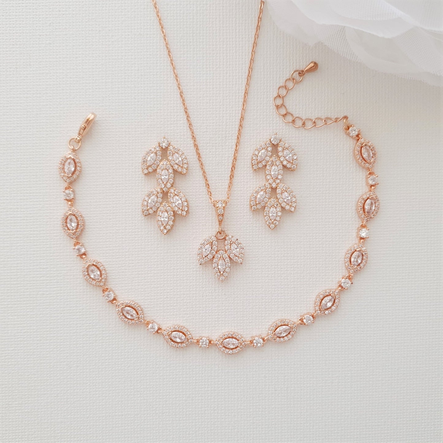 A lovely 3 piece jewelry set for brides and your bridal party. The bridal jewelry set comes with a bracelet, stud earrings, and necklace and is available in three finishes of silver, gold, and rose gold tones.