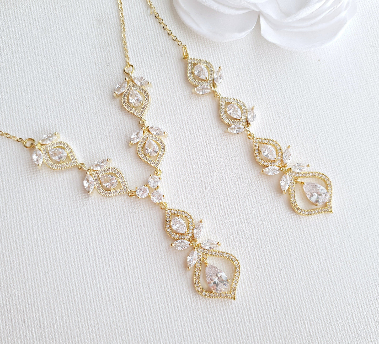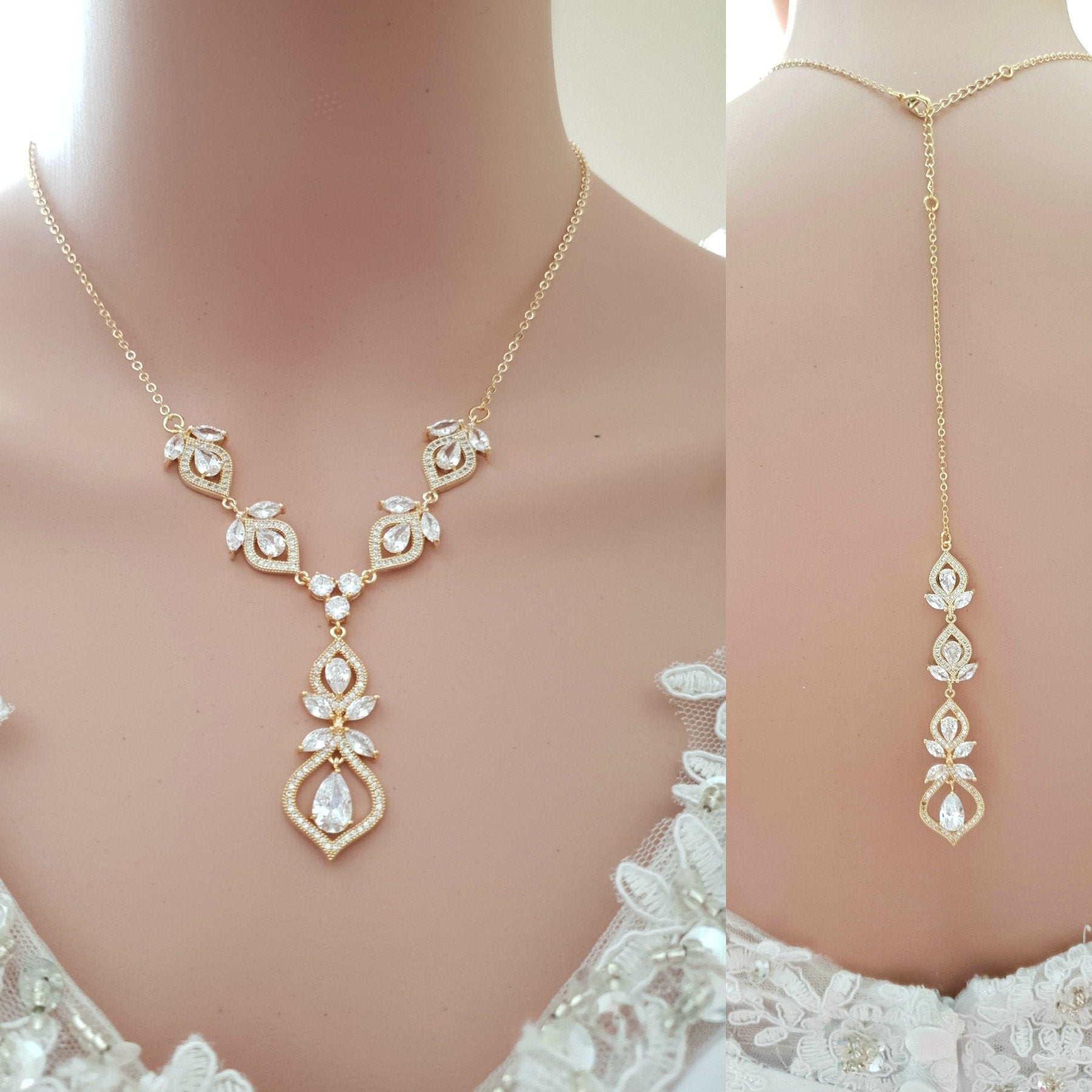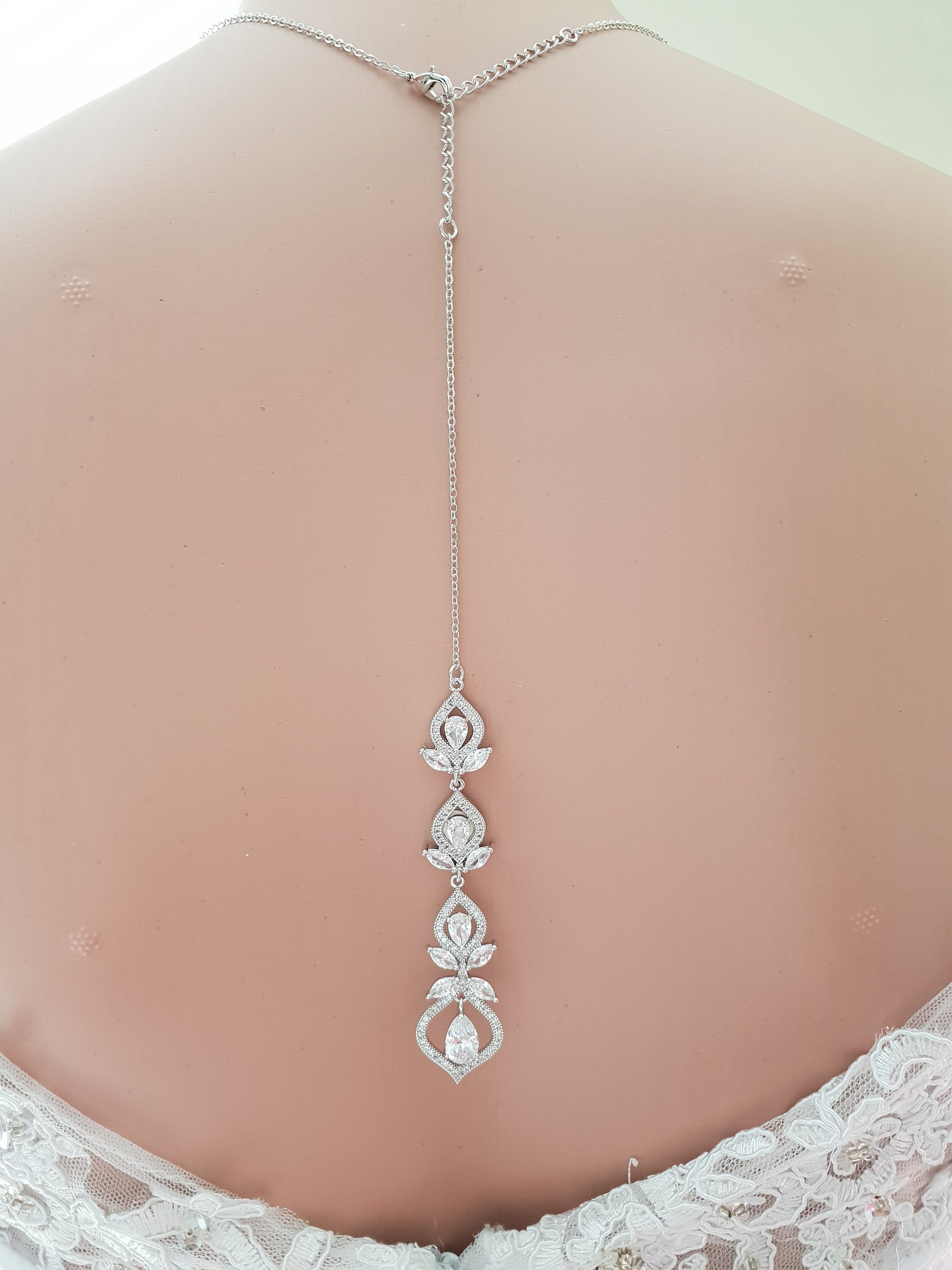 The crystal wedding backdrop necklace is also available with a matching backdrop of 8 inches. The material used is rhodium plated brass. The Meghan back necklace is available in a silver/rhodium finish, rose gold finish and 14k gold finish.