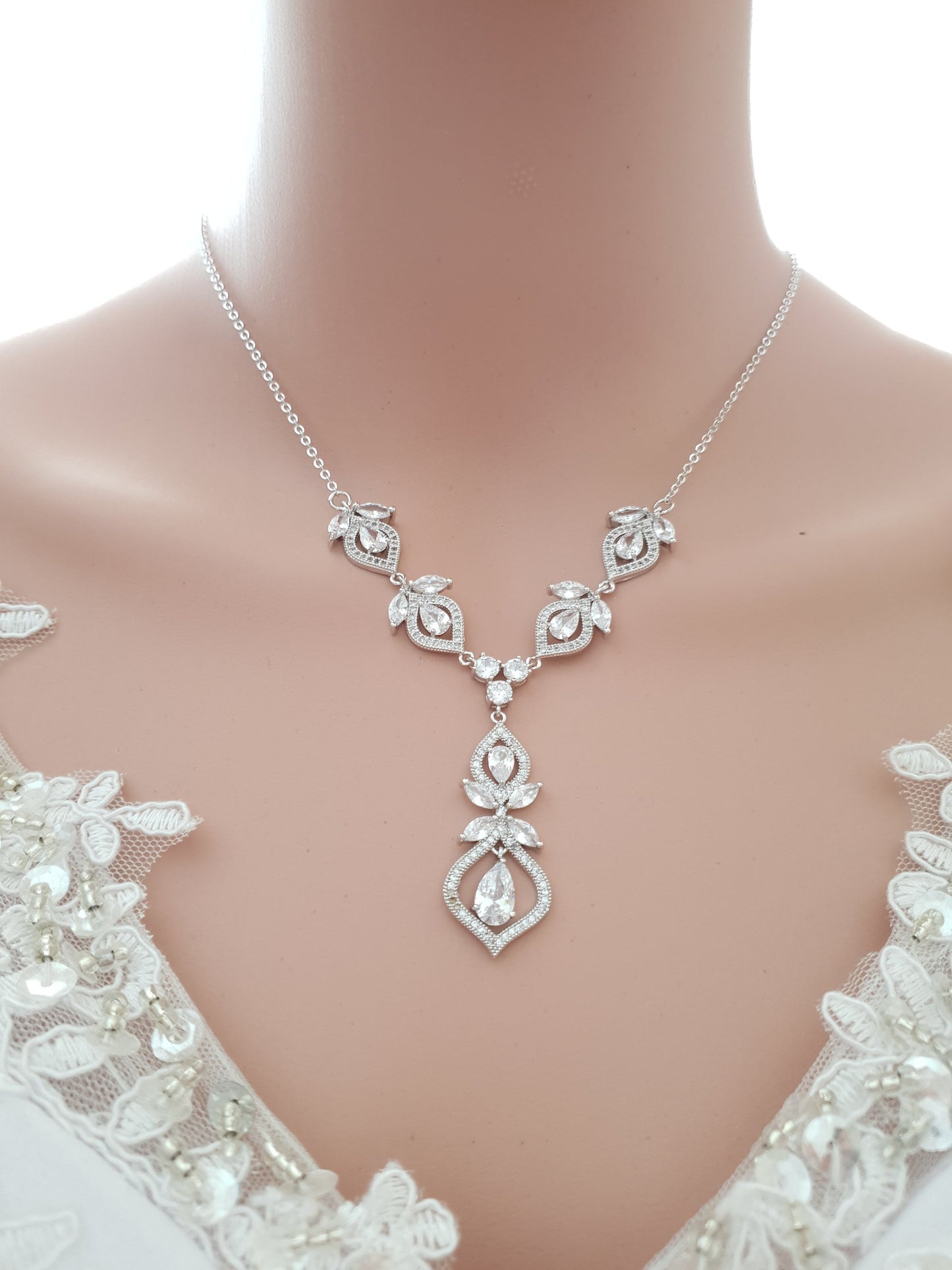 I have created the necklace with a crystal drop which has a central clear faceted teardrop cubic zirconia which is in a free drop setting. It is surrounded by prong set little sparkly cubic zirconia crystals. This is paired up with matching crystal beads to make up the necklace in front. The necklace in front is available in three different lengths end to end of 16", 18" and 20".
