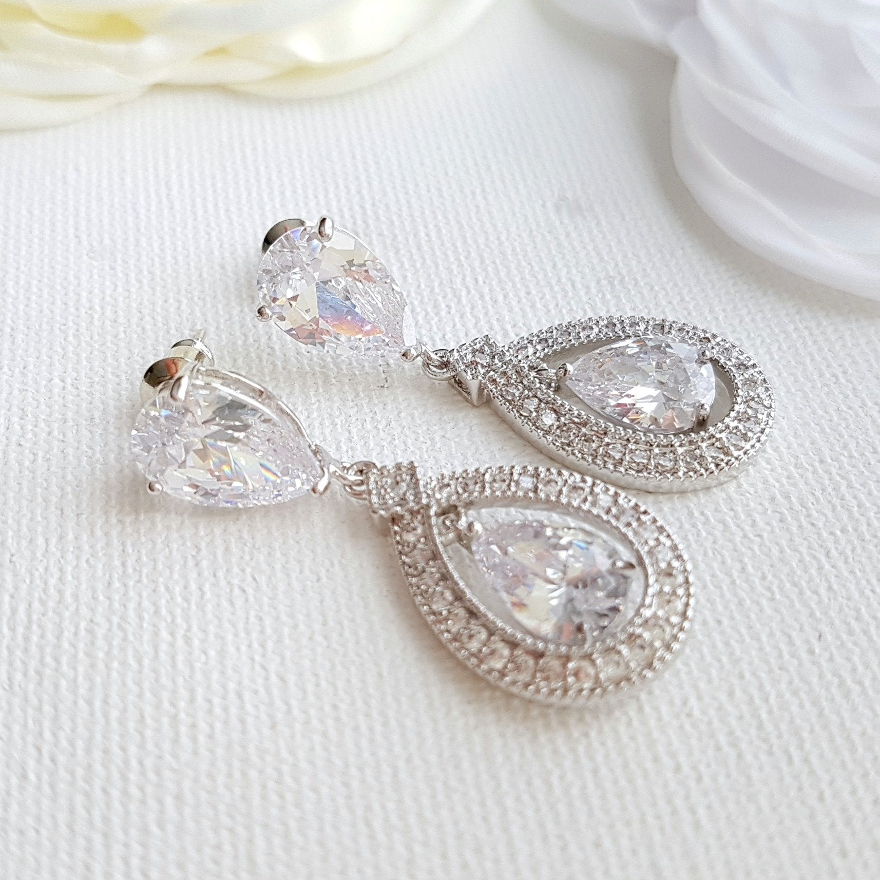 The Sarah crystal drop bridal earrings in a silver finish is a shimmering pair made with clear cubic zirconia teardrop crystals in a halo style. These wedding earrings are delicate and romantic looking, they are a great length at just under 1.5 inches. They have a lovely sparkle and are comfortable for long wear.