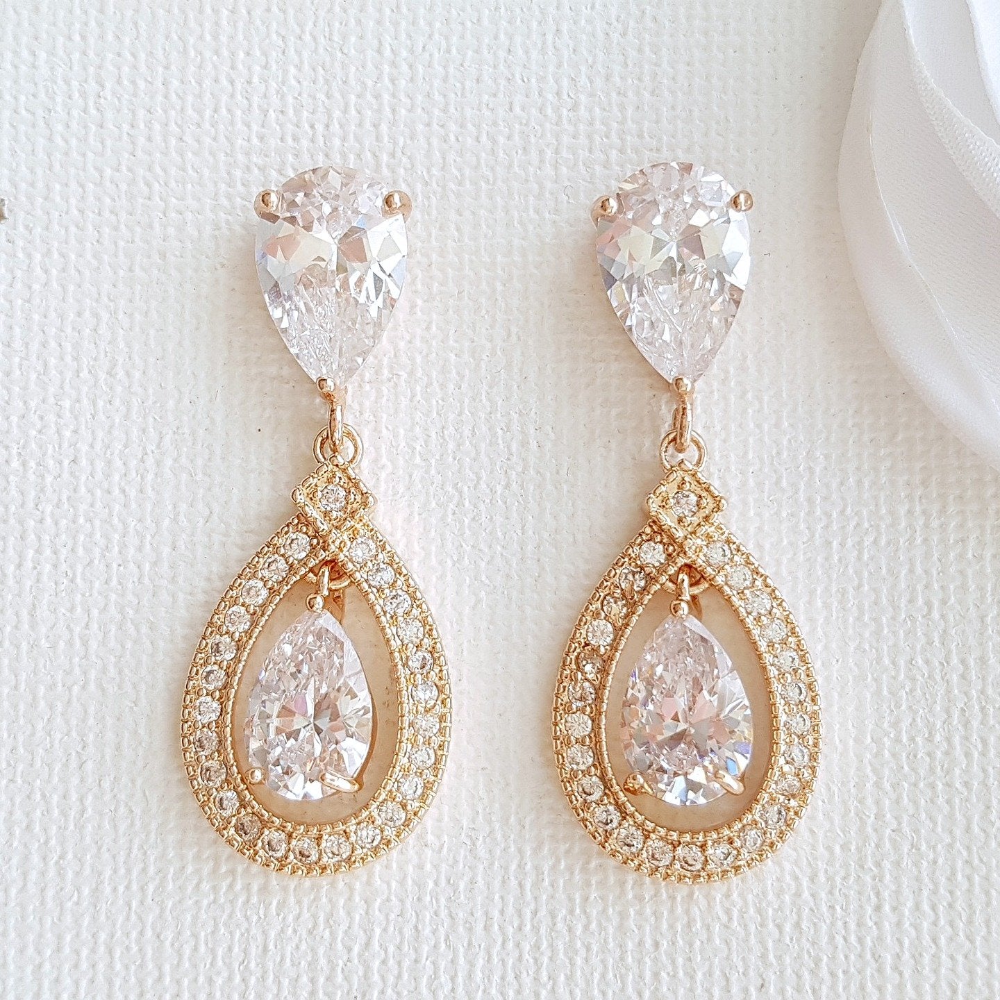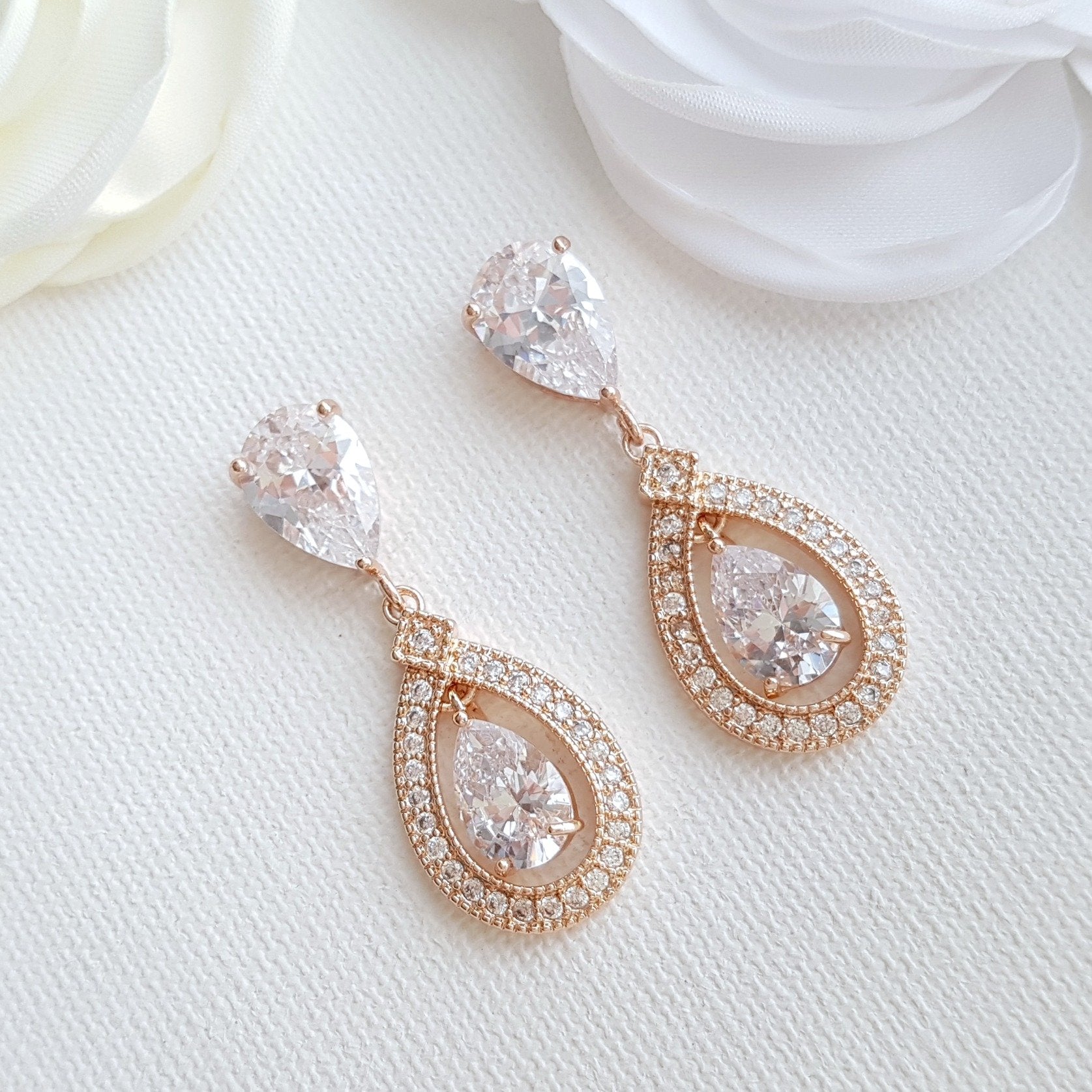 I have created the earrings with cubic zirconia teardrops with a central free swinging smaller teardrop and set in a halo style. I have put that onto clear CZ teardrop ear posts. All material used is rhodium plated brass. Also available in the 14k gold finish and rose gold finish. The Measurement of the earrings is approx 1 3/8 inches or 3.5 cms and 14mm wide.