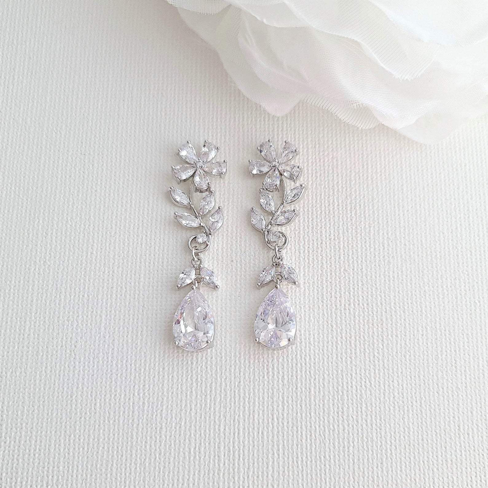 Bridal & Wedding Earrings with CZ Crystal Flower & Leaf