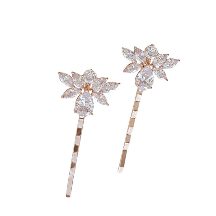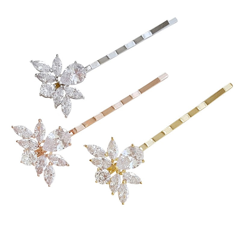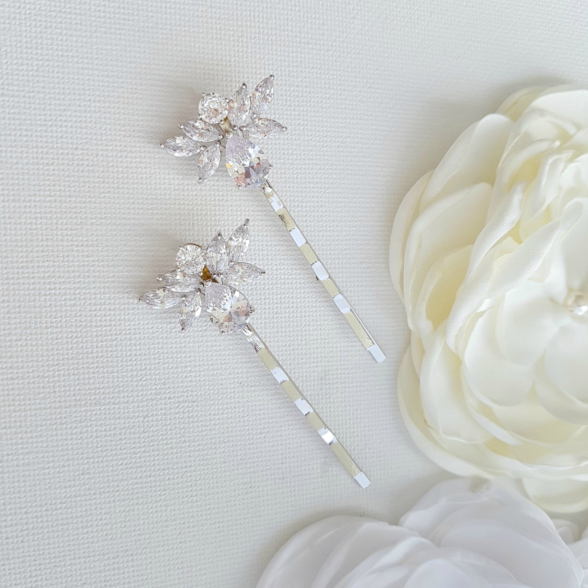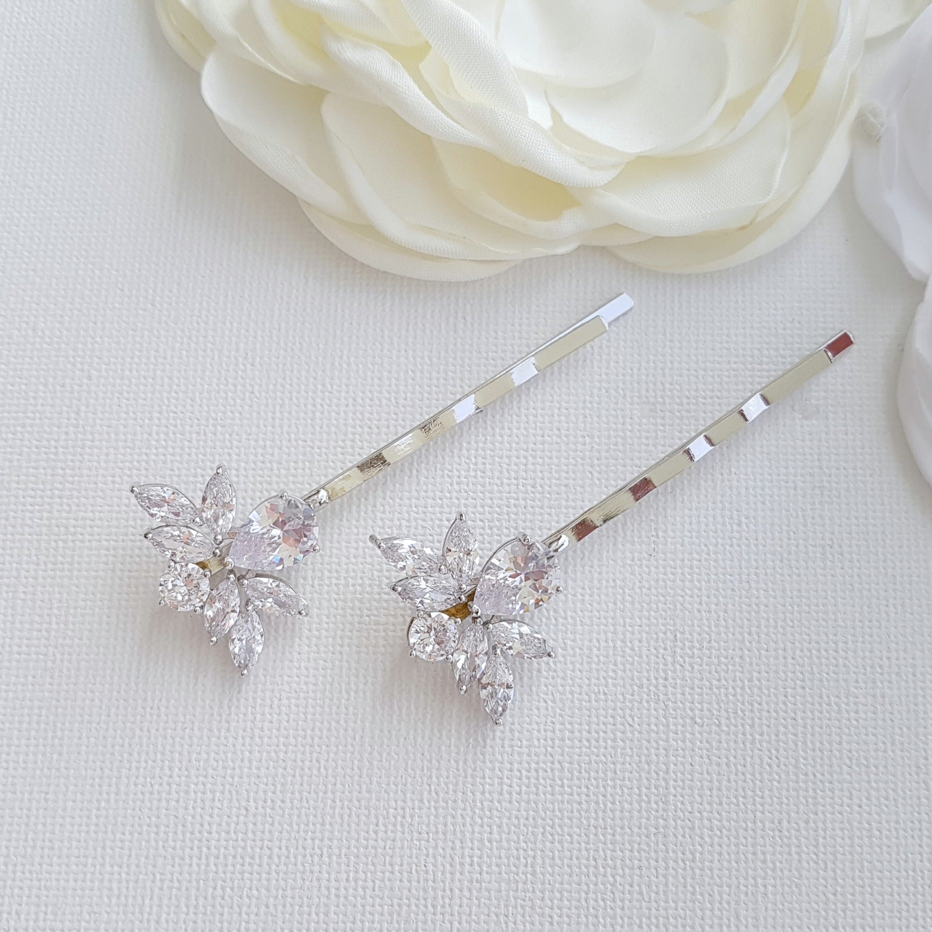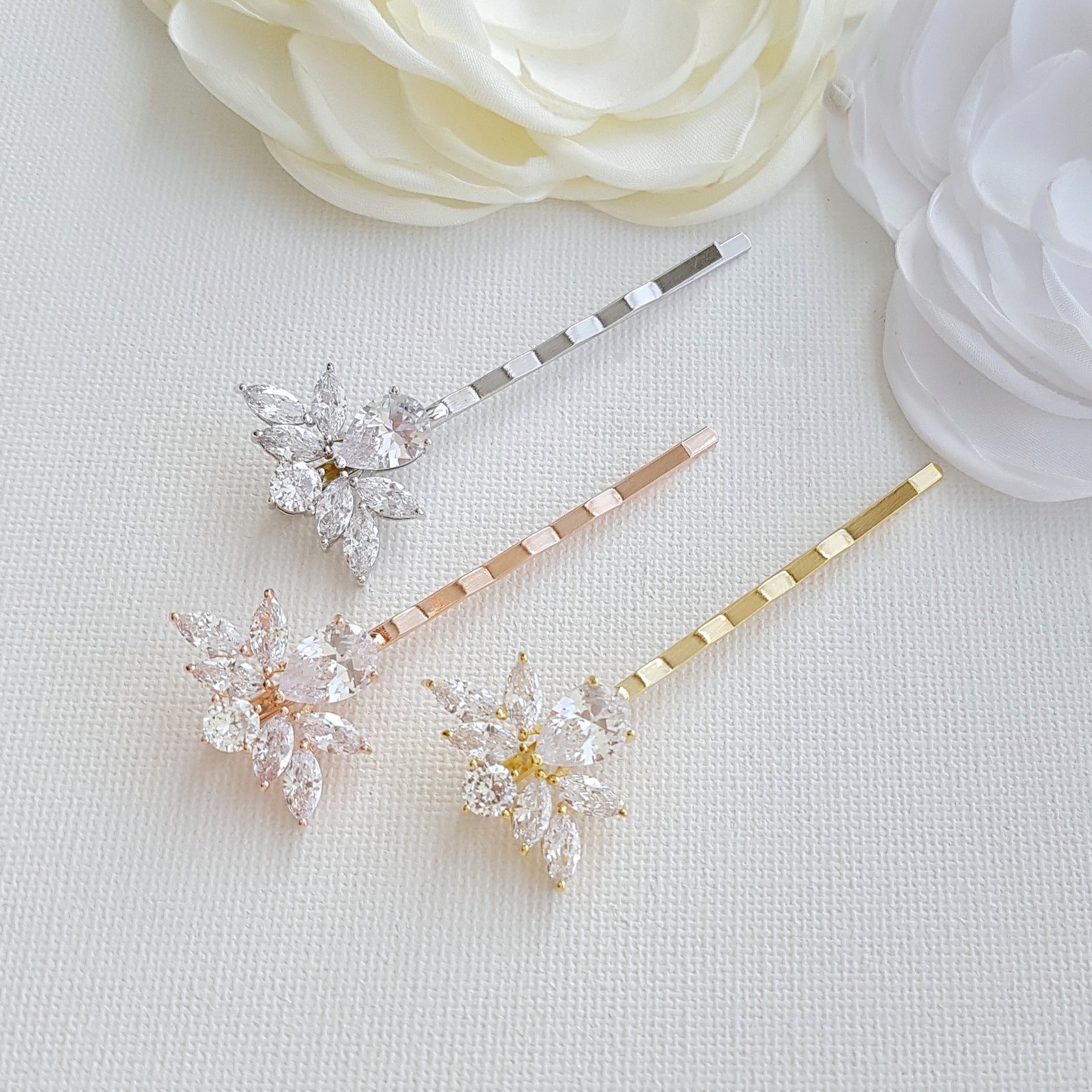 These pretty crystal bridal hair pins are made with sparkling top quality cubic zirconia. They also are available embellished with pearls in white/ light ivory or cream pearls. The bobby pins are available in a silver/ rhodium finish, rose gold finish and 14k gold finish.