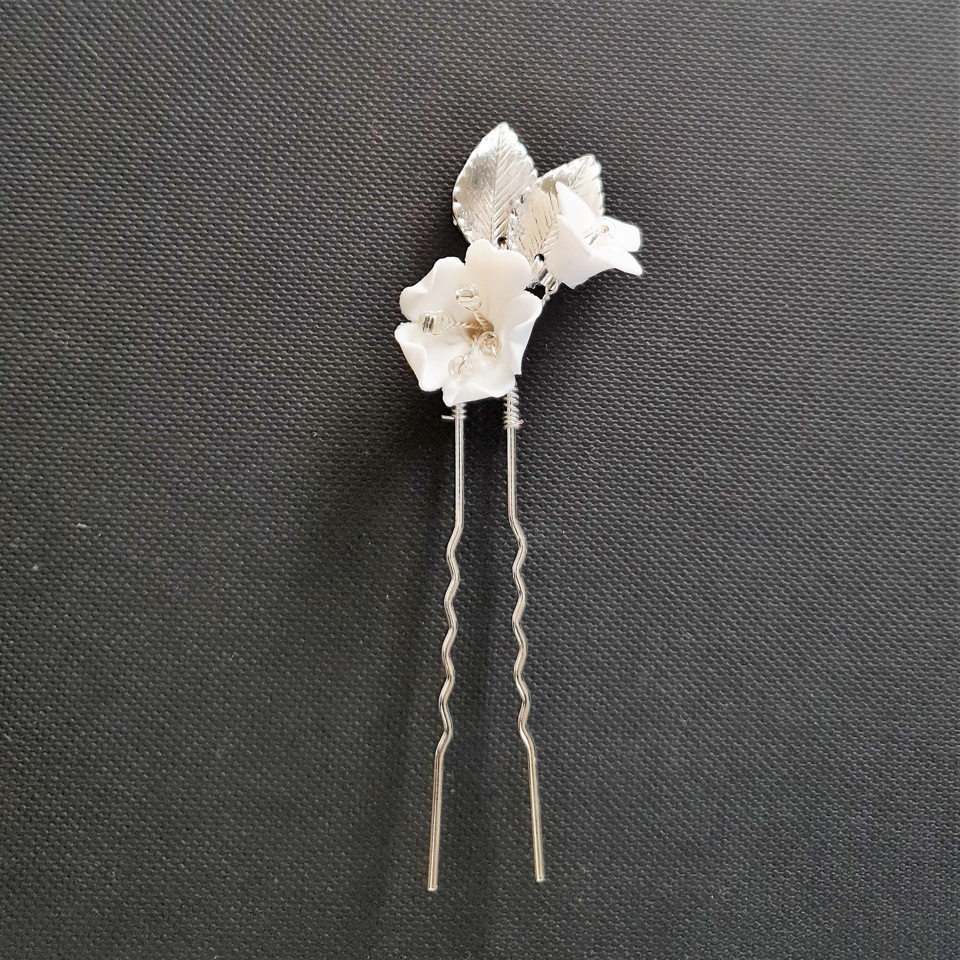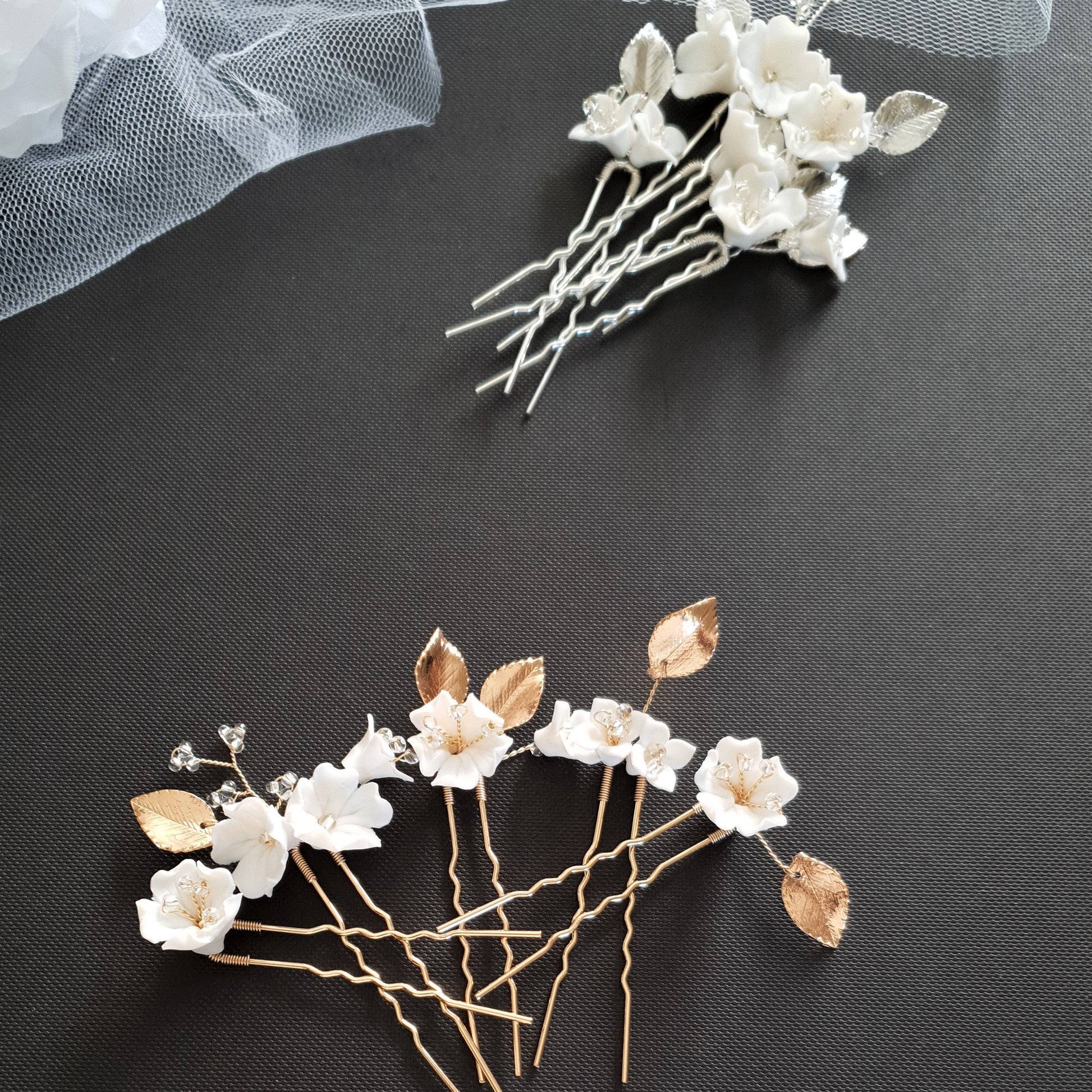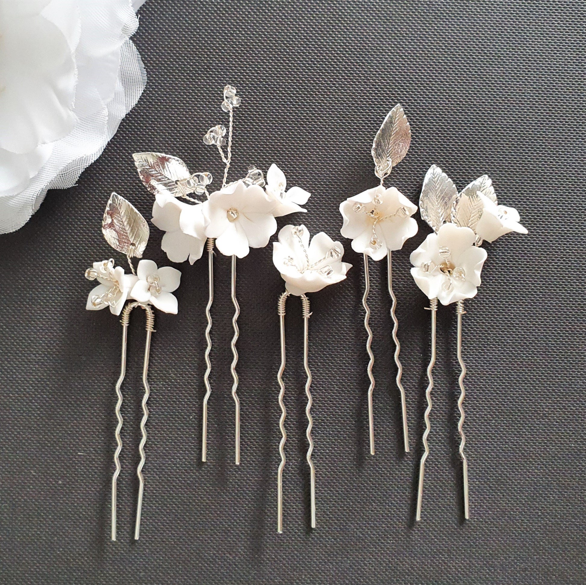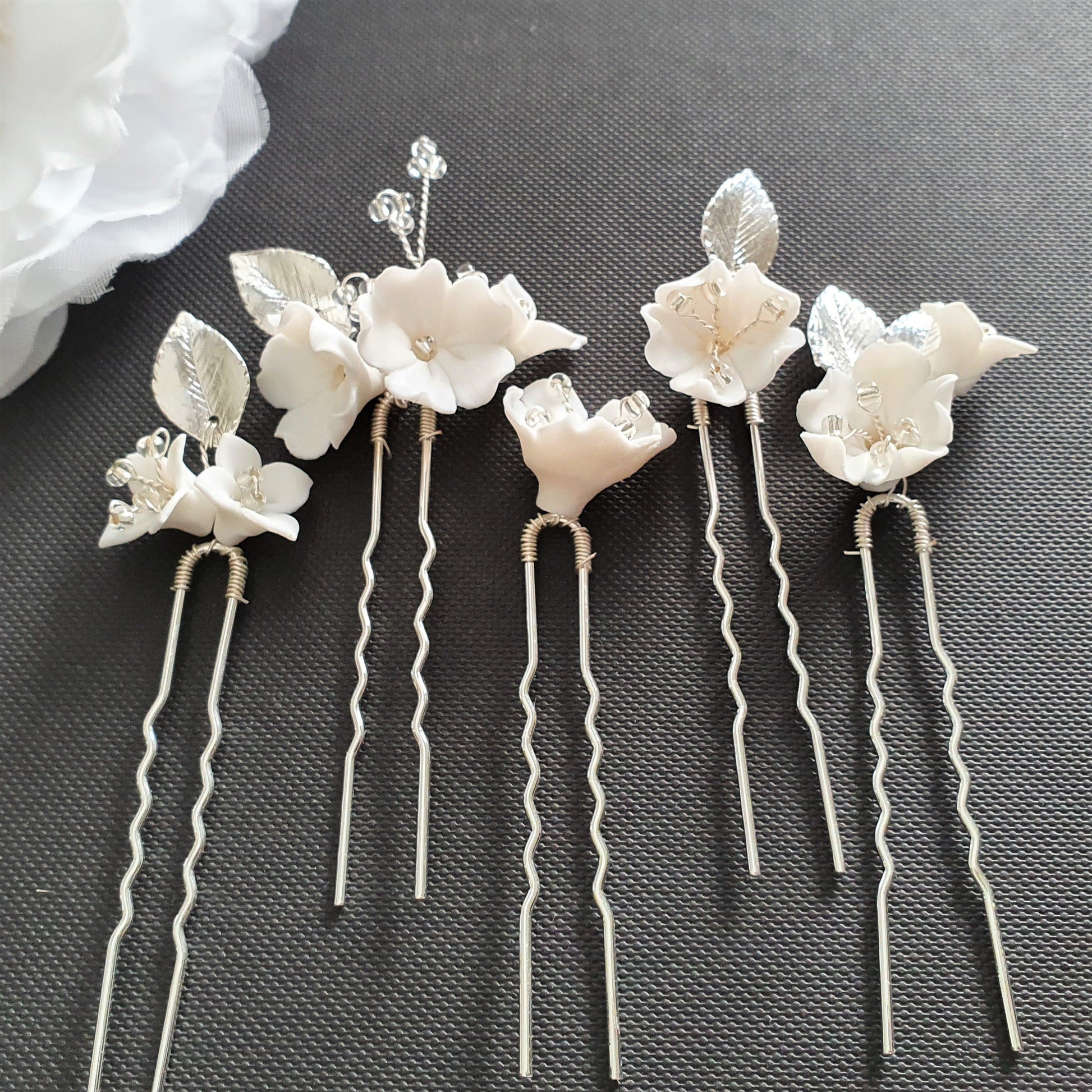 Bridal Hair Pins with White Flowers & Silver Leaf, 5 Pcs Set