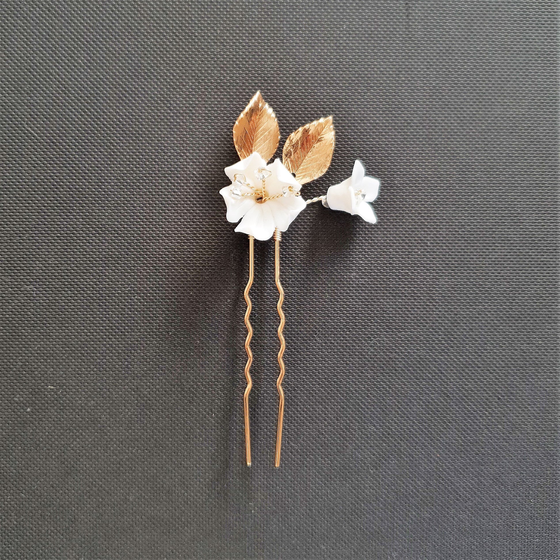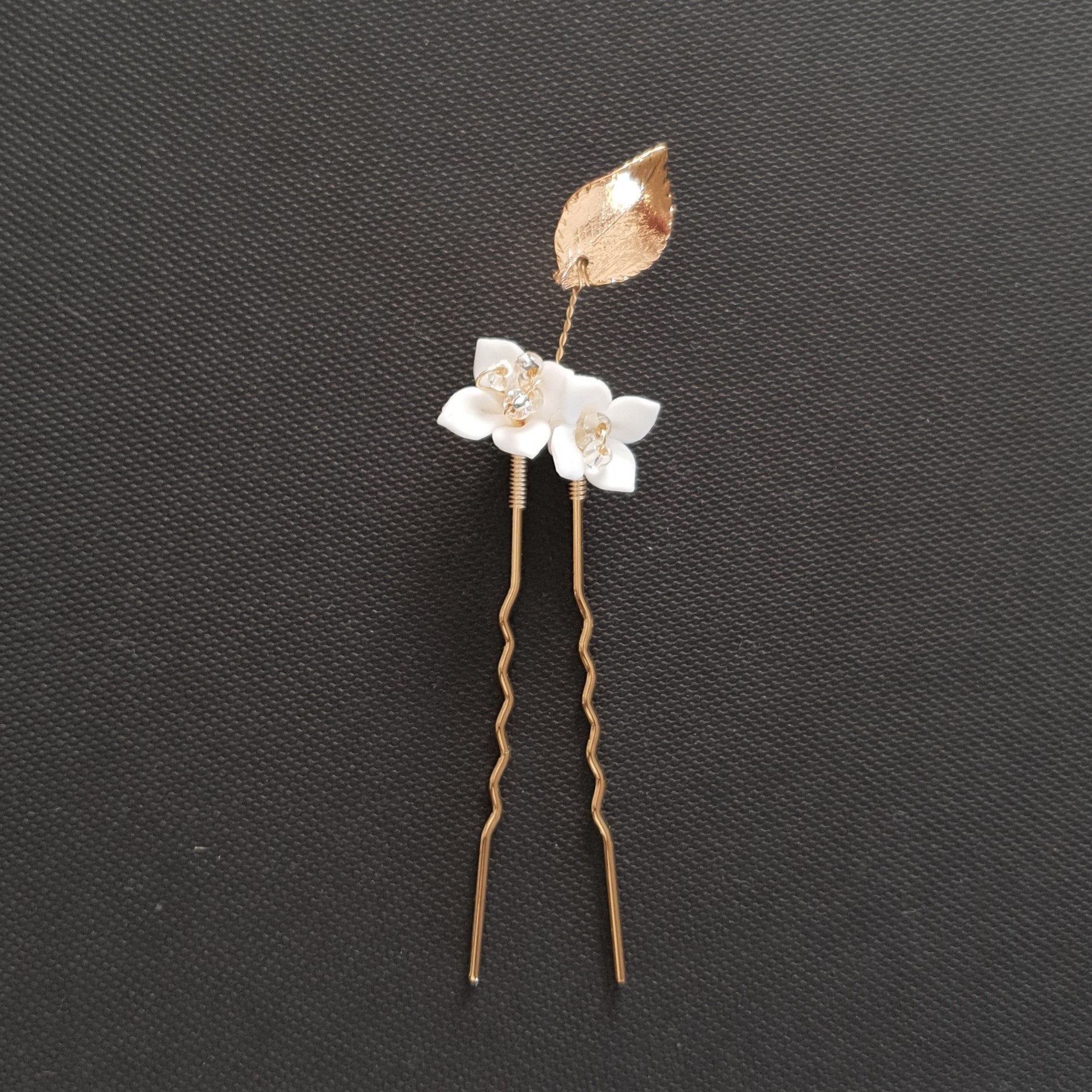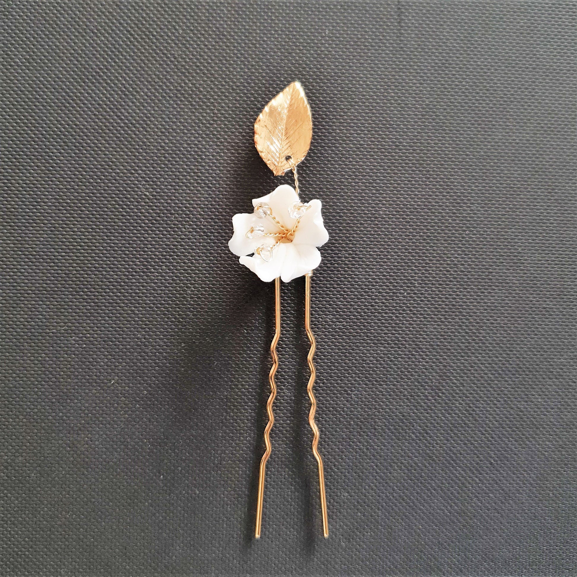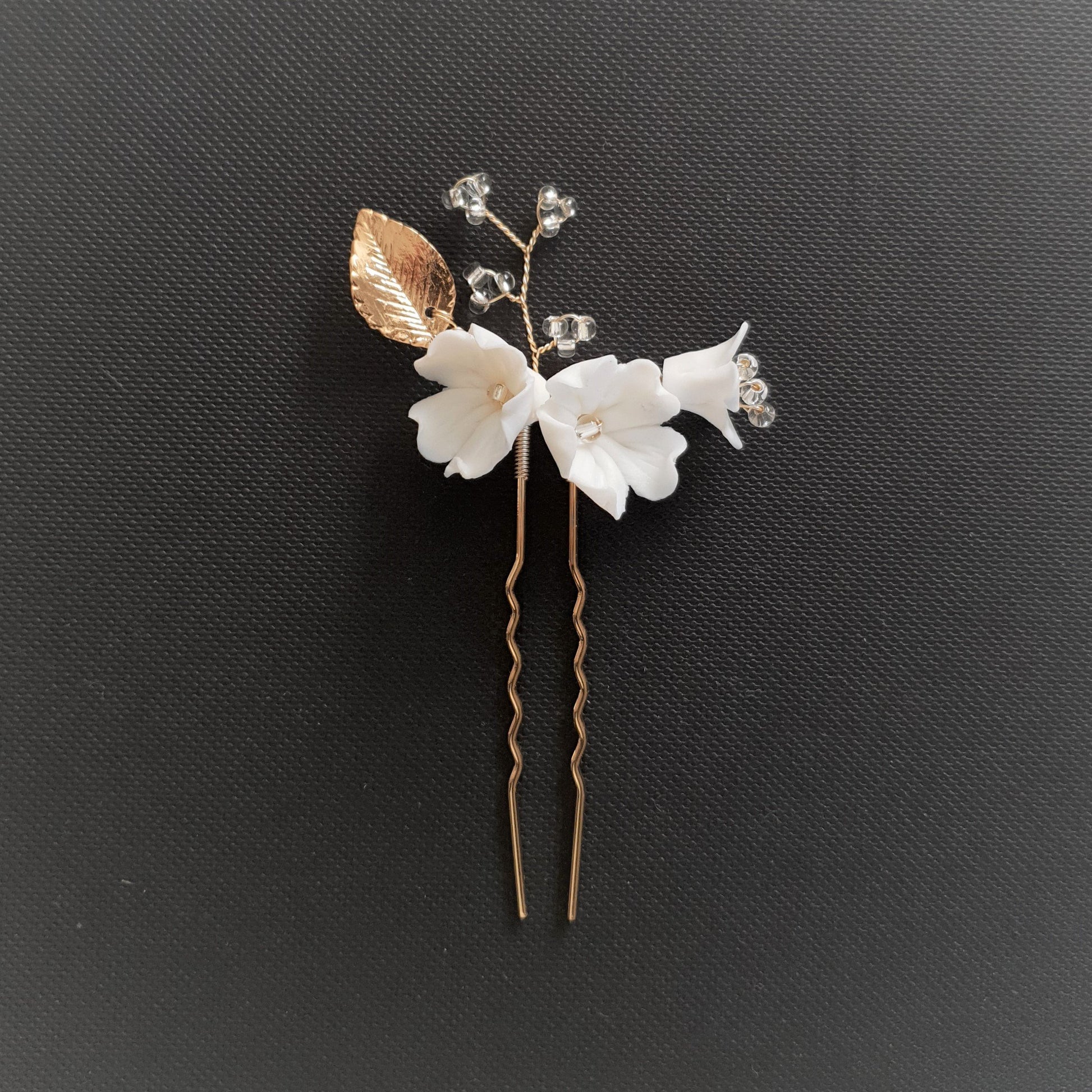 If looking for a minimalistic look with your wedding hair accessories, these bridal hair pins with white flowers are perfect.